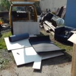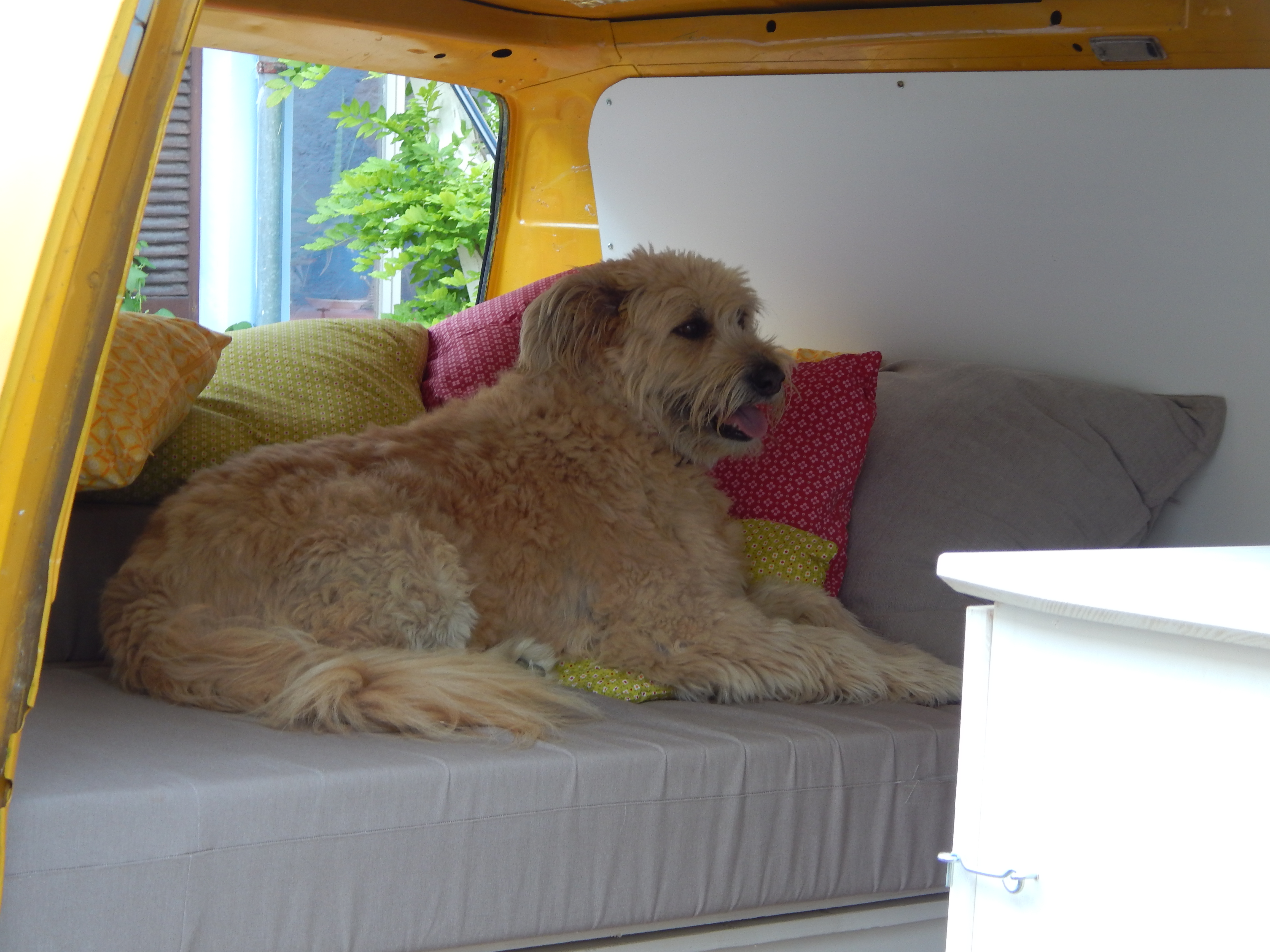 Alubutyl für die Dämmung, X-treme Isolator, 2 cm dick und selbstklebend, 7-fach und 5-fach geleimte Holzplatten, MDF-Platten, 2 Packungen Parkett, Parkettunterlage, Alukanten, Metallbohrer und Schrauben in verschiedenen Größen und Ausführungen, Scharniere, Eckverbindungen, 2 Gasfedern, Rostumwandler, Spezialspachtelmasse für Autos, Lackdosen, 2 Kopfstützen, Stoffe für die Inneneinrichtung, Haken in verschiedenen Größen, eine Kommode, maßgefertigte Matratzen, strapazierfähiger Stoff für die Überzüge, Fangnetz zum Abtrennen des Innenraums (wegen meiner Hunde unbedingt nötig), das gabs nur als Meterware, Spannseile und passende Haken, diverse Beilagscheiben, Kissen, Decke, Campinggeschirr, Campingkocher und -lampe, Campingtisch, 2 Hocker, Lackfarbe, Spiegel, diverse Dinge zum Verstauen, Wasserkanister,… und sicher noch einige Dinge mehr…