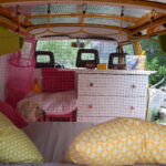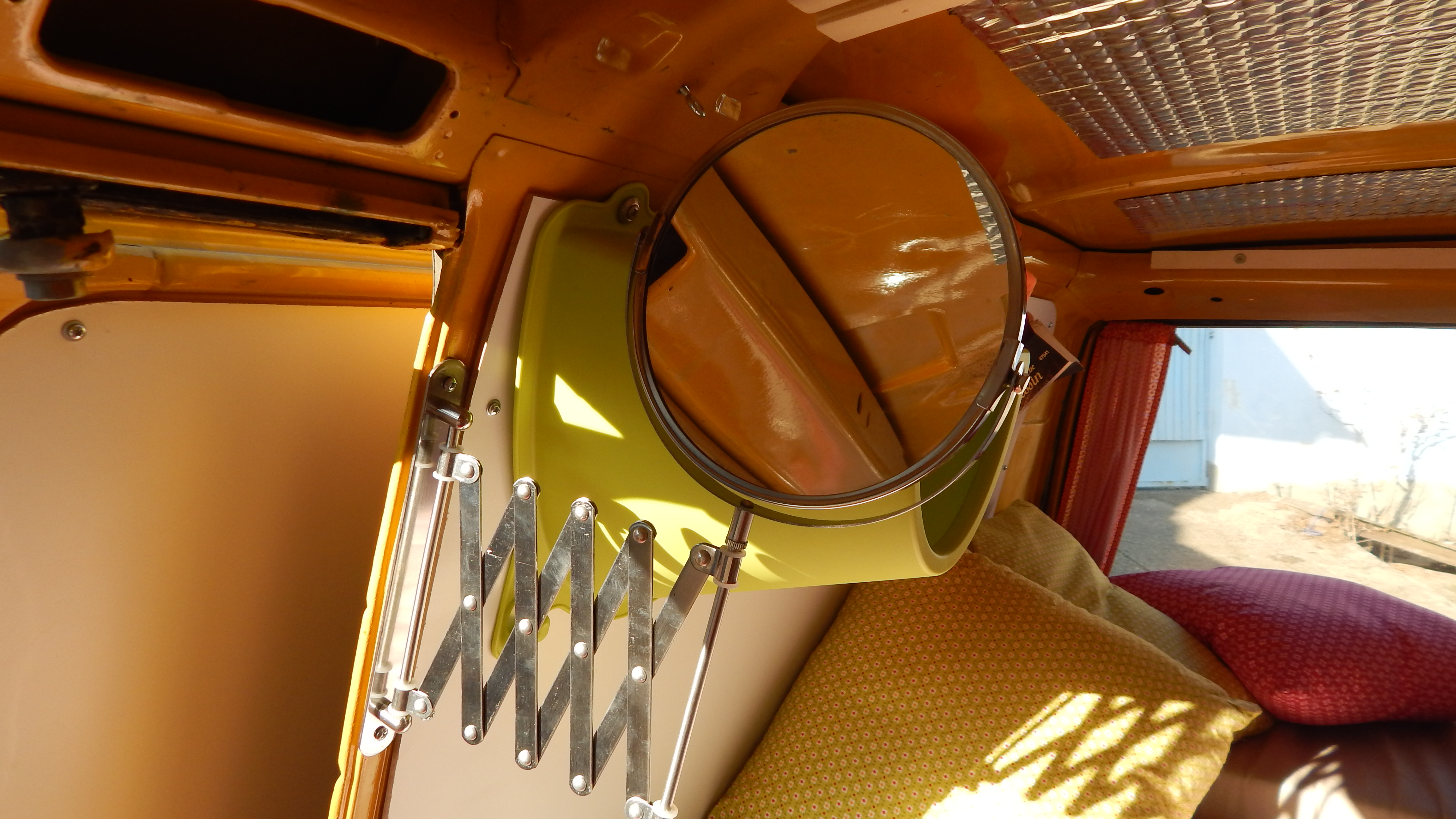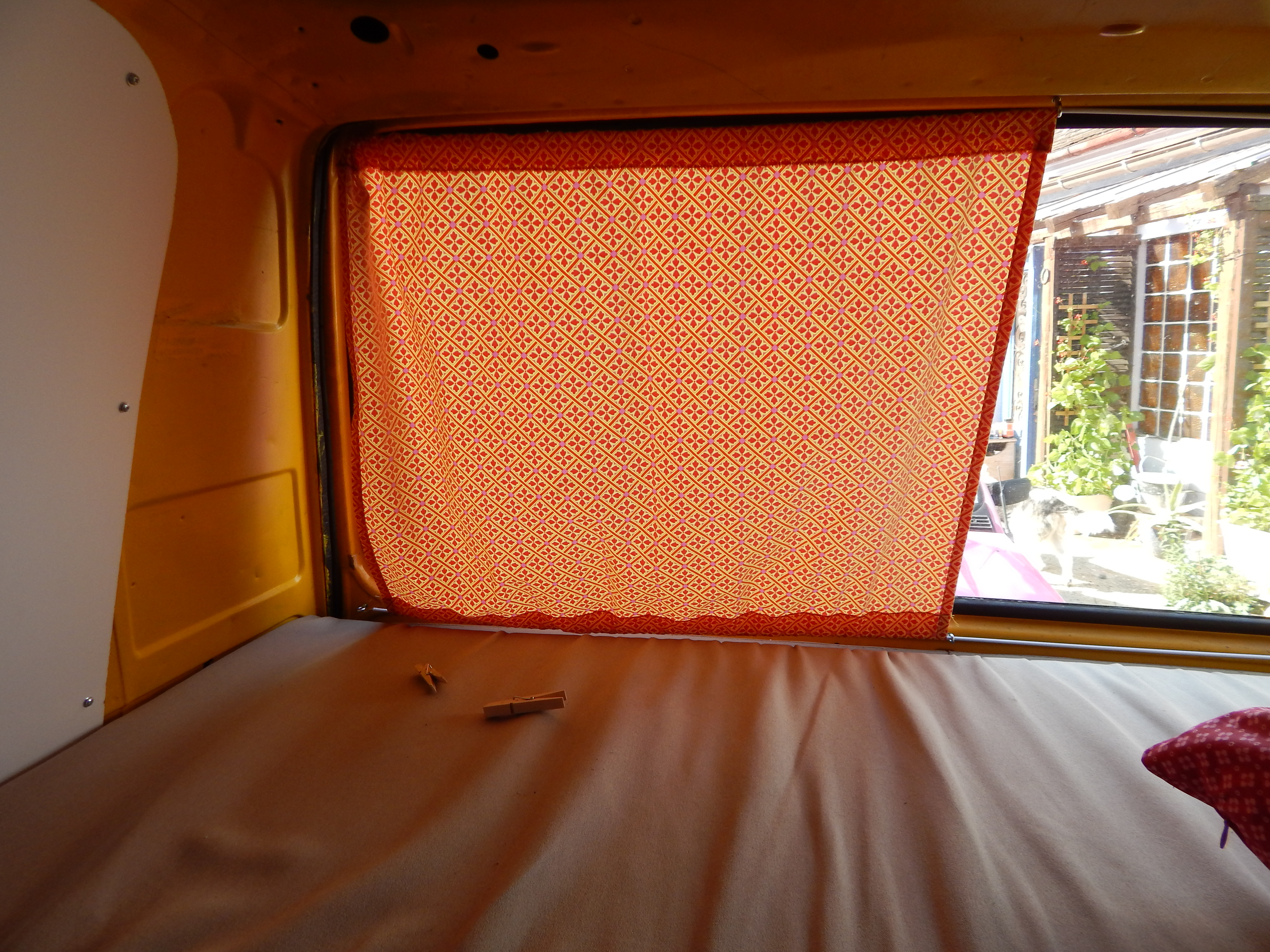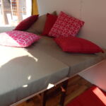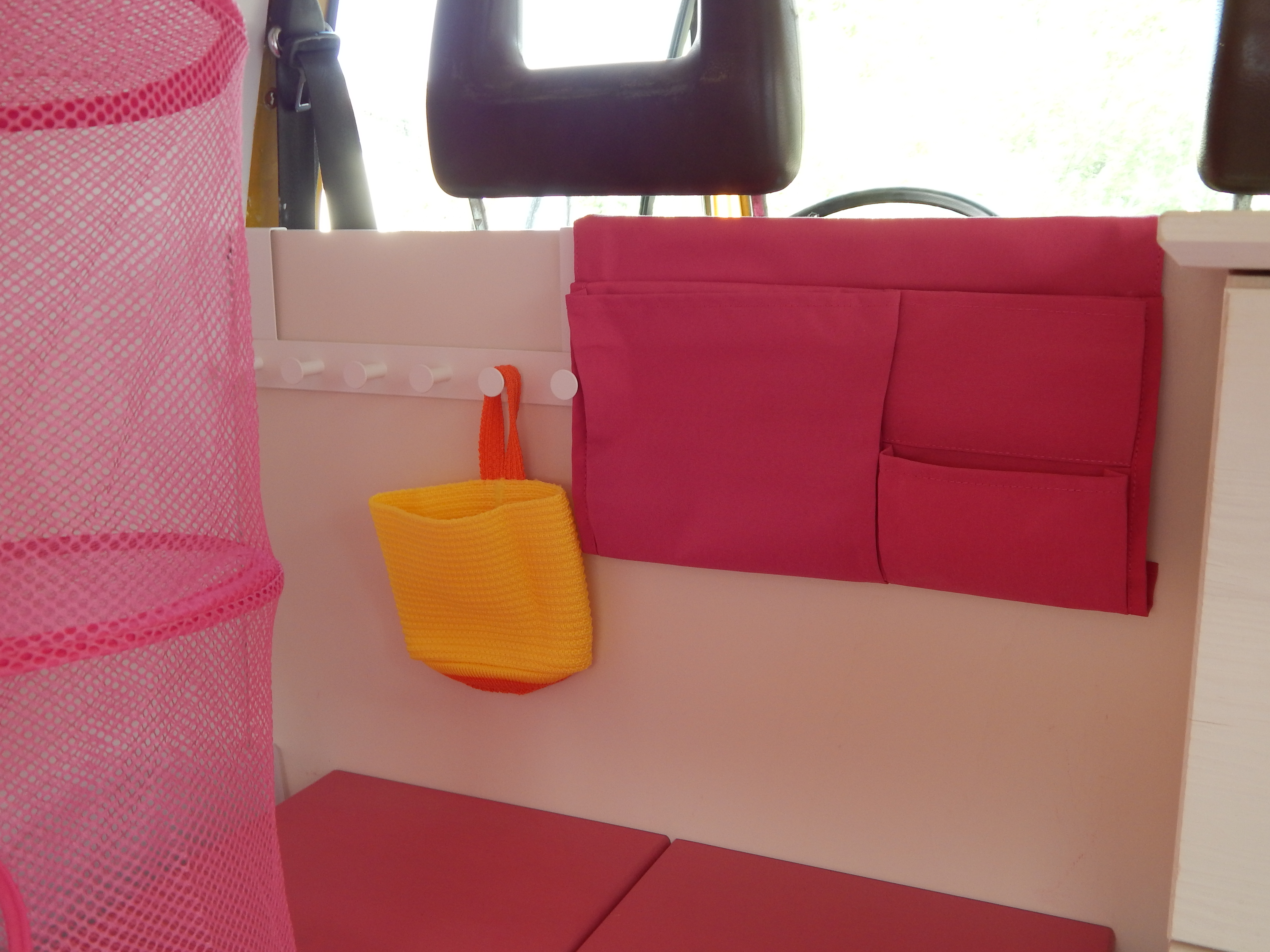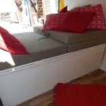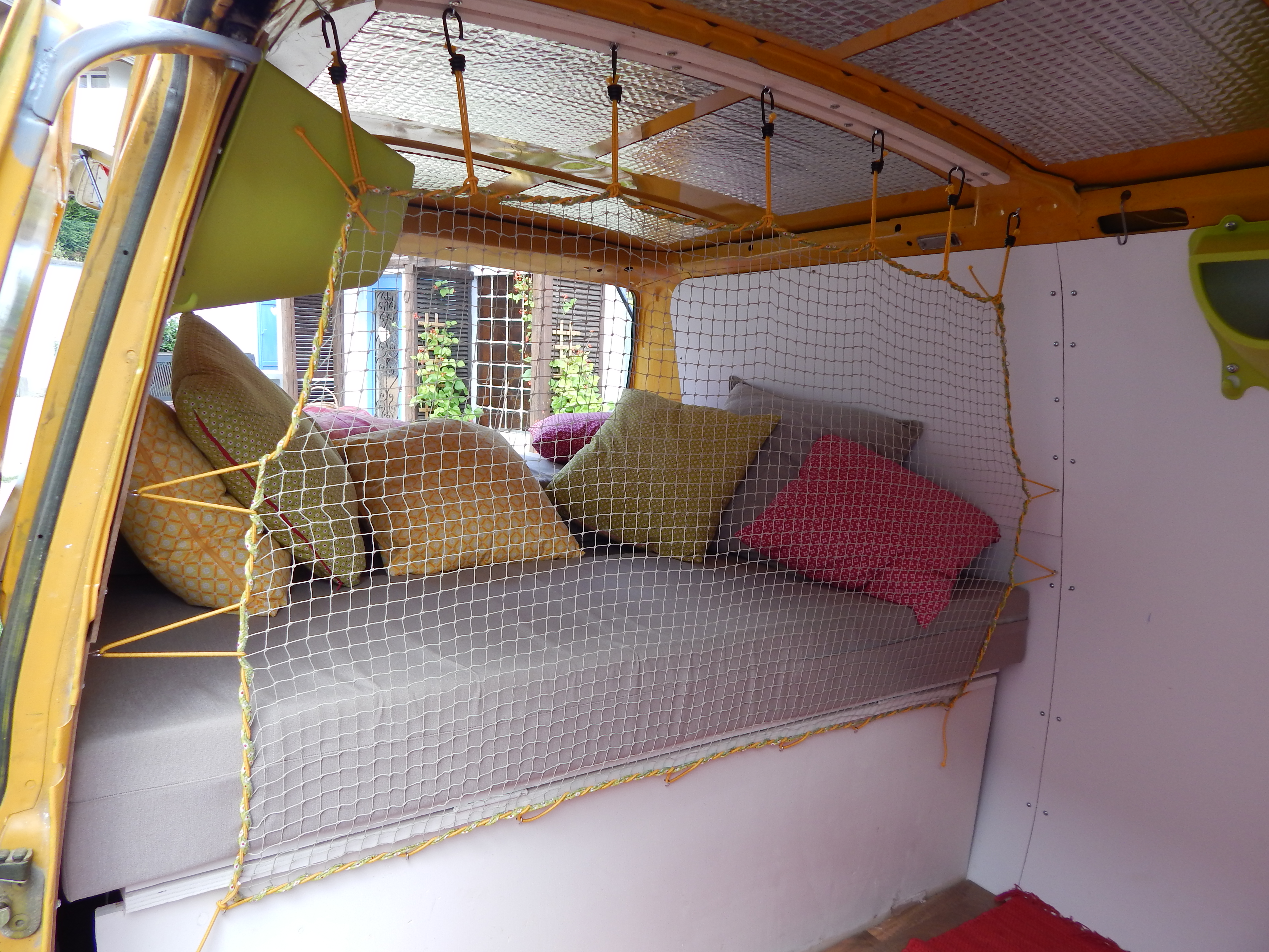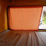 Die drei Matratzen wurden online auf Maß bestellt. Der Bezug, den ich selbst genäht habe, kann abgenommen und gewaschen werden. Er ist besonders strapazierfähig und wasserabweisend. Die Kissen wurden mit neuen Stoffen bezogen. Für das hintere große Fenster wurde ein Vorhang genäht. Befestigt wurde er mittels Vorhangseil und Haken. Für die Montage der Haken der Vorhänge wurden Nieten in den Bus genietet.