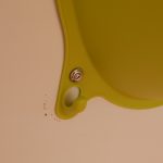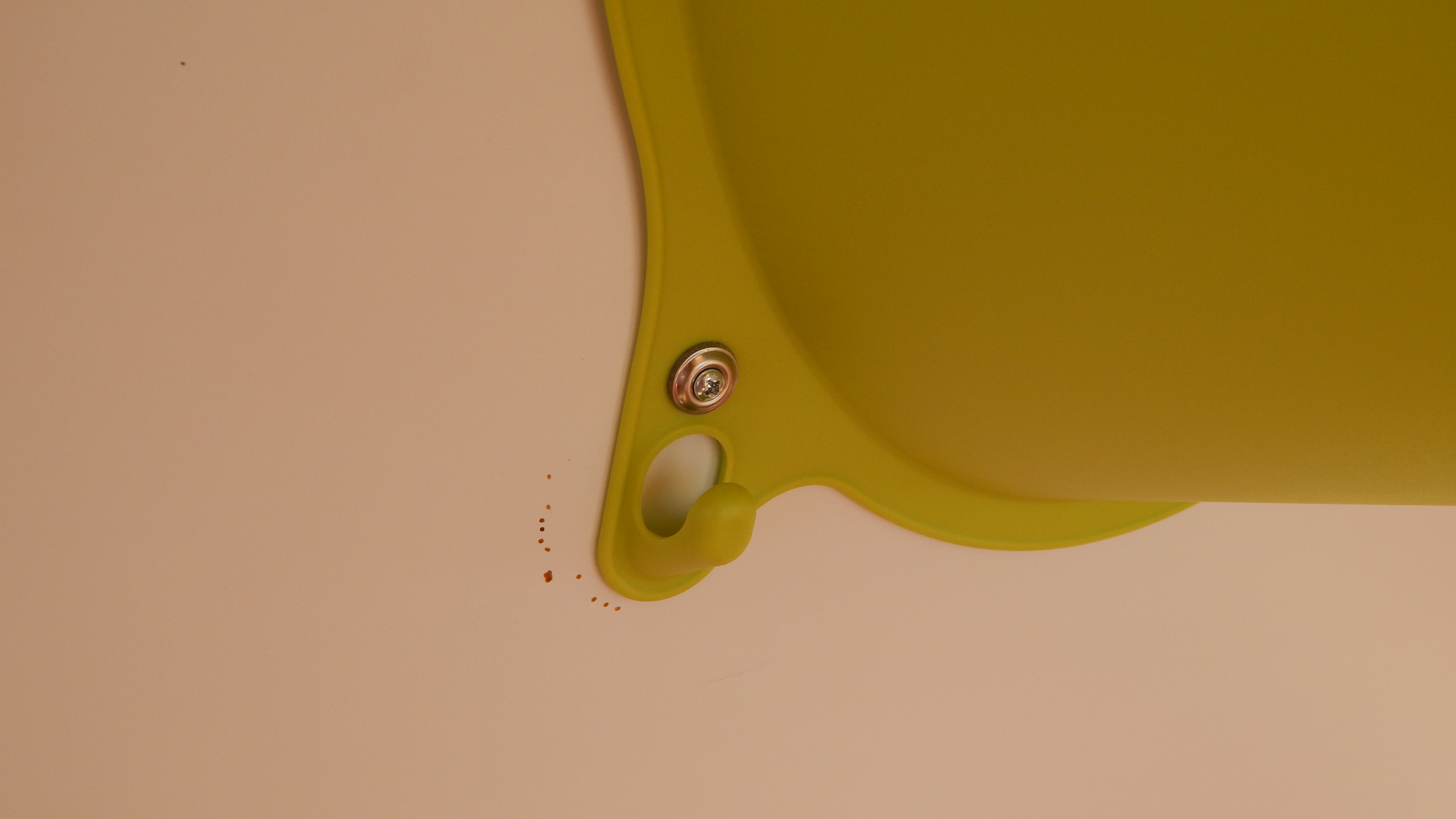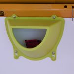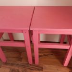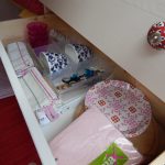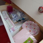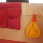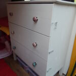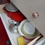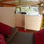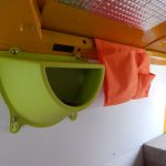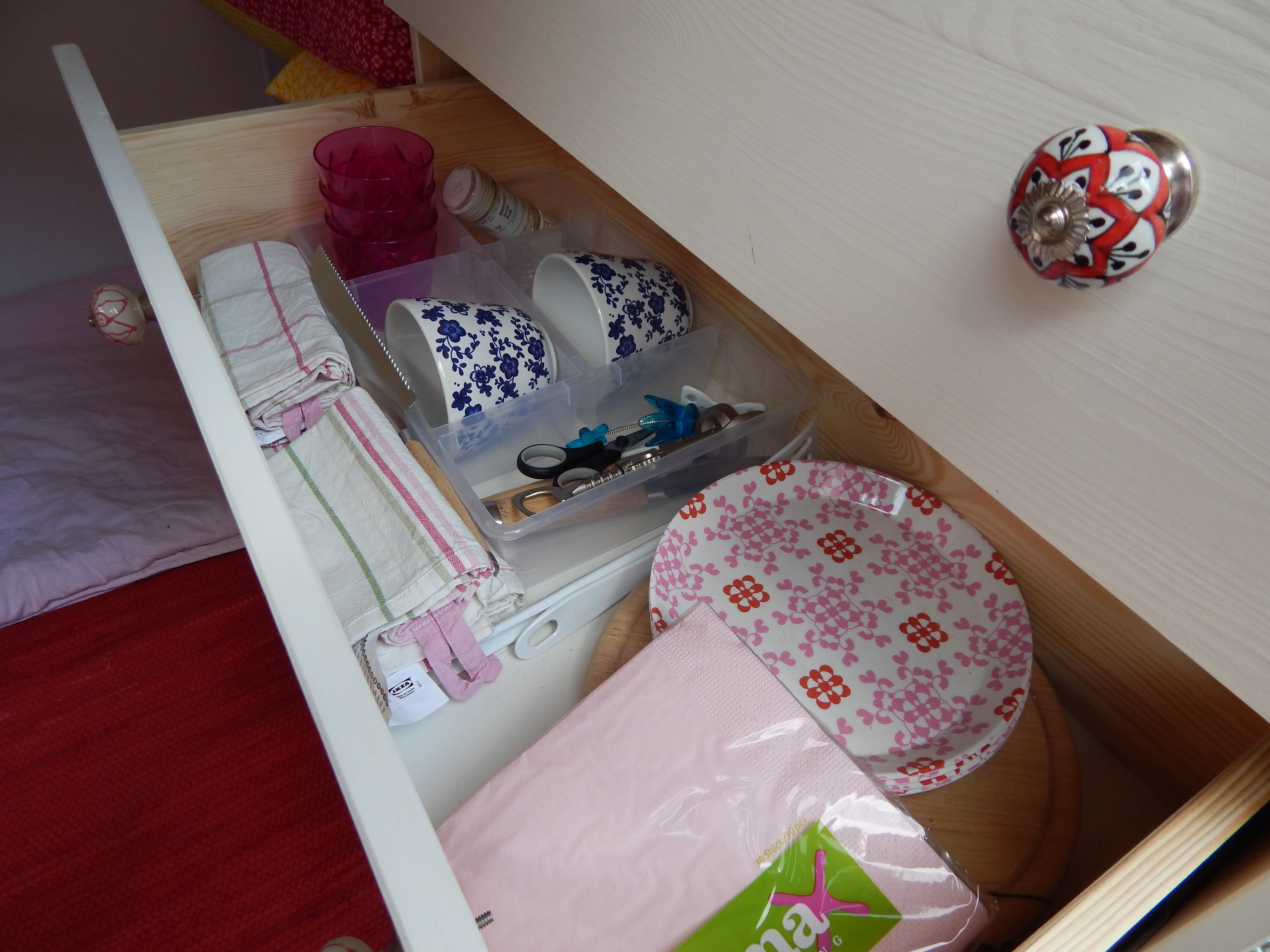 Als Kommode dient eine einfache Ikea-Kommode. Die Original-Holzknöpfe wurden durch Porzellanknöpfe ersetzt. Die Kommode wurde weiss lackiert und am Boden sowie gegen die Trennwand verschraubt. Damit die Laden während der Fahrt nicht auf- und zugehen, wurden sie einzeln mit Haken gesichert. Die Hocker, die sowohl als Sitzgelegenheit für draußen als auch als Stütze für das Klappbett dienen, wurden ebenfalls lackiert. Damit sie während der Fahrt gesichert sind, wurden an die Trennwand gebogene Halterungen geschraubt, die Hocker werden einfach während der Fahrt dort hineingeschoben. Ebenfalls an die Wand wurden die grünen Nasen von IKEA geschraubt, sie dienen zur Aufbewahrung.