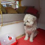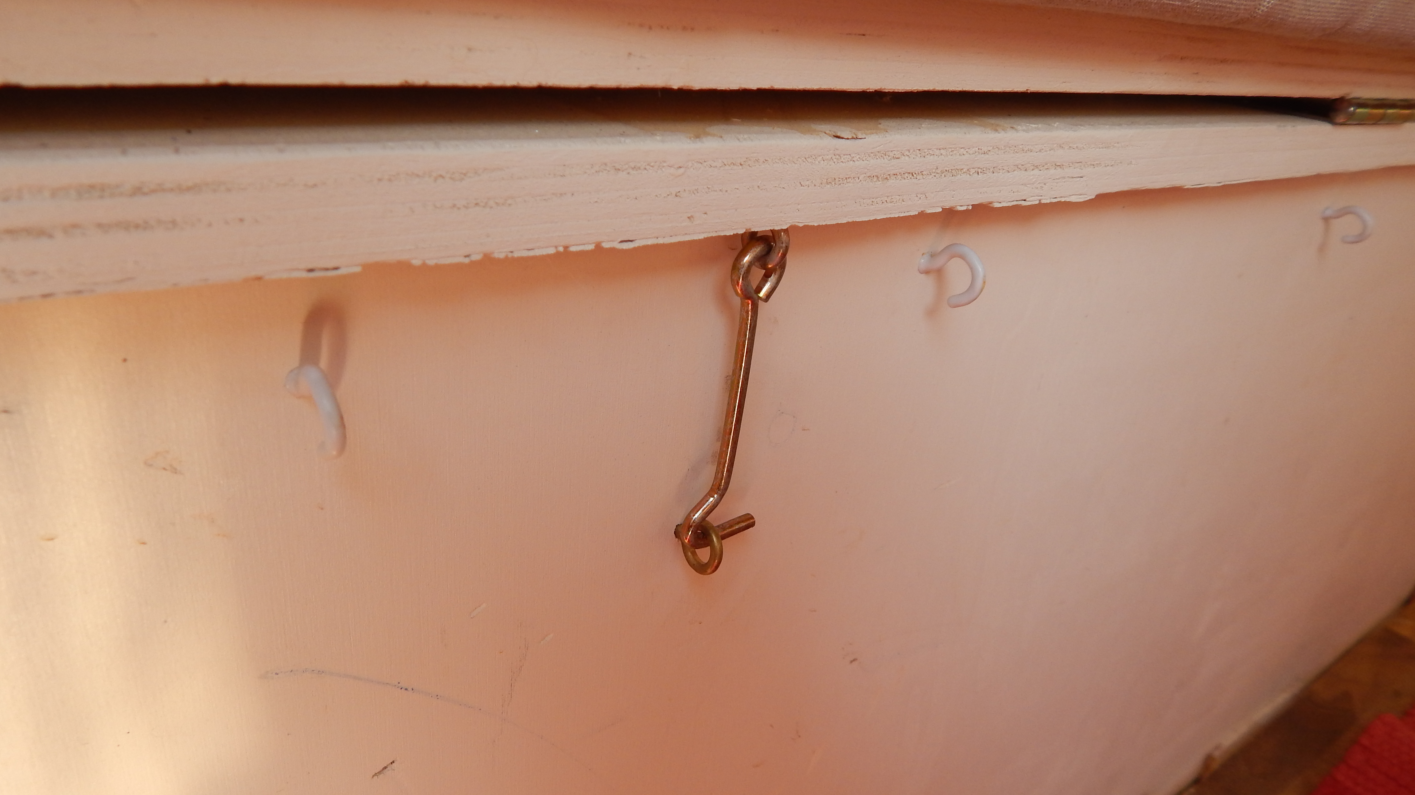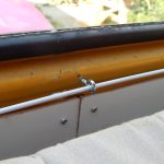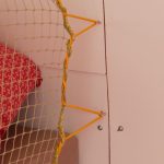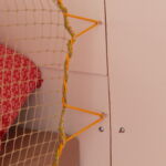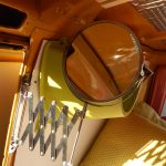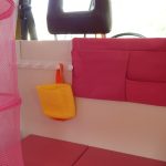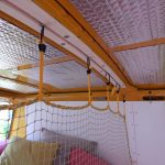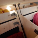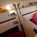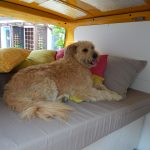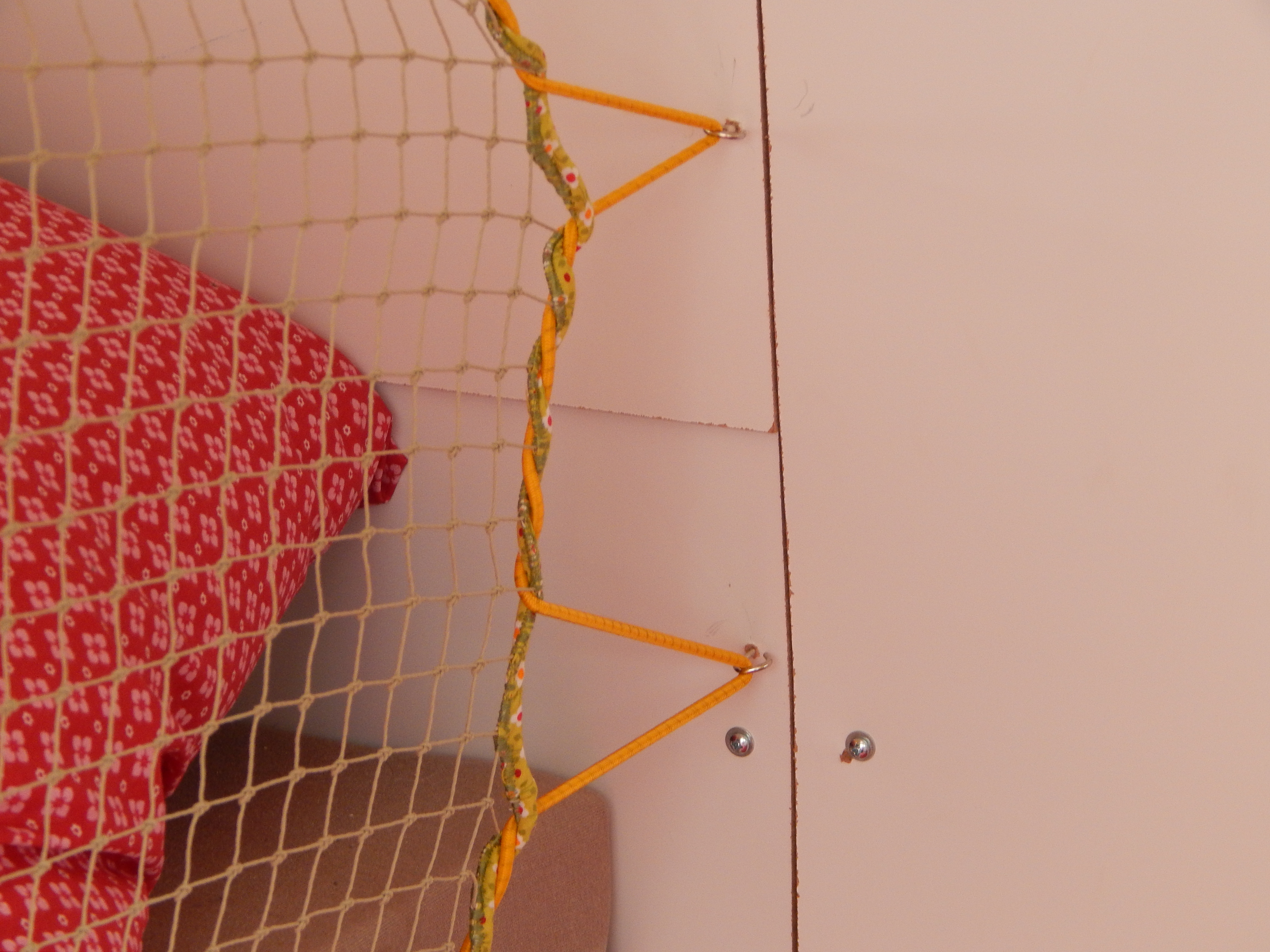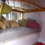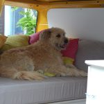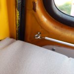 Da das Klappbett aus massivem Holz und daher schwer ist, wurden zum leichteren Öffnen Gasfedern verbaut. Weil die etwas überdimensioniert waren, dienen Haken dazu, das Bett auch geschlossen zu halten, wenn es geschlossen sein soll. Für den Transport der Hunde wurde ein Netz zur Sicherung benötigt. Leider gab es im Handel nichts Geeignetes, deshalb habe ich aus Meterware das Netz passend geschneidert. Mit Hilfe von Seilschlaufen und Haken wird das Netz befestigt. Auch für die Befestigung des Netzes am Bushimmel wurden Nieten verwendet. Für später wurden bei der Gelegenheit noch weitere Holzleisten angebracht, so dass der Himmel mit Stoff bezogen werden kann. Zuletzt wurde auch ein Spiegel angebracht. Die sichtbaren Teile der Leimplatten wurden weiss lackiert.