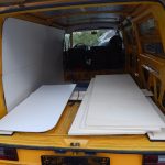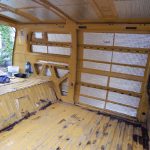 Nachdem der Bus innen mit Rostumwandler behandelt war, habe ich die Innenwände und den Himmel mit Alubutyl beklebt. Das Alubutyl wurde auf 2 großen Rollen geliefert, es ist ziemlich schwer, aber es lässt sich hervorragend schneiden. Nachdem der leere Kastenwagen vorher laut wie eine Düsenflugzeug war, hat die Isolierung eine deutliche Verbesserung in Punkto Fahrgeräusch gebracht. Isoliert wurde mit X-treme Isolator überall dort, wo Holz direkt auf den Bus geschraubt wurde. Das Material lässt sich sehr gut mit einem Teppichmesser schneiden, es ist ebenfalls selbstklebend und man kann es hervorragend in die Trapezform des Bodens kleben.