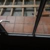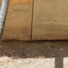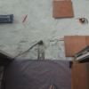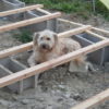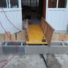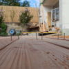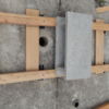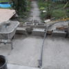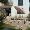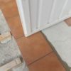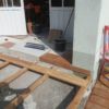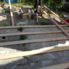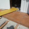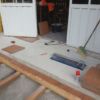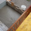 Um den Übergang vom Haus zur Terrasse schön zu beginnen, wurde ein kleines Podest gegossen. Zu beachten war dort, dass die Garten-Wasserleitung (Schlauch) hier nicht mitbetoniert werden sollte, der Schlauch wurde zur Sicherheit mit mehreren Lagen Polsterfolien umwickelt. Für das Podest wurde eine kleine Schalung gebaut, die mit Beton ausgegossen wurde. Das Podest wurde eben betoniert, das erwies sich in der Folge zunächst als Baufehler, weil sich herausgestellt hat, dass die vorhandene Terrassentür schief eingebaut war und daher beim Öffnen „hing“. Also wurde hinterher wieder Beton abgekratzt, bis das Podest für das Öffnen der Tür passend war. Zuletzt wurde das Podest mit Fliesen verkleidet.