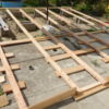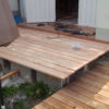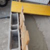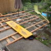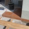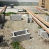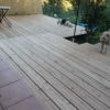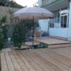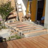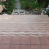 Für den Übergang vom Haus hin zur Terrasse wurde eine einzelne, sehr große Stufe gebaut. Hier wurden als Unterkonstruktion Hohlziegel verwendet, die mit Beton gefüllt wurden. Besondere Schwierigkeit war hier, dass die vorhandene abschüssige Betonierung nicht in der Waage war, dies musste also durch die Unterkonstruktion ausgeglichen werden. Hier wurde zusätzlich mit kleineren Vollbetonziegeln gearbeitet. Damit die Hohlziegel eben auflagen, wurde hierfür erneut geschalt und ein kleines Fundament gegossen. Auf die fertig gefüllten Ziegel bzw. direkt auf die vorhandene Betonierung wurden dann die Holzstaffeln verschraubt. Zuletzt wurden die Lärchendielen auf der Unterkonstruktion verschraubt