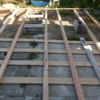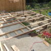 Die Unterkonstruktion für die Terrasse ist der wichtigste Teil der Arbeit. Wenn das gut ist, ist der Rest ein Kinderspiel. Ganz so spielend war diese Konstruktion nicht zu machen: Das vorhandene Betonpodest war in alle Richtungen schief und die Verlängerung der Terrasse in den Garten hinein erforderte einen soliden Unterbau, der sich nicht mehr setzen können sollte. Einige Monate davor war dort der Aushub aus einem Wasserleitungsbau, ein Stein-Erde-Gemisch, das sich extrem verfestigt hat, aufgebracht worden. Provisorisch wurden zunächst die Lärchenstaffeln alle 50 cm gelegt, hierbei diente die hintere (weil höchste) Kante des Betonpodestes als Messpunkt. Dann kam langwieriges Messen – ohne mindestens 2 Wasserwaagen ist hier nichts zu machen. Damit alle Hölzer auf dem Podest in gleicher Höhe lagen, wurden unter die Konstruktionshölzer verschiedene Lagen Kork gelegt. Die Hölzer wurden dann gebohrt, die Bohrlöcher mit einem sich öffnenden Bohrer zum Versenken der Schrauben vorbereitet – bei Lärchenholz ein muss, sonst bekommt man die Schrauben nicht hinein, weil das Holz zu hart ist und einreißt. Das Betonpodest wurde ebenfalls gebohrt und dort die Dübel gesteckt. Mit langen Schrauben wurde dann das Konstruktionsholz mit dem Sockel fest verbunden. Dort, wo die Terrasse in den Garten verlängert wurde, wurde mit Hohlziegeln gearbeitet, die später mit Beton gefüllt wurden, diese Ziegel sind breit genug, um in die Ränder Bohrlöcher zu machen, in die man Dübel versenken kann.