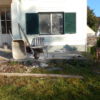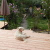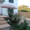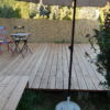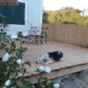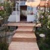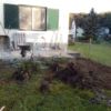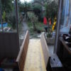 Der Übergang von der großen Stufe zur Terrasse wurde noch mit Lärchenholz verkleidet, ebenso die Terrasse auf der gesamten Länge in den Garten. Für den Rest der eigentlich noch nötigen Verkleidung war im Moment kein Budget mehr da, da muss man also später noch nachholen. Auch ein Geländer sollte im Bereich der Treppe angebracht werden als Sicherheitsaspekt für alte Menschen.
