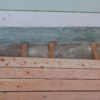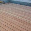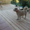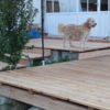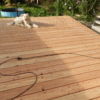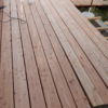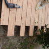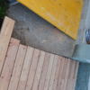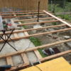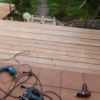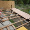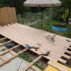 Den Holzboden auf die Konstruktion zu verschrauben, war vergleichsweise einfach. Sämtliche Dielen mussten vorgebohrt werden, durch Lärchenholz ist sonst kein Durchkommen. Hier hat sich als glücklich erwiesen, dass zwei Bohrmaschinen und ein Akkuschrauber vorhanden waren, so dass nicht dauernd umgespannt werden musste. Ein bisschen knifflig war die Arbeit zum Haus hin, weil natürlich auch das Haus schief gebaut war. Während des Verschraubens der Bretter habe ich die Bretter ungekürzt verwendet, erst ganz am Ende wurden an den Seiten die Bretter auf eine Länge gebracht.