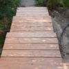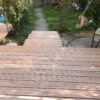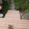 Mein Nachbar hatte sich gewünscht, dass die abschüssige Betonierung völlig verschwinden sollte. Stattdessen sollte eine kleine Treppe in den Garten führen. Ich habe hier ausprobiert, wie hoch die Stufen sein konnten und wie die optimale Schrittlänge für jede Stufe war. Dann habe ich hier erneut mit Hohlziegeln die Stufen vorgearbeitet, darauf wieder die Staffeln verschraubt. Anschließend wurden die Lärchendielen auf der Unterkonstruktion verschraubt.