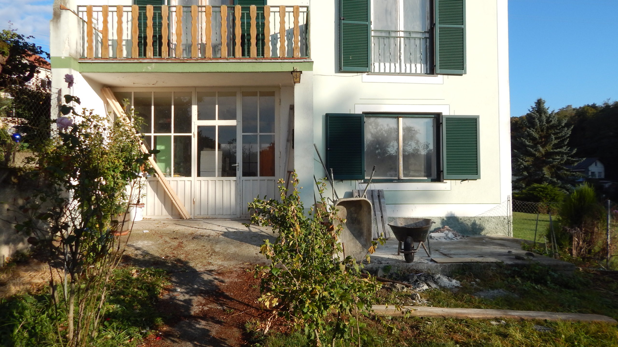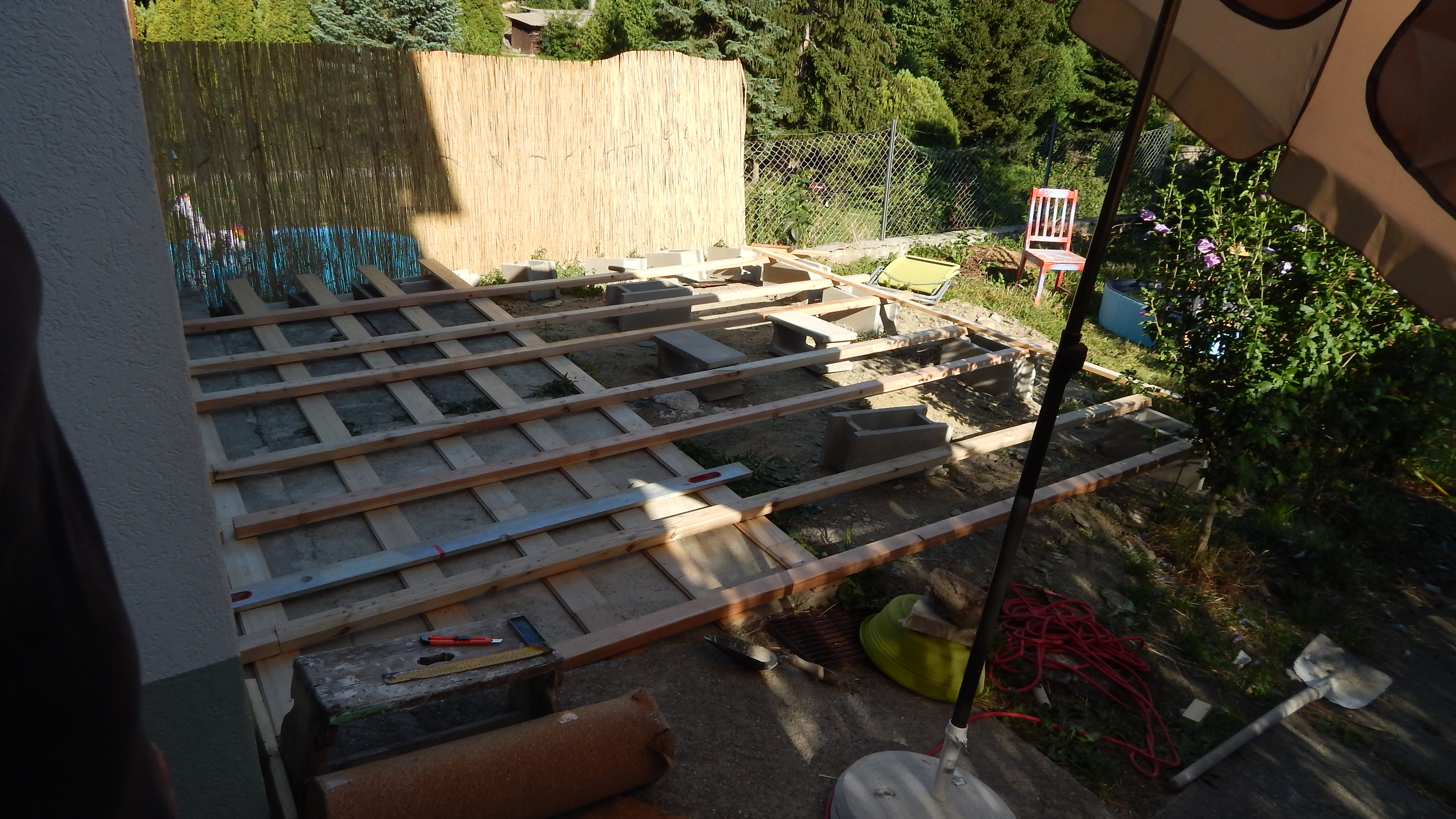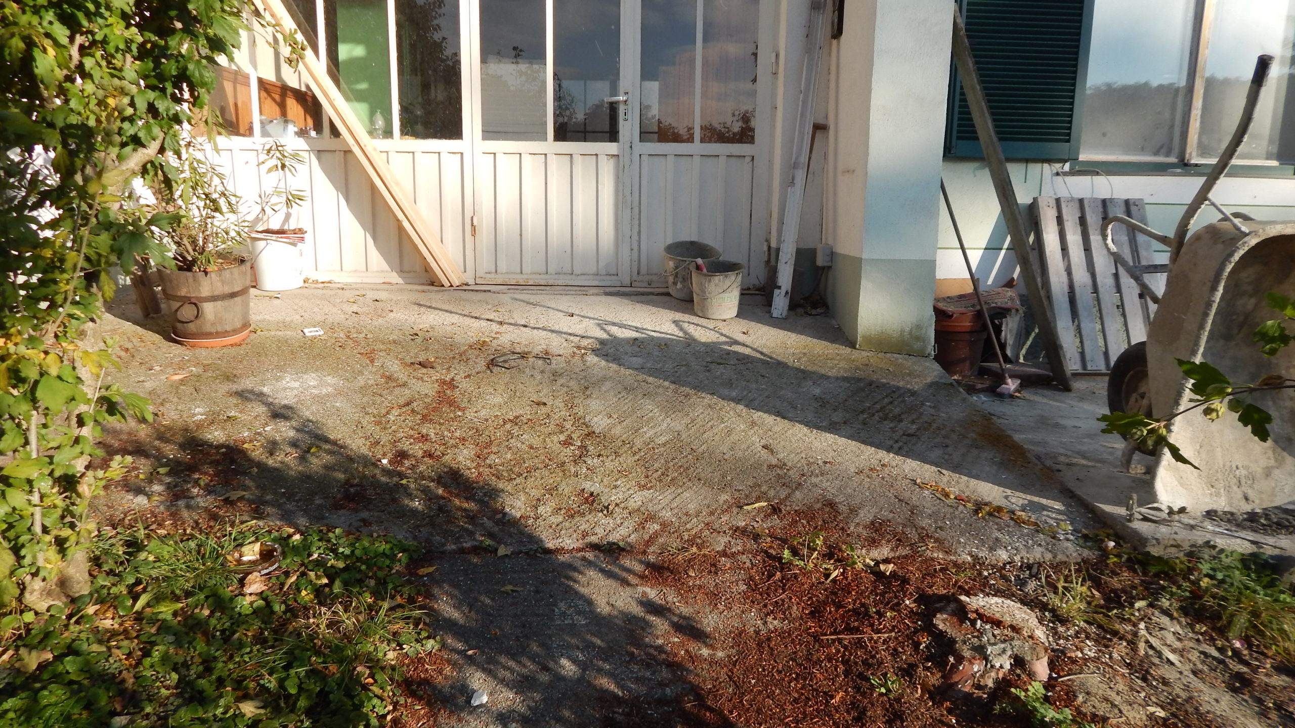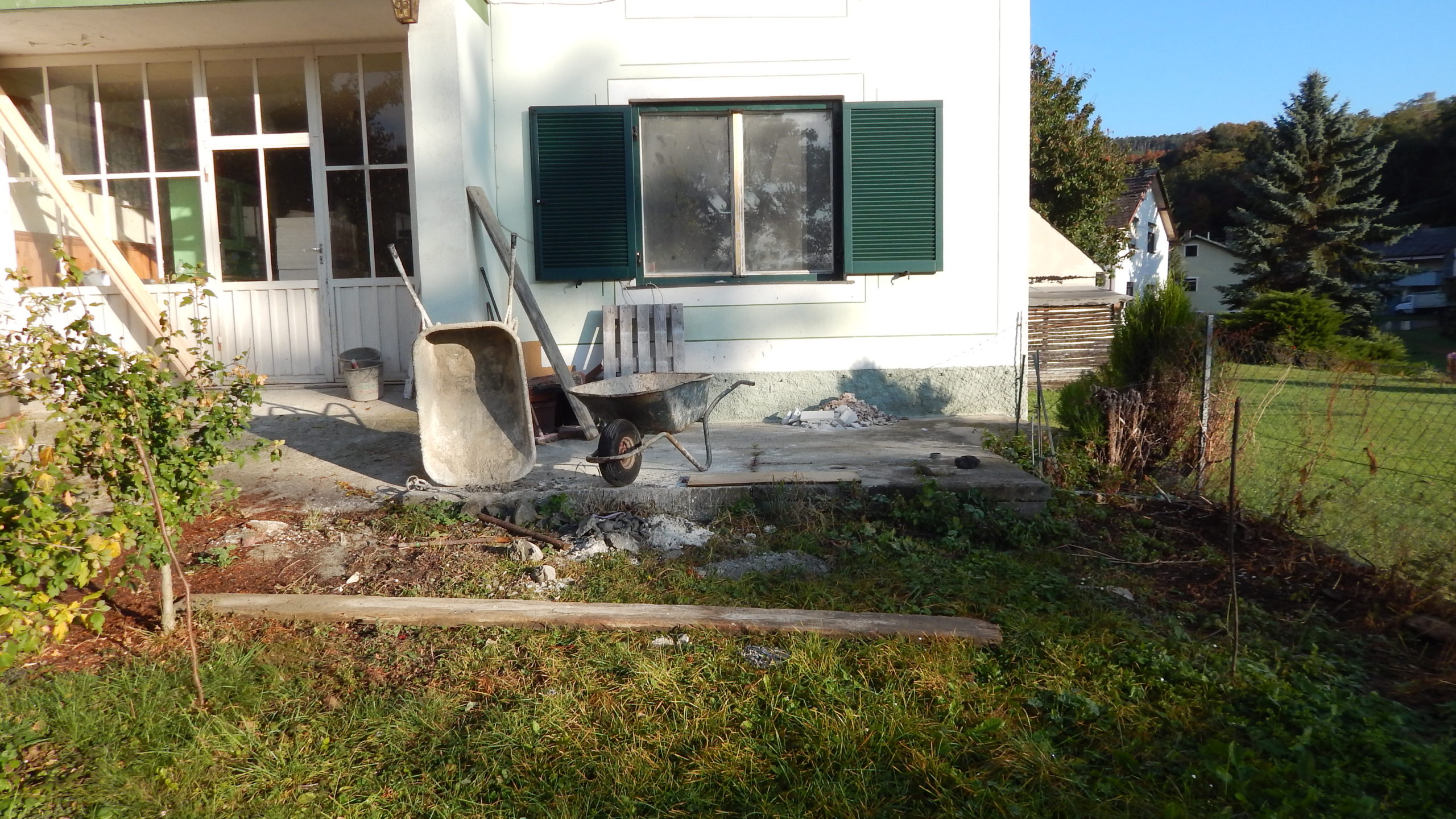 Um den Übergang vom Haus zur Terrasse schön zu beginnen, wurde ein kleines Podest gegossen. Zu beachten war dort, dass die Garten-Wasserleitung (Schlauch) hier nicht mitbetoniert werden sollte, der Schlauch wurde zur Sicherheit mit mehreren Lagen Polsterfolien umwickelt. Für das Podest wurde eine kleine Schalung gebaut, die mit Beton ausgegossen wurde. Das Podest wurde eben betoniert, das erwies sich in der Folge zunächst als Baufehler, weil sich herausgestellt hat, dass die vorhandene Terrassentür schief eingebaut war und daher beim Öffnen „hing“. Also wurde hinterher wieder Beton abgekratzt, bis das Podest für das Öffnen der Tür passend war. Zuletzt wurde das Podest mit Fliesen verkleidet.