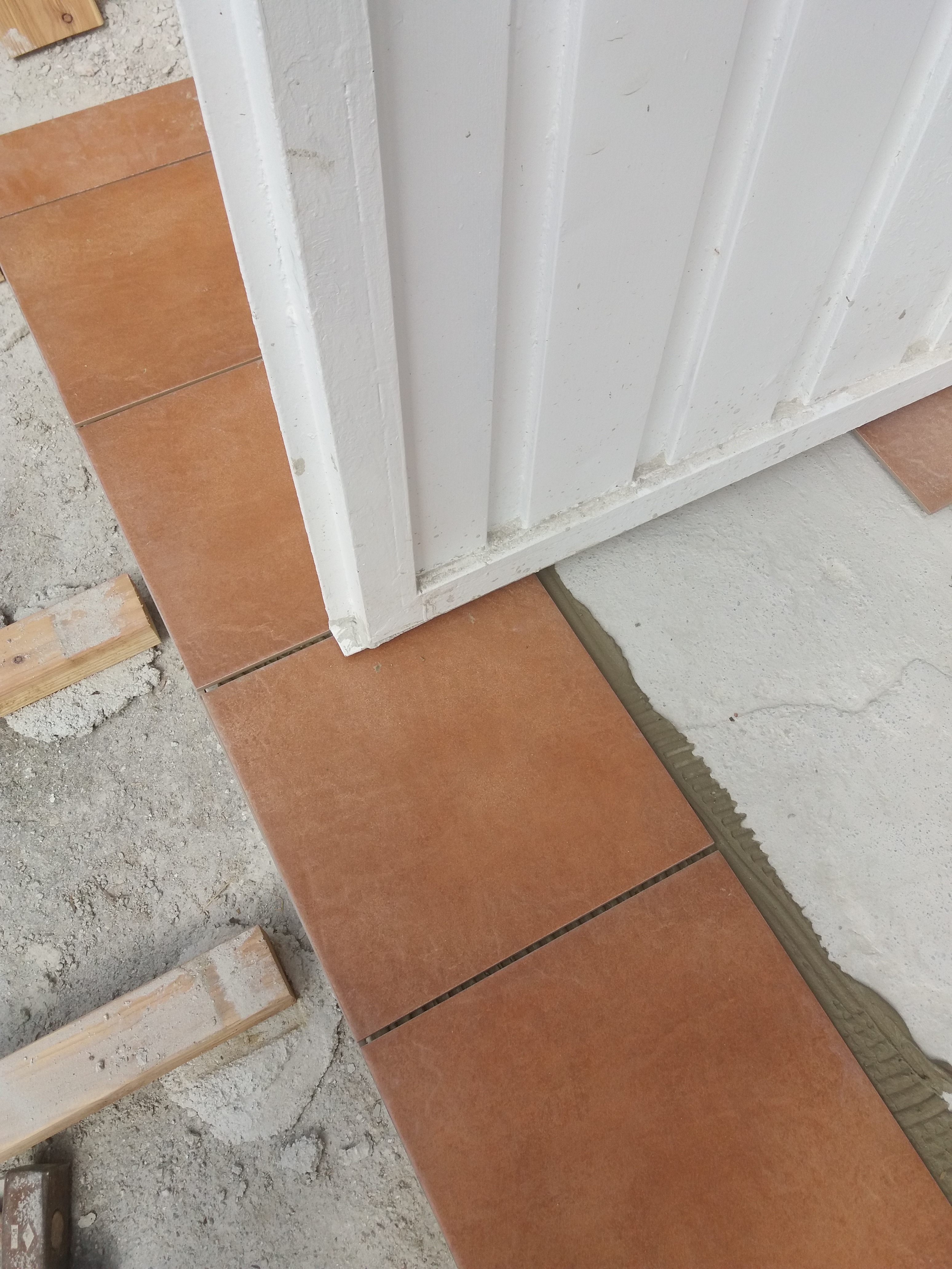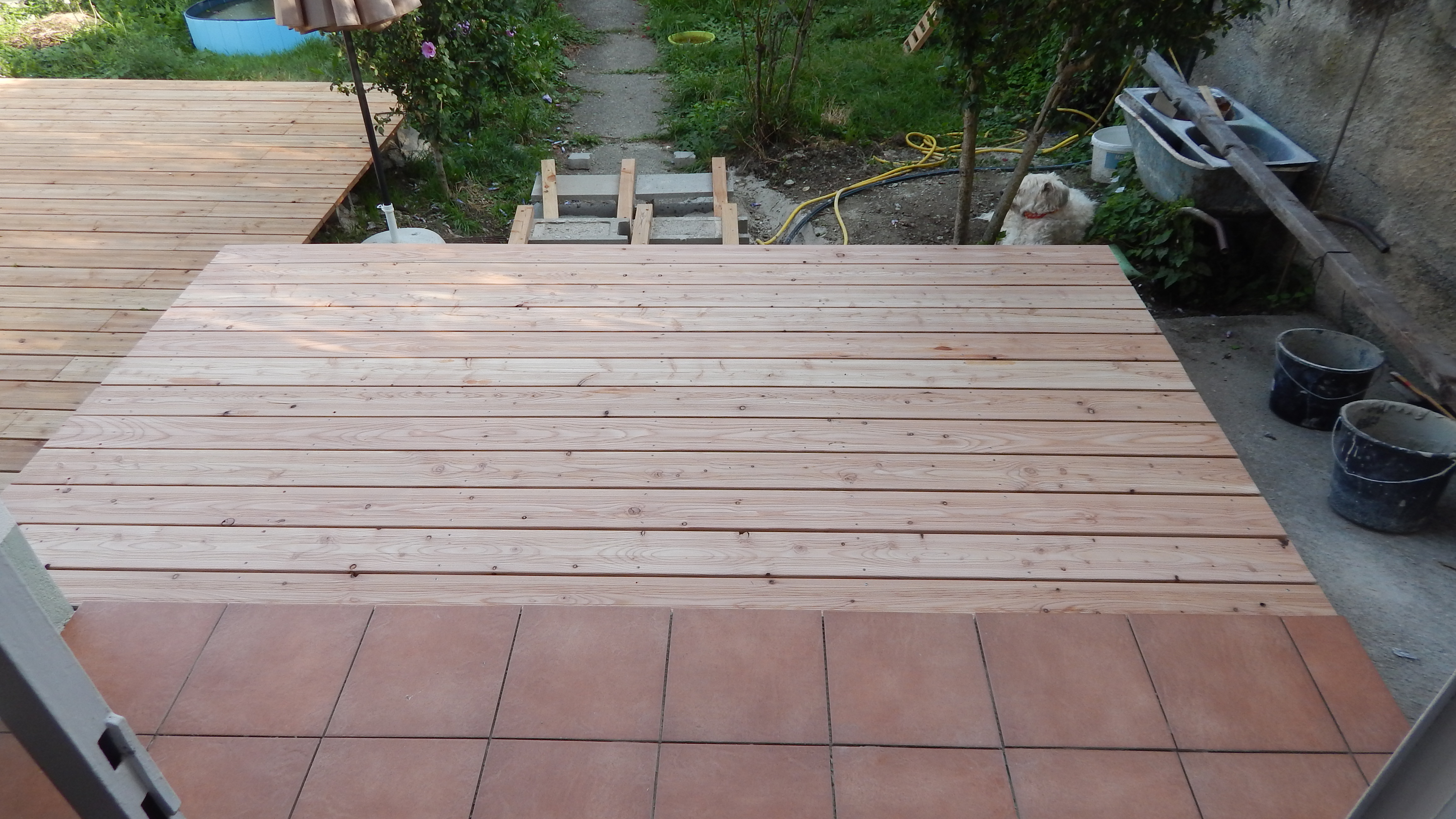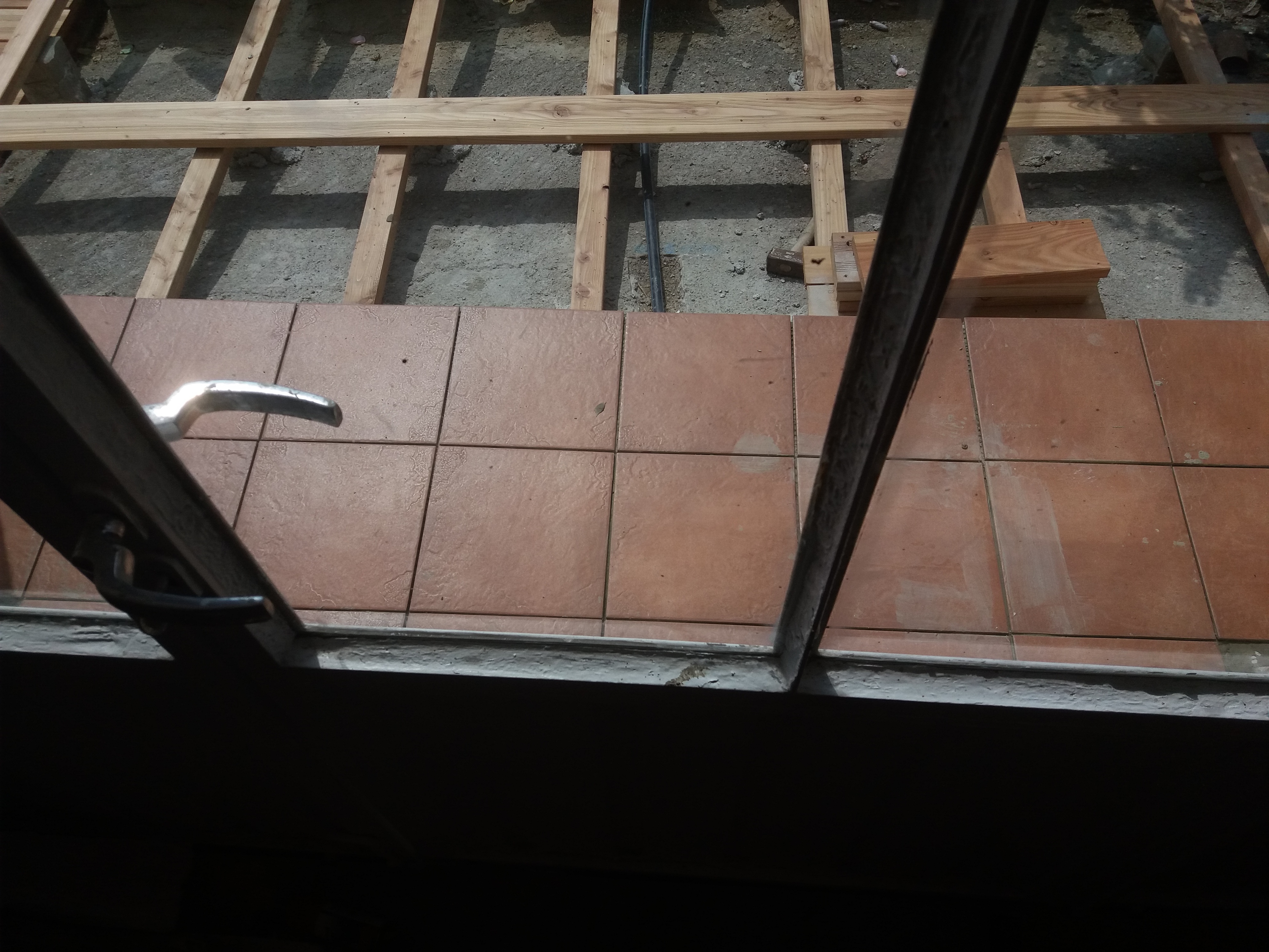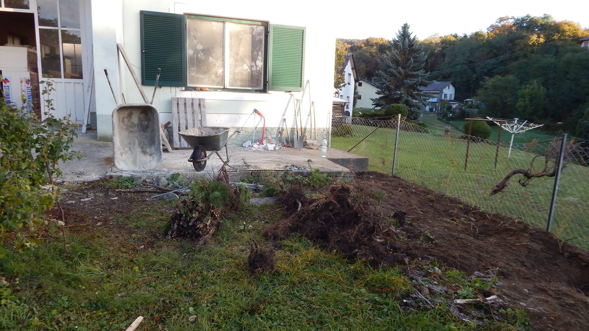Um den Übergang vom Haus zur Terrasse schön zu beginnen, wurde ein kleines Podest gegossen. Zu beachten war dort, dass die Garten-Wasserleitung (Schlauch) hier nicht mitbetoniert werden sollte, der Schlauch wurde zur Sicherheit mit mehreren Lagen Polsterfolien umwickelt. Für das Podest wurde eine kleine Schalung gebaut, die mit Beton ausgegossen wurde. Das Podest wurde eben betoniert, das erwies sich in der Folge zunächst als Baufehler, weil sich herausgestellt hat, dass die vorhandene Terrassentür schief eingebaut war und daher beim Öffnen „hing“. Also wurde hinterher wieder Beton abgekratzt, bis das Podest für das Öffnen der Tür passend war. Zuletzt wurde das Podest mit Fliesen verkleidet.