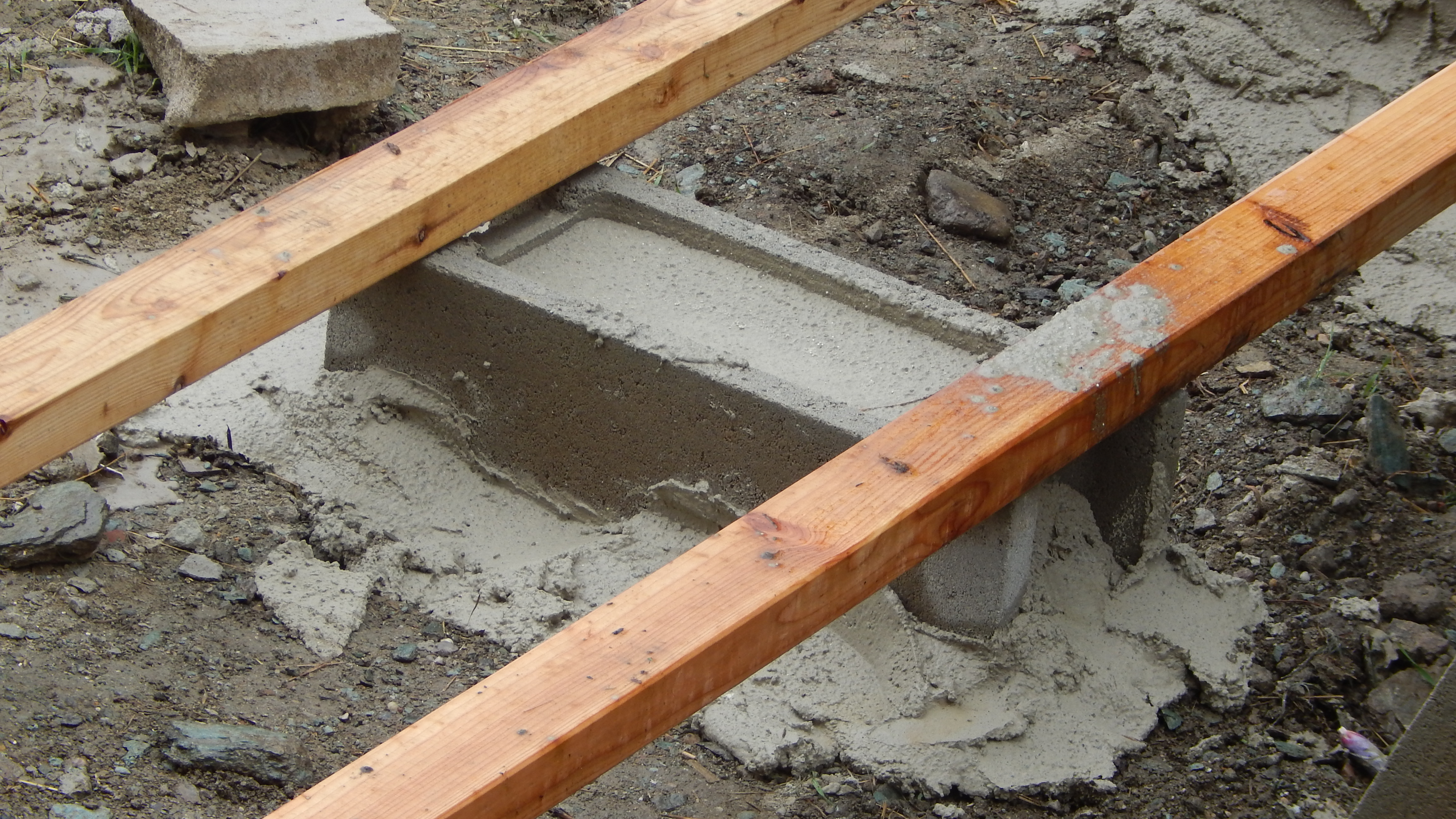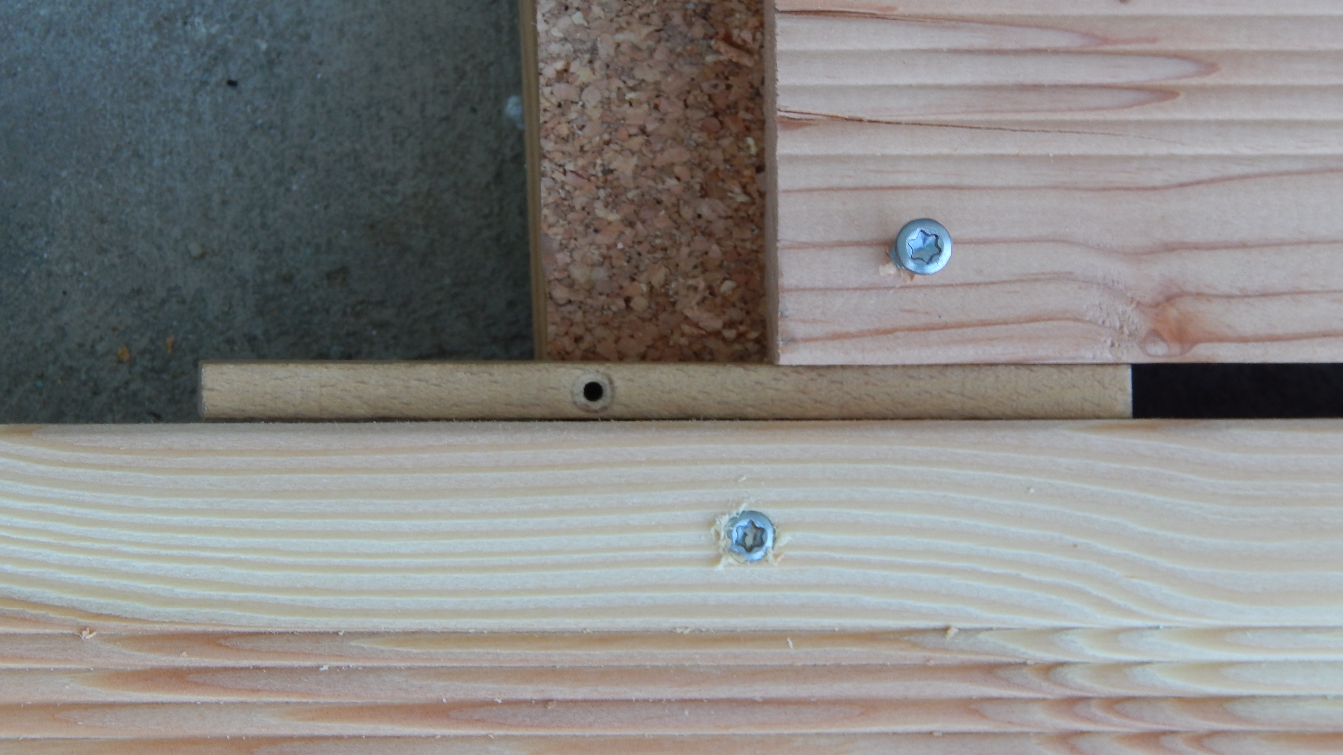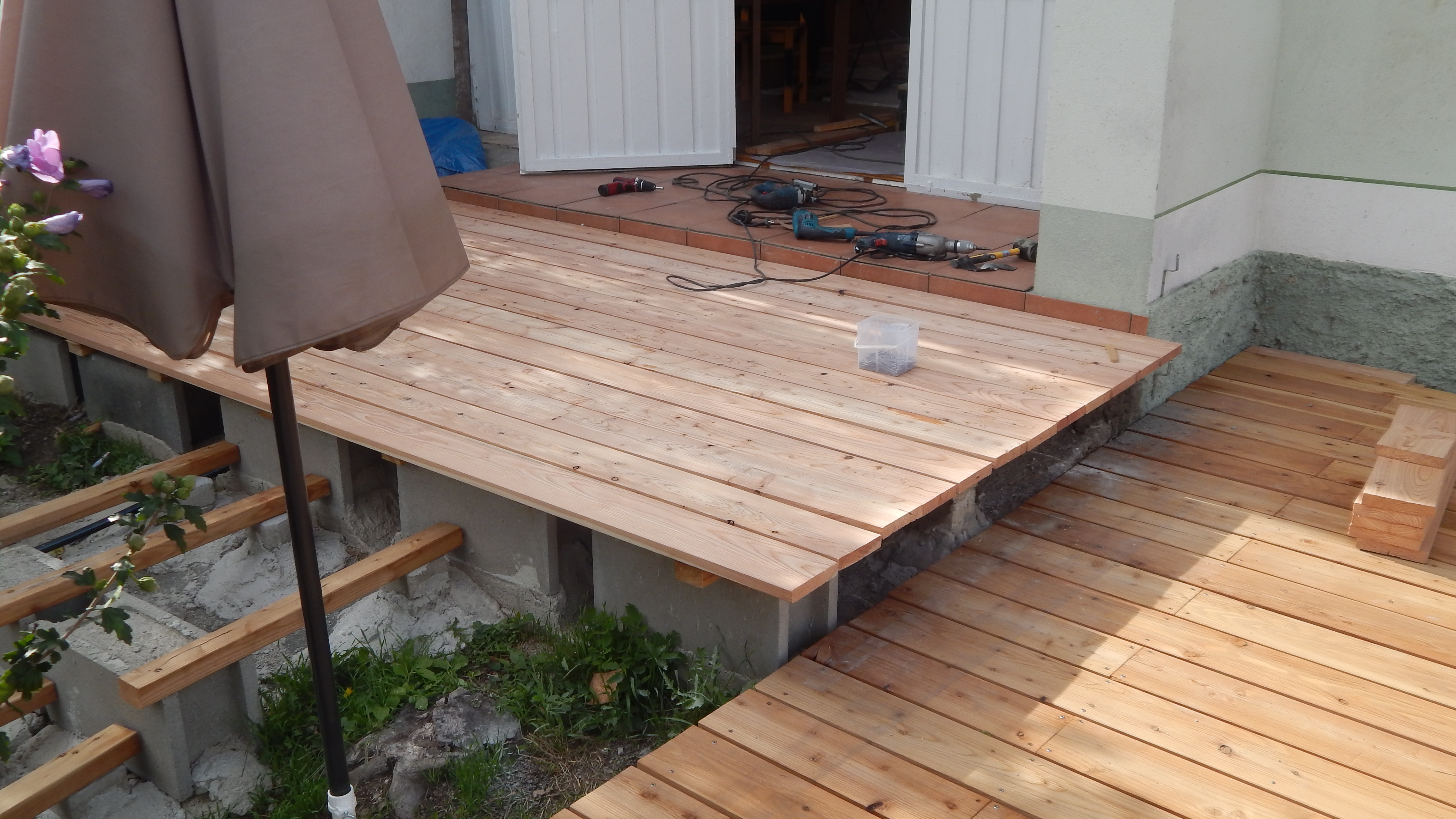 Die Unterkonstruktion für die Terrasse ist der wichtigste Teil der Arbeit. Wenn das gut ist, ist der Rest ein Kinderspiel. Ganz so spielend war diese Konstruktion nicht zu machen: Das vorhandene Betonpodest war in alle Richtungen schief und die Verlängerung der Terrasse in den Garten hinein erforderte einen soliden Unterbau, der sich nicht mehr setzen können sollte. Einige Monate davor war dort der Aushub aus einem Wasserleitungsbau, ein Stein-Erde-Gemisch, das sich extrem verfestigt hat, aufgebracht worden. Provisorisch wurden zunächst die Lärchenstaffeln alle 50 cm gelegt, hierbei diente die hintere (weil höchste) Kante des Betonpodestes als Messpunkt. Dann kam langwieriges Messen – ohne mindestens 2 Wasserwaagen ist hier nichts zu machen. Damit alle Hölzer auf dem Podest in gleicher Höhe lagen, wurden unter die Konstruktionshölzer verschiedene Lagen Kork gelegt. Die Hölzer wurden dann gebohrt, die Bohrlöcher mit einem sich öffnenden Bohrer zum Versenken der Schrauben vorbereitet – bei Lärchenholz ein muss, sonst bekommt man die Schrauben nicht hinein, weil das Holz zu hart ist und einreißt. Das Betonpodest wurde ebenfalls gebohrt und dort die Dübel gesteckt. Mit langen Schrauben wurde dann das Konstruktionsholz mit dem Sockel fest verbunden. Dort, wo die Terrasse in den Garten verlängert wurde, wurde mit Hohlziegeln gearbeitet, die später mit Beton gefüllt wurden, diese Ziegel sind breit genug, um in die Ränder Bohrlöcher zu machen, in die man Dübel versenken kann.