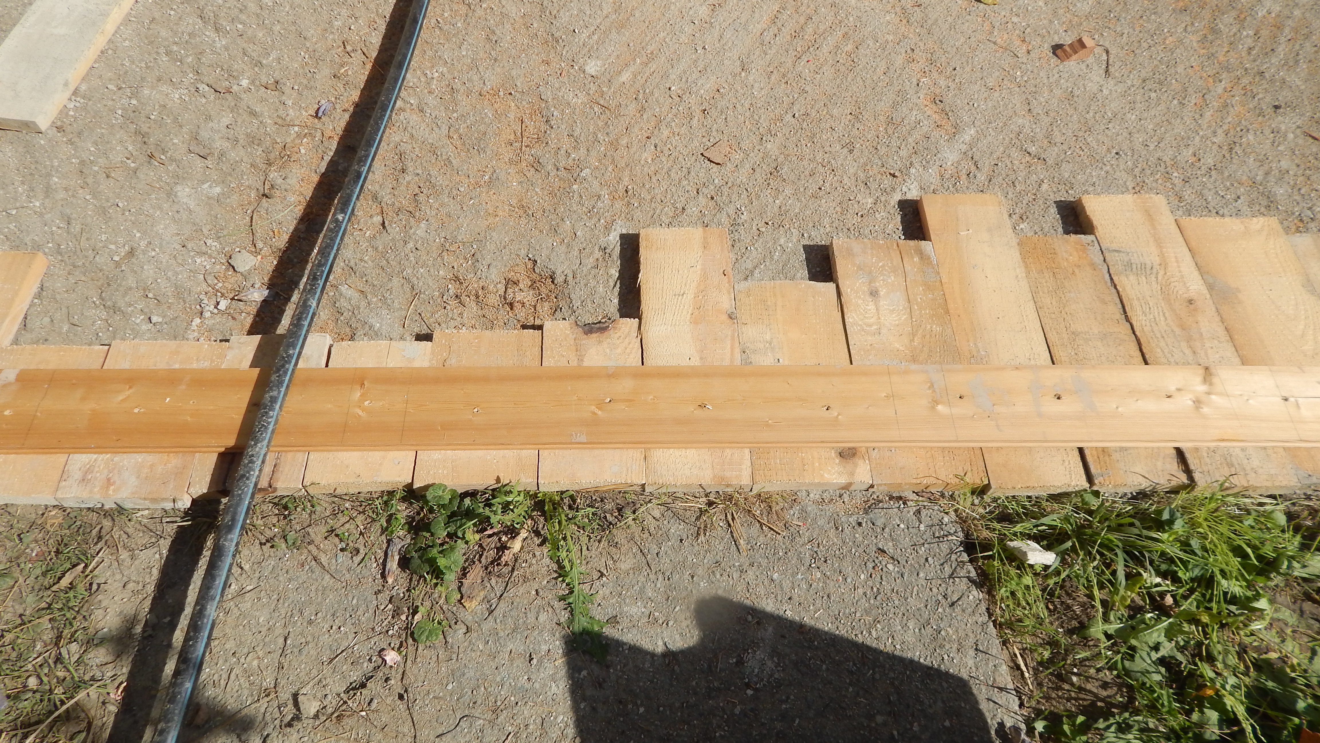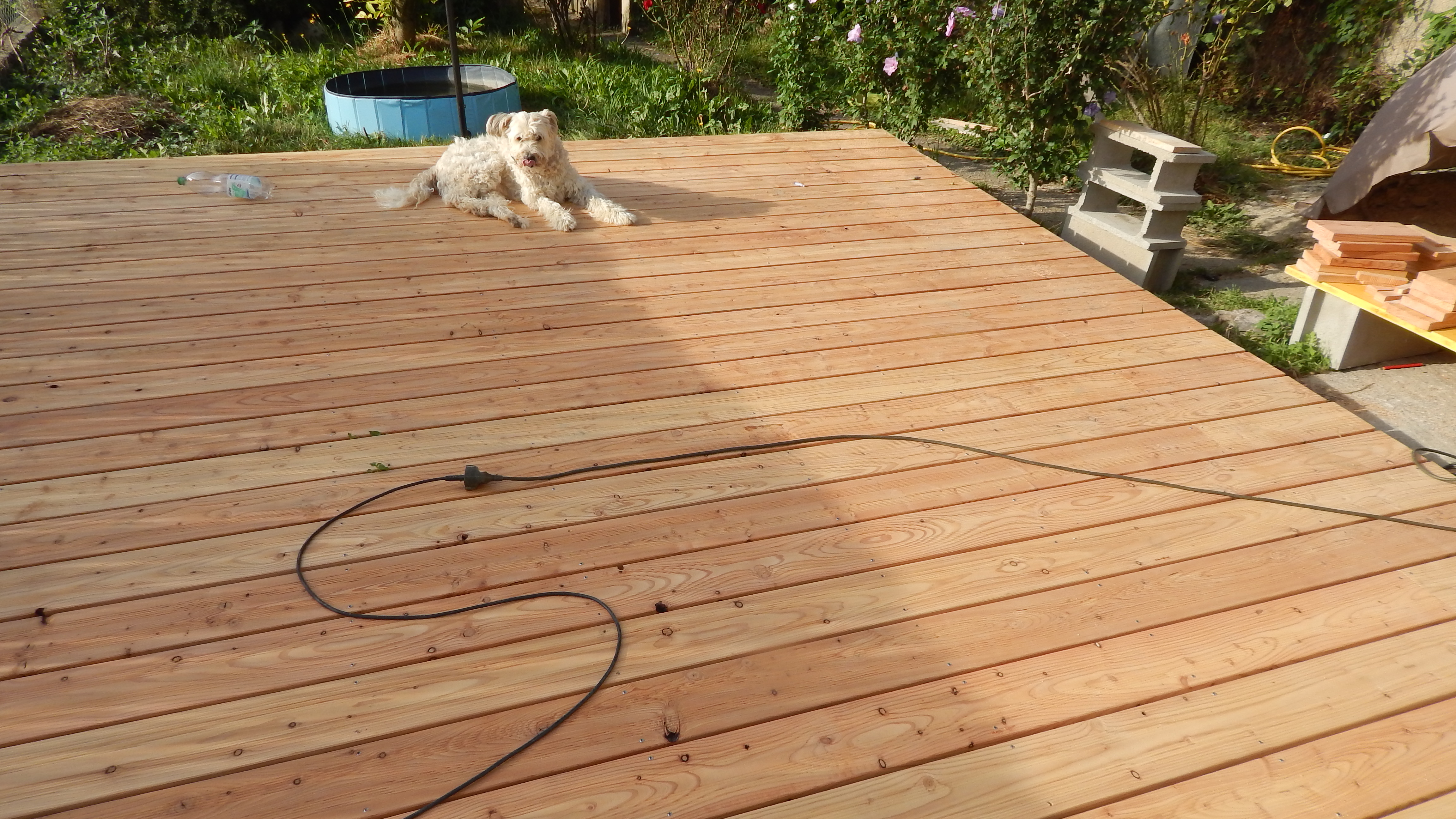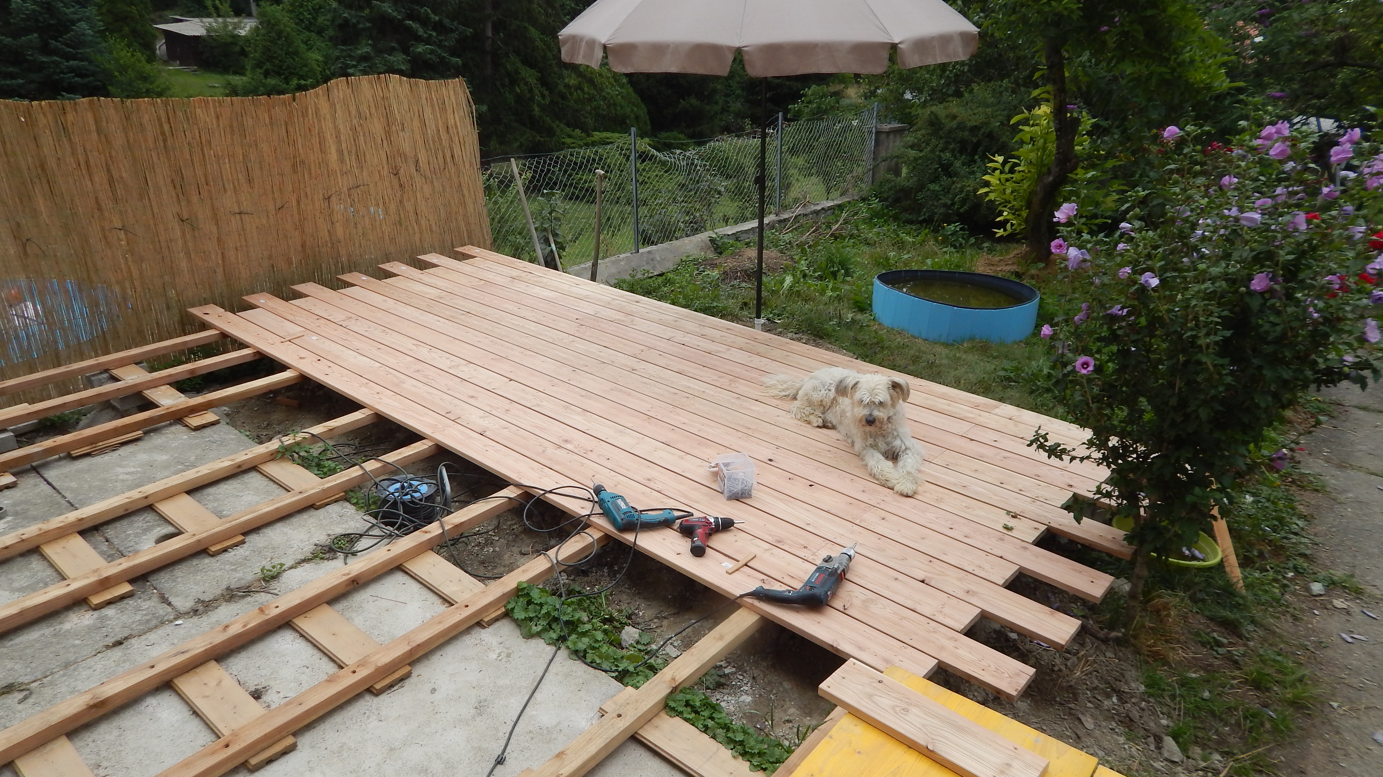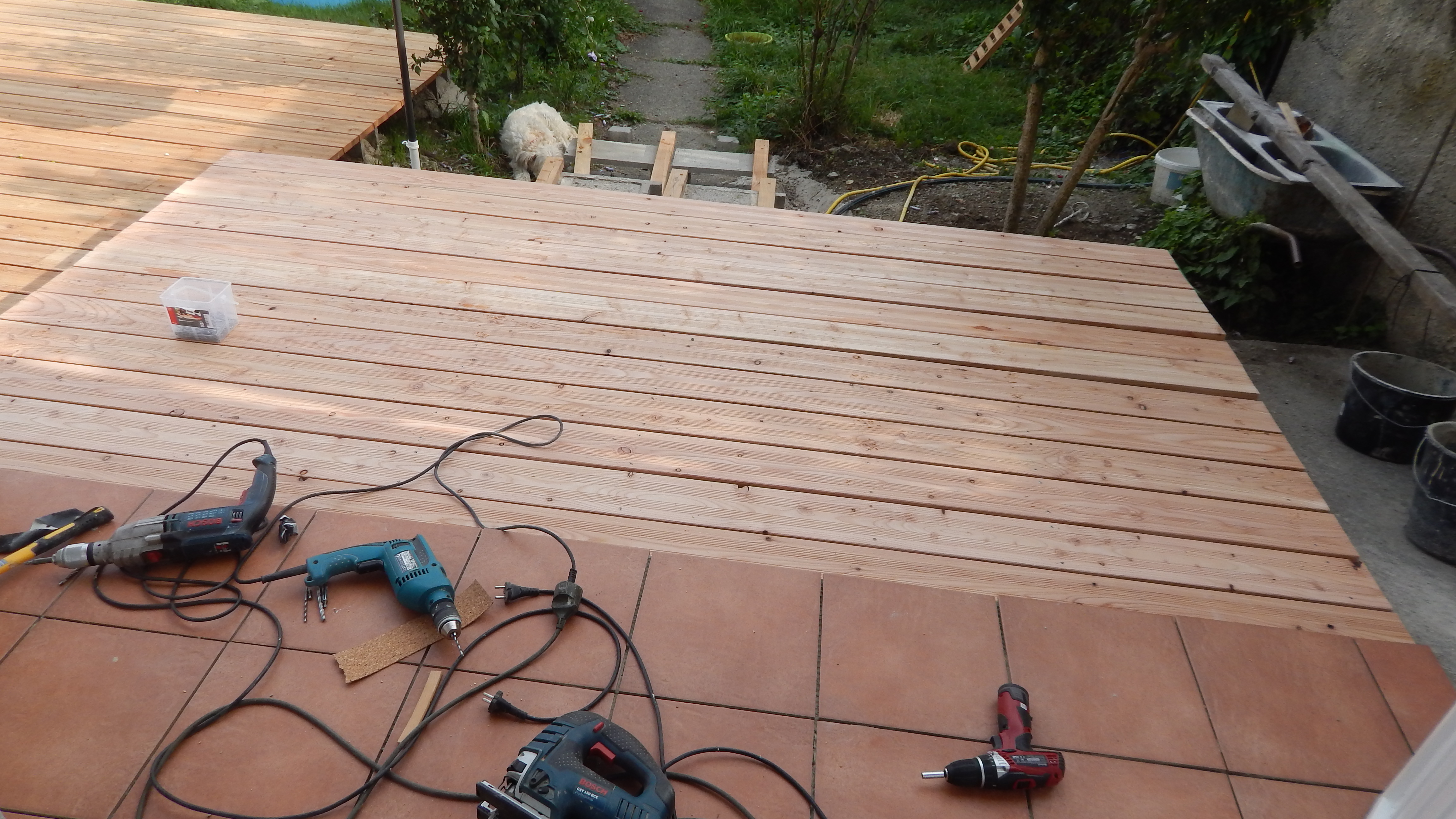 Den Holzboden auf die Konstruktion zu verschrauben, war vergleichsweise einfach. Sämtliche Dielen mussten vorgebohrt werden, durch Lärchenholz ist sonst kein Durchkommen. Hier hat sich als glücklich erwiesen, dass zwei Bohrmaschinen und ein Akkuschrauber vorhanden waren, so dass nicht dauernd umgespannt werden musste. Ein bisschen knifflig war die Arbeit zum Haus hin, weil natürlich auch das Haus schief gebaut war. Während des Verschraubens der Bretter habe ich die Bretter ungekürzt verwendet, erst ganz am Ende wurden an den Seiten die Bretter auf eine Länge gebracht.