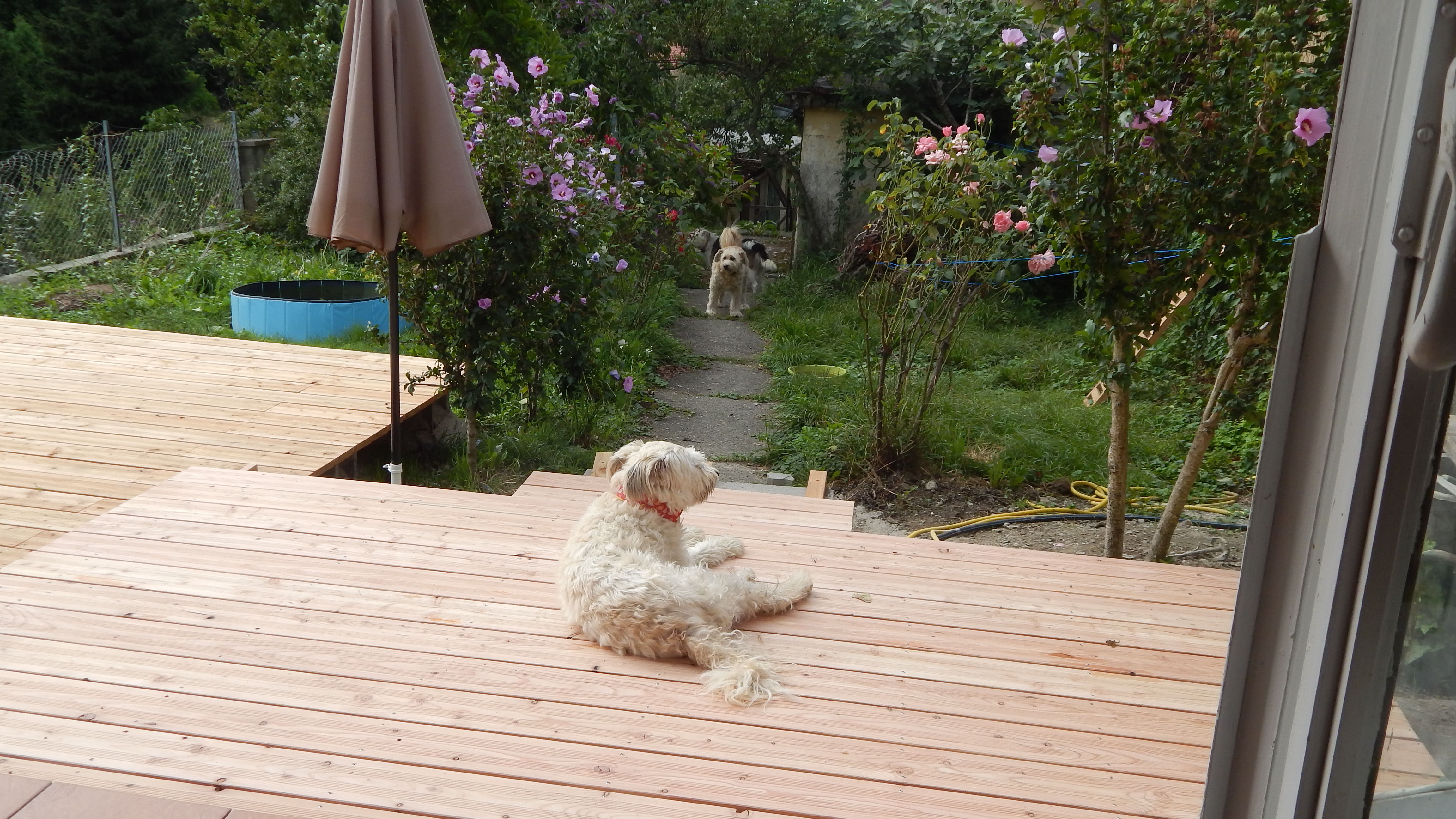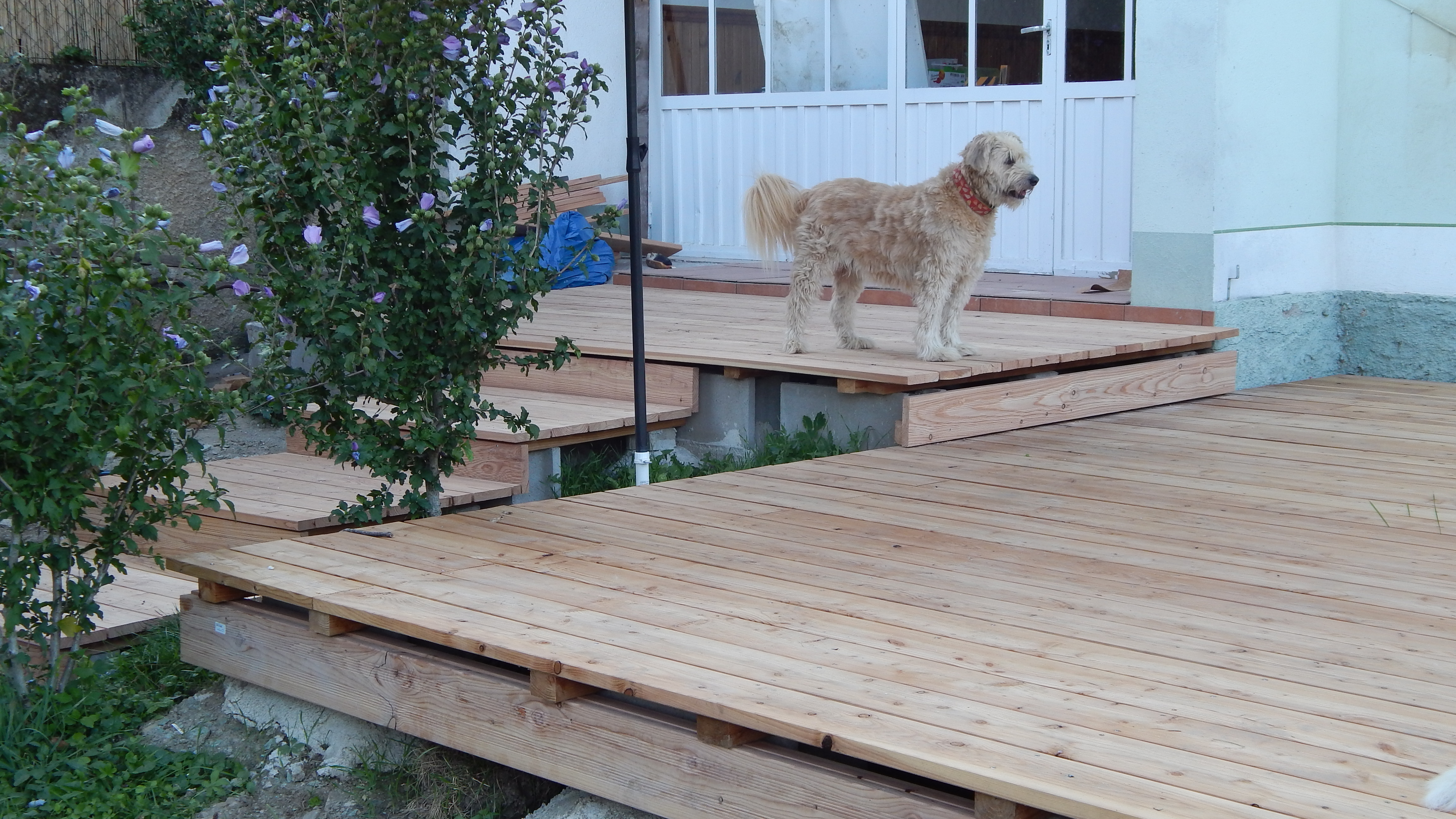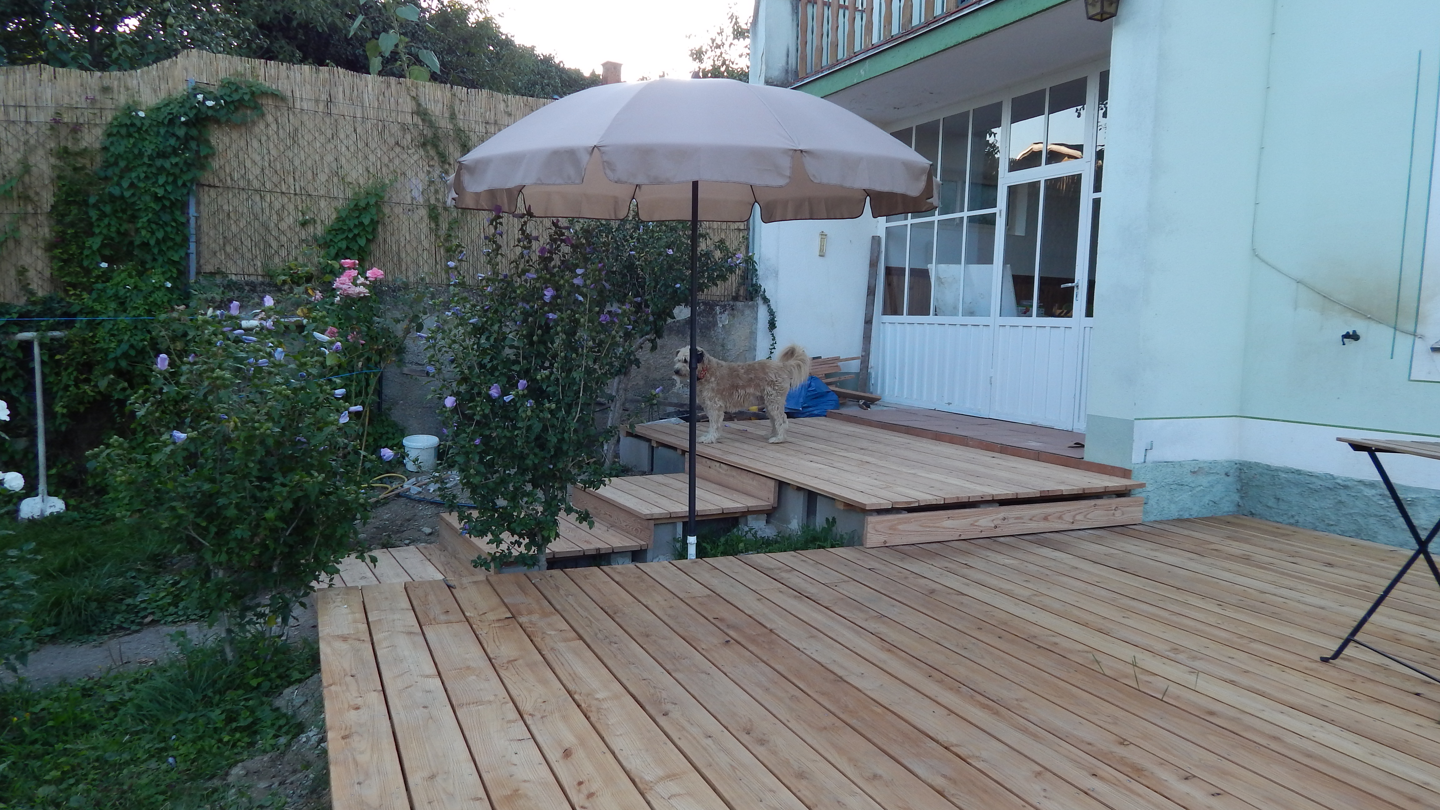 Der Übergang von der großen Stufe zur Terrasse wurde noch mit Lärchenholz verkleidet, ebenso die Terrasse auf der gesamten Länge in den Garten. Für den Rest der eigentlich noch nötigen Verkleidung war im Moment kein Budget mehr da, da muss man also später noch nachholen. Auch ein Geländer sollte im Bereich der Treppe angebracht werden als Sicherheitsaspekt für alte Menschen.