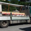 Für die gesamte Konstruktion mussten die Pfosten erst in der korrekten Länge abgelängt werden. Ich habe das Holz (hohe Qualität, günstig) direkt beim Holzwerk geordert und natürlich vereinbart, dass die Pfosten in der richtigen Länge abgelängt werden. Und dann stand da vor meiner Tür dieser riesige LKW mit 12 – 14 Meter langen Pfosten. Ich habe den LKW zurück zum Werk geschickt und gesagt: Bitte ablängen wie besprochen. Der LKW kam wieder und ich habe nach dem Abladen festgestellt, dass nur grob mit der Motorsäge abgelängt worden war, von Präszisisonsschnitten keine Spur. Also mussten erst sämtliche Pfosten korrekt gemessen und abgelängt werden. Wieder einmal hat die Bosch-Pendelhub-Säge hier ganze Arbeit geleistet. Versuche davor mit einer eigens dafür angeschafften Handkreissäge scheiterten, weil man damit nicht die ganze Tiefe der 12 cm durchsägen konnte. Nach einigen Versuchen des Ablängens habe ich dafür eine eigene Liegefläche mit mehreren Paletten gebaut, darauf konnte man gut sägen. Zu zweit war hier doch einiges leichter. Ein Stolperstein war die Frage, wie man jene Leimbinder verarbeitet, die quer liegen: So, dass die Bindungen hochkantig stehen oder so, dass man die Bindungen quer liegen hat? Die Profis vom Holzwerk haben hier empfohlen, die Leimbinder so zu verarbeiten, dass die Bindungen quer zu liegen kommen (man also von der Seite aus die drei Schichten sehen kann).