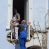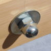Nachdem der Mörtel eingespritzt war, wurde der Balken wieder eingerichtet und die Gewindestangen wurden durch die Bohrlöcher ins Mauerwerk eingeschlagen, fast wäre das trotz des großen Vorschlaghammers nicht gelungen, weil das Einschlagen aufgrund der zu hohen Füllmenge viel Kraft erfordert hat. Nach einem Tag Trockungszeit wurde auf die Gewindestangen zunächst Beilagscheibe und Mutter aufgeschraubt, die Stange wurde direkt an der Mutter abgesägt. Danach wurde die Mutter durch eine Hutmutter getauscht.