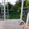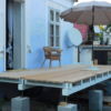 Die Dielen wurden unter Zuhilfenahme einer Schablone vorgebohrt, mit etwas Übung geht das sicher auch „Free-Style“. Die Dielen wurden mit geeigneten Untersetzern aus Kunststoff, die gleichzeitig auch als Abstandshalter dienen, unterlegt. Zuletzt wurde durch Diele und Abstandshalter verschraubt. Die letzte Diele direkt am Haus war ein Stückwerk, weil die Hausmauer nicht gerade war. Die Berechnung für die künftige Höhe des Bodens war perfekt, das hat sich aber erst ein Jahr später bei der Erneuerung des Bodens im Wohnzimmer gezeigt. Jetzt konnte man bereits den ersten Frühstückskaffee auf der Veranda genießen. Insgesamt lässt sich sagen: Das war der einfachste Teil des Verandabaus.
