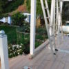 Die Fertigung des Geländers habe ich nicht im ersten Jahr geschafft, da lag ein Winter dazwischen. Und ich habe mir mehr als einmal gedacht: Warum hast du das bloß angefangen? Aber ich wollte so ein Geländer haben und das war der einzige Weg es zu bekommen. Das Geländer habe ich vor der Montage nur mit Anti-Schimmel behandelt, erst nachdem es montiert war, habe ich hier Grundierung und Farbe aufgetragen. Ein kleines Hoppala ist mir beim Geländer passiert: Ich habe das Kabel einer Kabeltrommel übersehen und das läuft jetzt vom Wohnzimmer unter dem Geländer durch. Kann nur noch entfernt werden, indem man es durchschneidet.