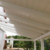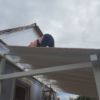 Nun konnte mit dem Decken des Daches begonnen werden. Die Nut- und Federbretter wurden von oben an die Pfosten verschraubt. Verkehrt herum natürlich, die „schöne“ Sichtseite sollte ja innen liegen, wo man sie auch sieht. Begonnen wurde wieder ganz vorne am Dach. Die ersten Bretter waren gar nicht so schwer, man montiert eines nach dem anderen. Die Bretter wurden vorher sorgfältig abgelängt, ich wollte nicht mit einer Säge in so großer Höhe arbeiten müssen, außerdem war hier ein exakter Schnitt nicht so wichtig, weil ohnehin noch die Dachbleche als Abschluss befestigt wurden.