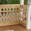 Nachdem das Geländer fertig war, fehlten noch die Verzierungen, die die Optik von Rundbögen vermitteln. Also habe ich hier wieder selbst etwas entworfen, dann eine Schablone gemacht und die auf Holz übertragen. Die ersten beiden Ecken wurden danach wieder verworfen, Korrekturen angebracht und schließlich alle zehn Elemente ausgesägt. Die Eckelemente wurde wieder auf Schienen gesetzt, die an die Pfosten verschraubt wurden. Zuletzt wurde noch mittig ein kleines Schluss-Element platziert.