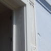 Ein spannender Moment war der Durchbruch für die künftige Verandatür. Bei diesem Teil habe ich mir Hilfe geholt. Das alte Fenster wurde ausgebaut (und aufgehoben für andere Zwecke), der neue Stock wurde eingebaut sowie die Tür nach einer Woche eingehängt. Wichtig war hier, die künftige Höhe des Bodens im Innenraum voraus zu berücksichtigen: Der Boden im Wohnzimmer sollte nämlich ein Jahr später gedämmt und erneuert werden, so dass der Boden insgesamt rund 7 cm höher werden sollte als zum Zeitpunkt des Einbaus von Stock und Tür. Ich habe also einen Winter damit gelebt, hier entsprechend mit Decken nach außen abzudichten. Der Druchbruch war der erste Schritt, denn erst mit der finalen Türhöhe konnte ich die Höhe der Fundamente für die Veranda exakt berechnen. Die Bruchstellen vom Kellereingang wurden mit Baugitter überklebt, neu verputzt und gestrichen.