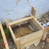 Nachdem die Treppe exakt berechnet war, habe ich das Muster der Steigung der Treppe auf dicke Holzbretter übertragen und dann entsprechend ausgesägt. Damit auch alles wirklich gut hält, habe ich drei der dicken Bretter für die Treppenkonstruktion genommen. Für den Fuß der Treppe habe ich ein kleines Fundament gegossen: Ausgegraben, geschottert, Eisen rein, betoniert, fertig. Auf dieses Dokument habe ich die Holztreppe aufgesetzt, allerdings nicht direkt Holz-auf-Stein sondern natürlich mit Abstandshalter, so dass das Holz nicht durch ständige Nässe am Boden beeinträchtigt wird.