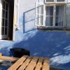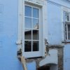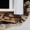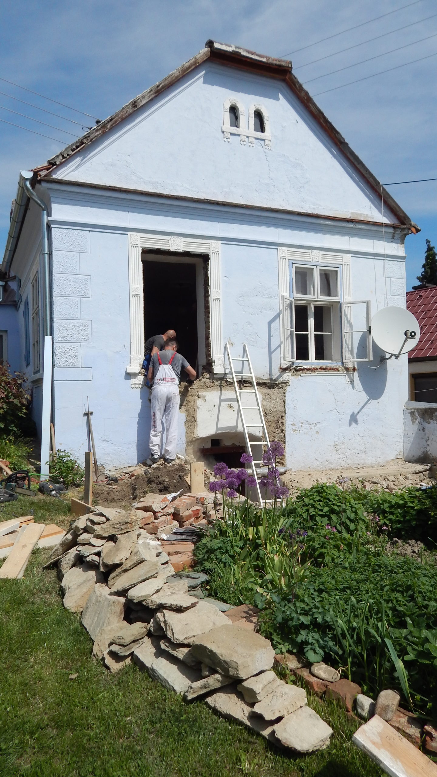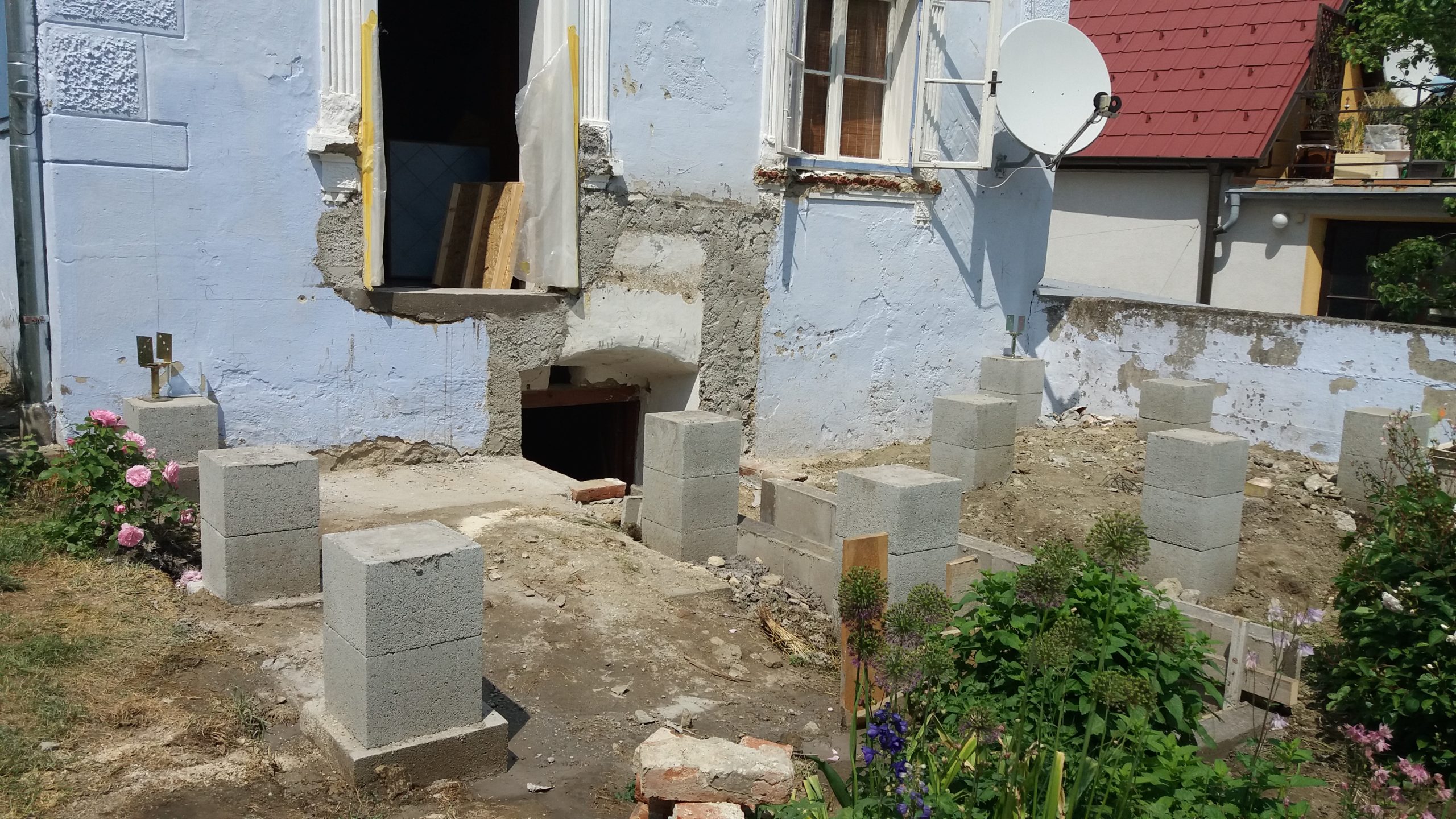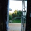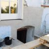 Ein spannender Moment war der Durchbruch für die künftige Verandatür. Bei diesem Teil habe ich mir Hilfe geholt. Das alte Fenster wurde ausgebaut (und aufgehoben für andere Zwecke), der neue Stock wurde eingebaut sowie die Tür nach einer Woche eingehängt. Wichtig war hier, die künftige Höhe des Bodens im Innenraum voraus zu berücksichtigen: Der Boden im Wohnzimmer sollte nämlich ein Jahr später gedämmt und erneuert werden, so dass der Boden insgesamt rund 7 cm höher werden sollte als zum Zeitpunkt des Einbaus von Stock und Tür. Ich habe also einen Winter damit gelebt, hier entsprechend mit Decken nach außen abzudichten. Der Druchbruch war der erste Schritt, denn erst mit der finalen Türhöhe konnte ich die Höhe der Fundamente für die Veranda exakt berechnen. Die Bruchstellen vom Kellereingang wurden mit Baugitter überklebt, neu verputzt und gestrichen.