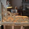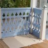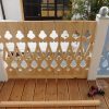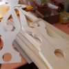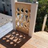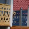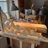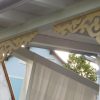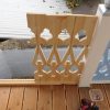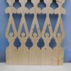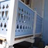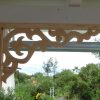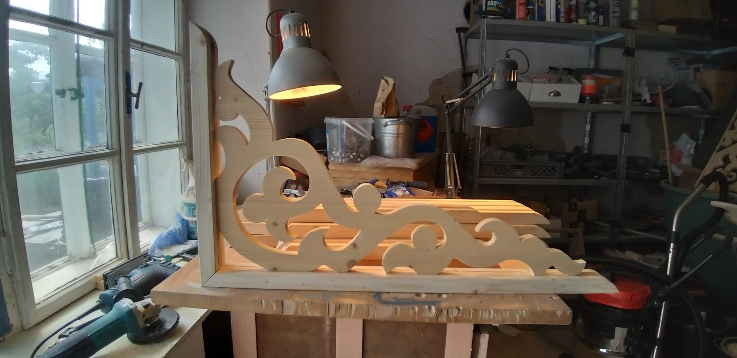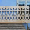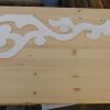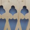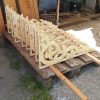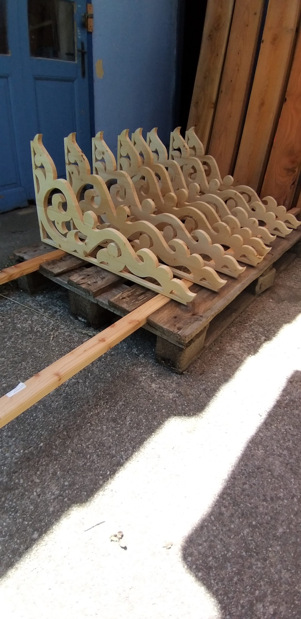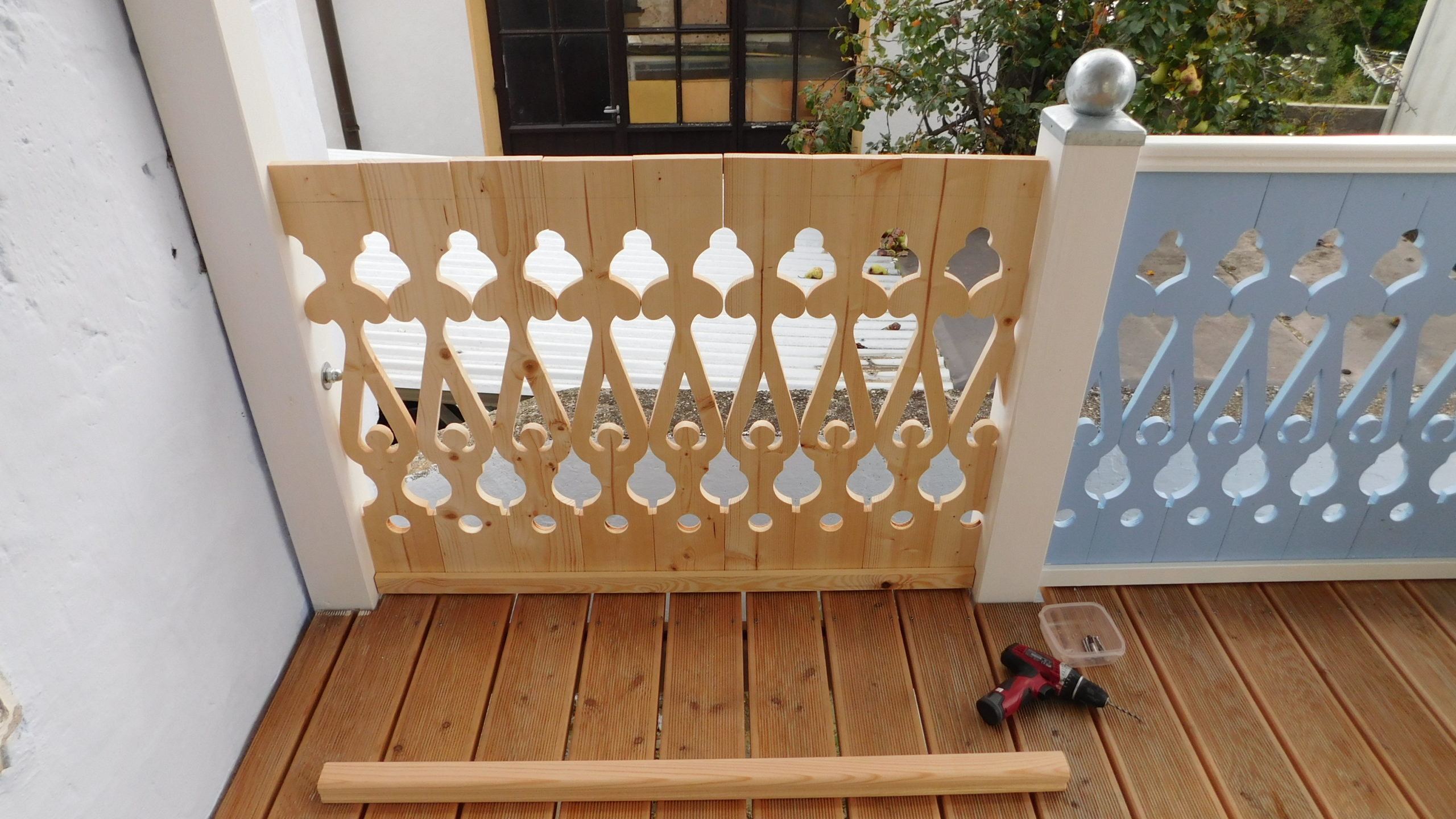 Nachdem das Geländer fertig war, fehlten noch die Verzierungen, die die Optik von Rundbögen vermitteln. Also habe ich hier wieder selbst etwas entworfen, dann eine Schablone gemacht und die auf Holz übertragen. Die ersten beiden Ecken wurden danach wieder verworfen, Korrekturen angebracht und schließlich alle zehn Elemente ausgesägt. Die Eckelemente wurde wieder auf Schienen gesetzt, die an die Pfosten verschraubt wurden. Zuletzt wurde noch mittig ein kleines Schluss-Element platziert.