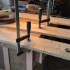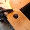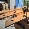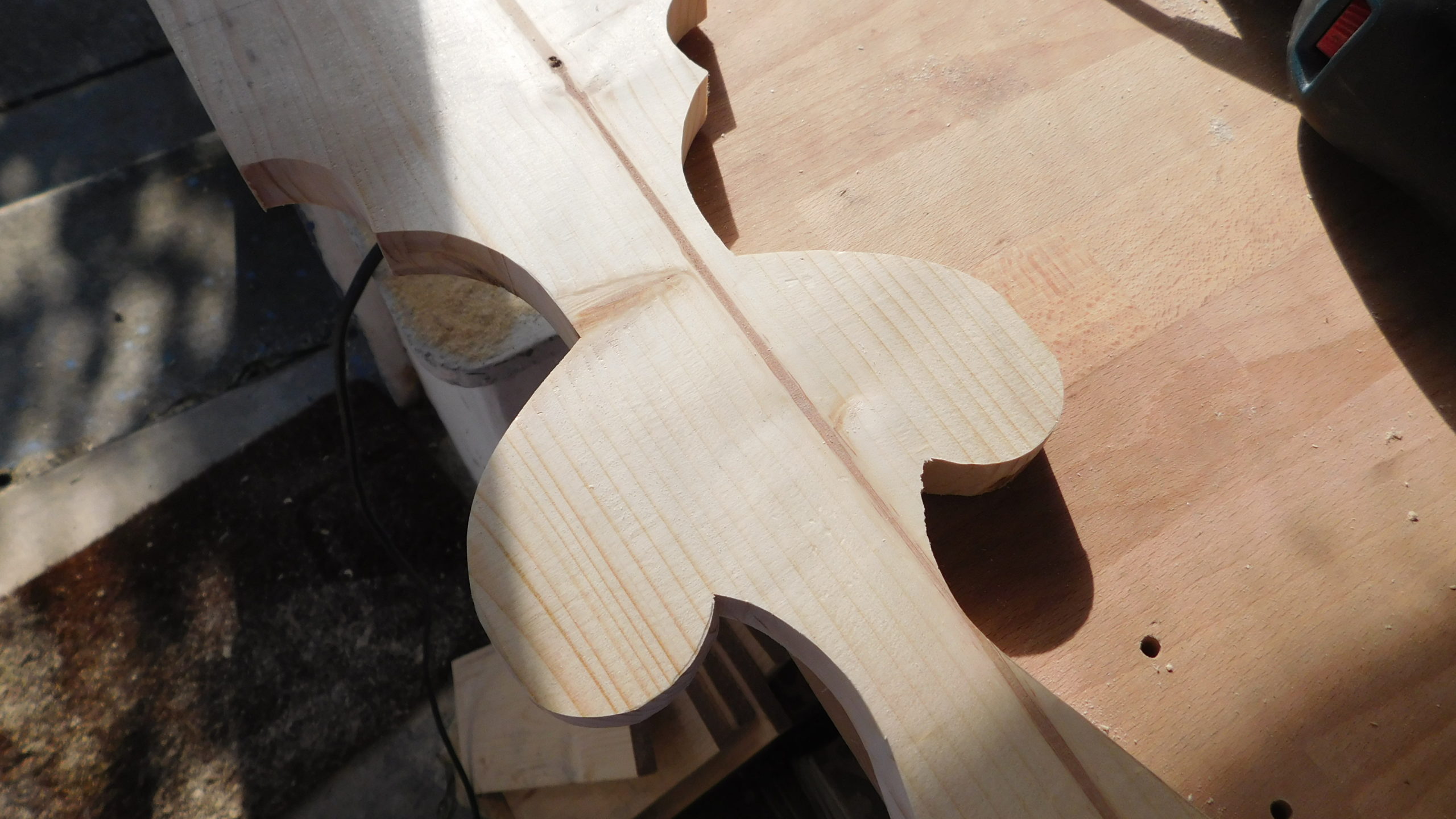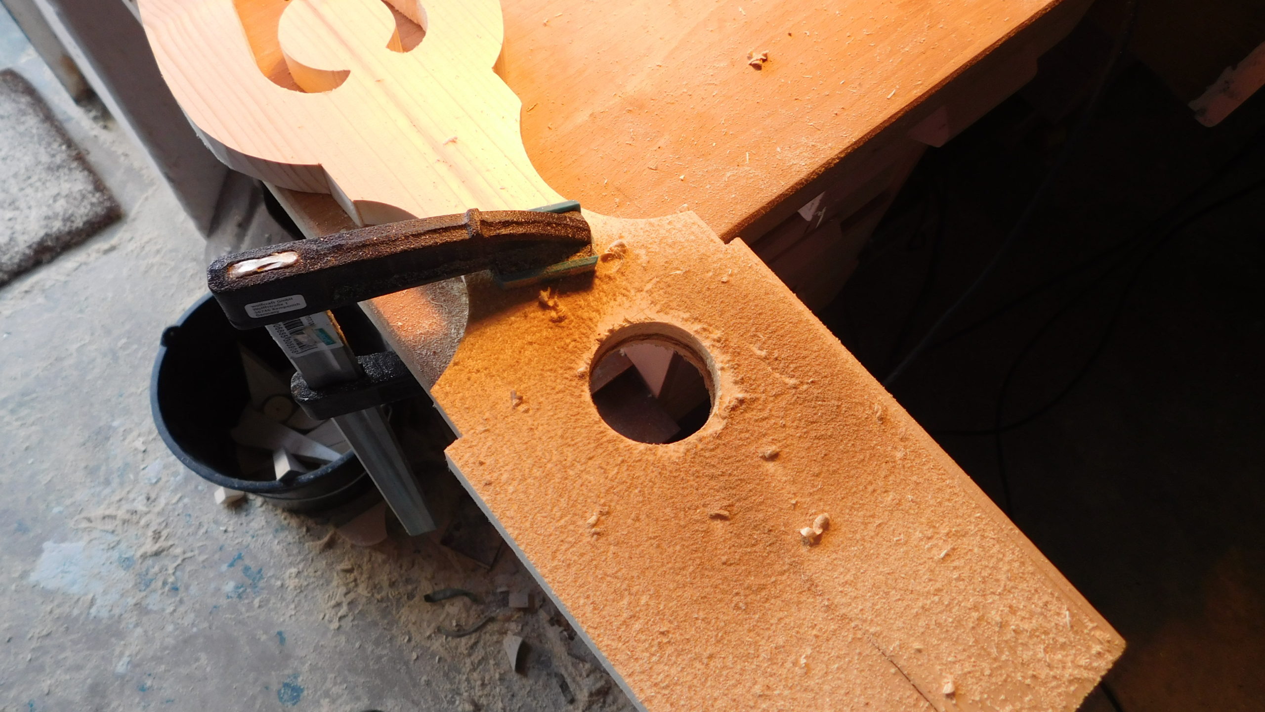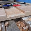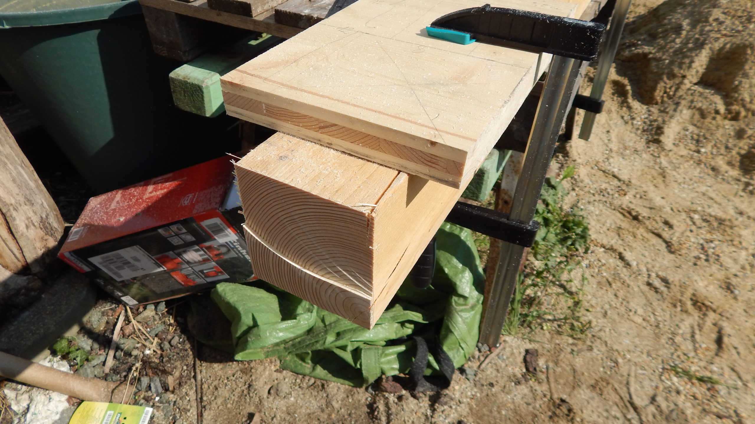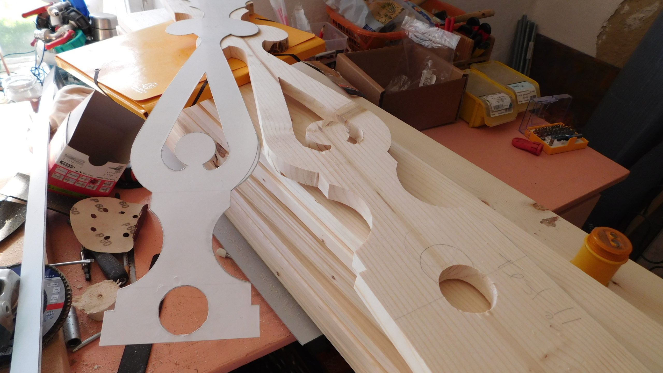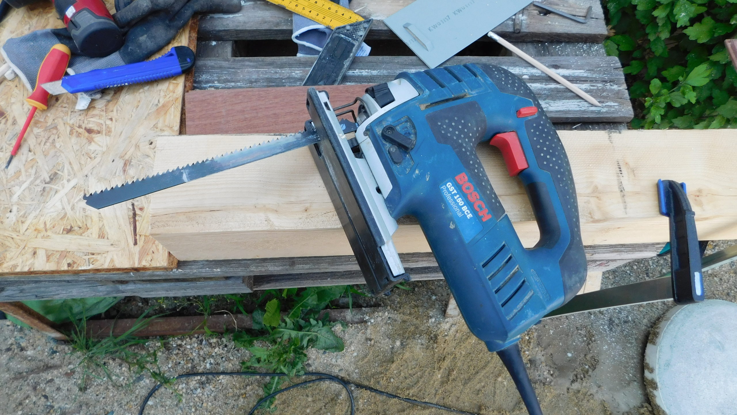 Die Konturen wurden mit der Schablone auf jedes einzelne Brett übertragen. Und dann wurde gesägt: Zuerst alle geraden Schnitte, dann alle Kurvenschnitte, dann die runde Aussparung. Jeder Schnitt hieß: Brett umspannen und neu festzwingen. Für die Treppe musste ich das Muster schräg ansetzen, damit das später gepasst hat.