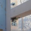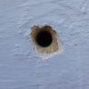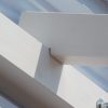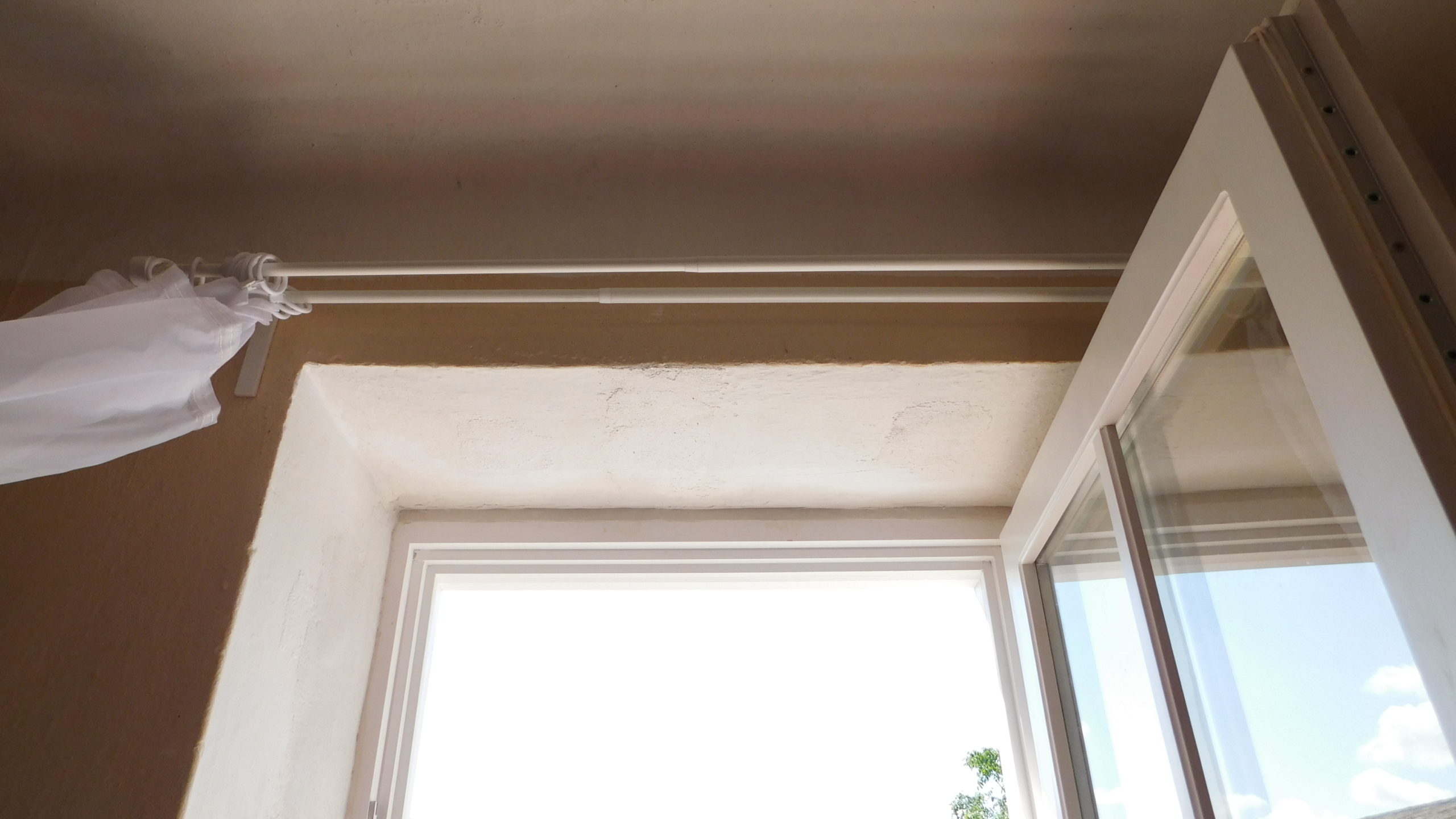 Aber der Reihe nach: Begonnen wurde mit den beiden hinteren senkrechten Pfosten. Hier wurden wieder Löcher vorgebohrt, durch die dann mit Betonbohrern in die Wand vorgebohrt wurde. Dann wieder die Pfosten entfernen und die Löcher für die Siebhülsen in der richtigen Größe bohren. Für die Pfosten musste ein Teil des Stucks weggestemmt werden. Diese Pfosten wurden in aufschraubbare Pfostenhülsen gesetzt und verschraubt.