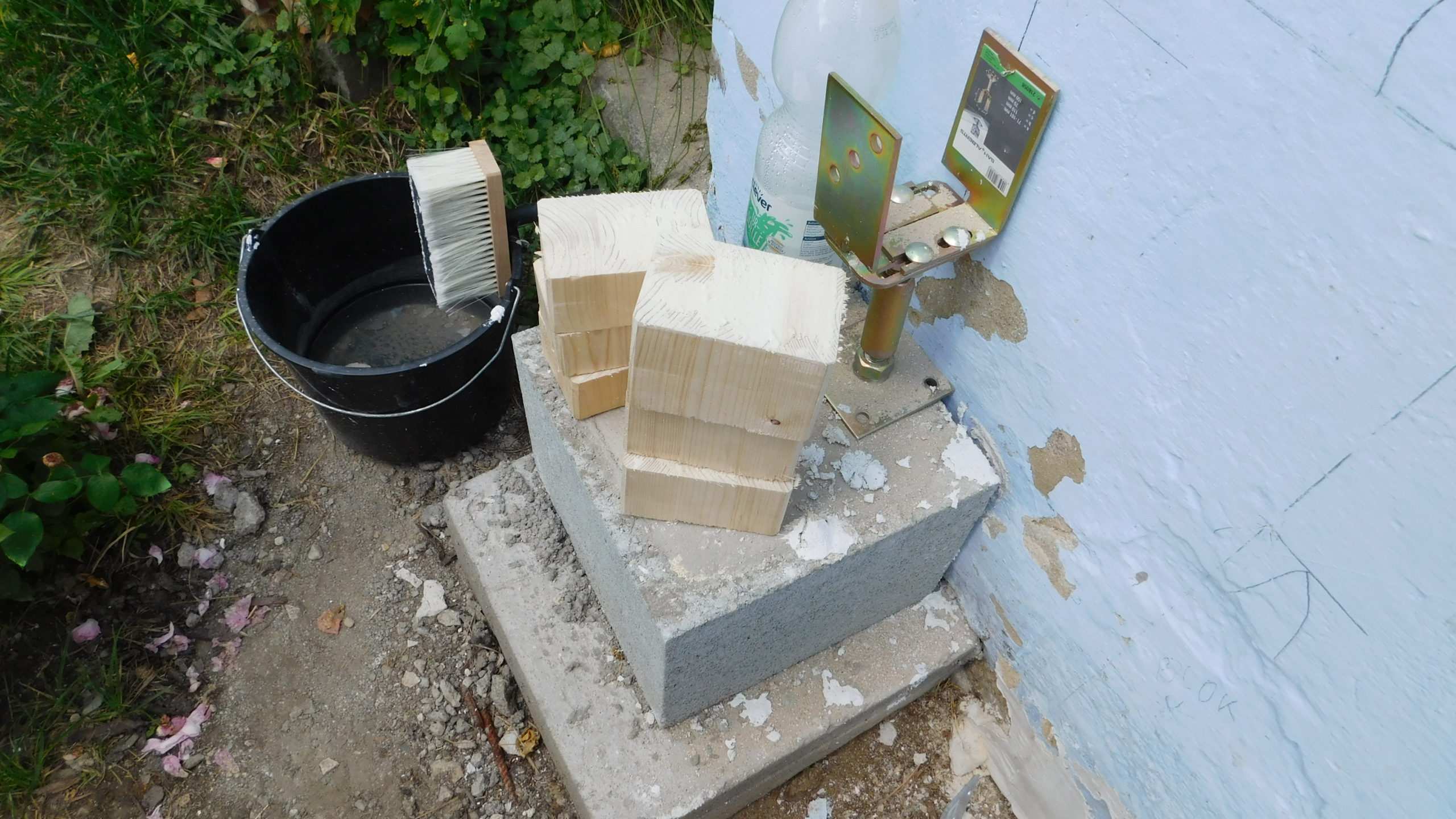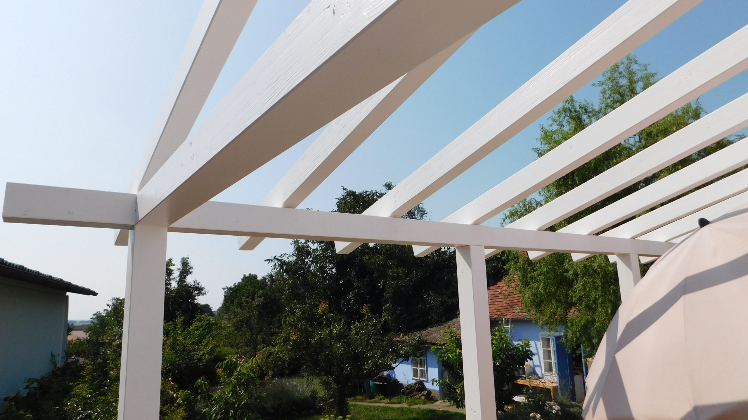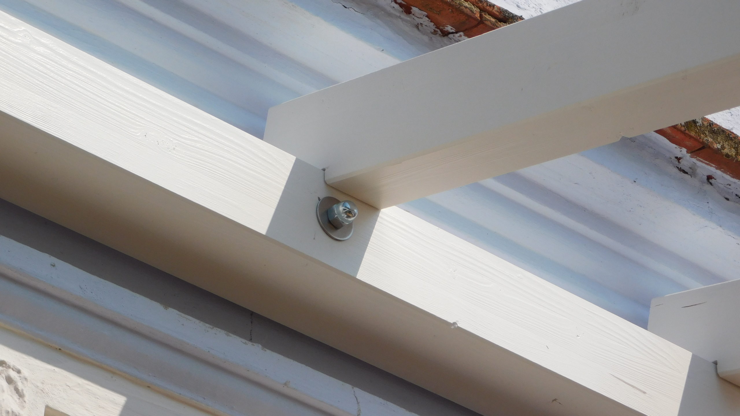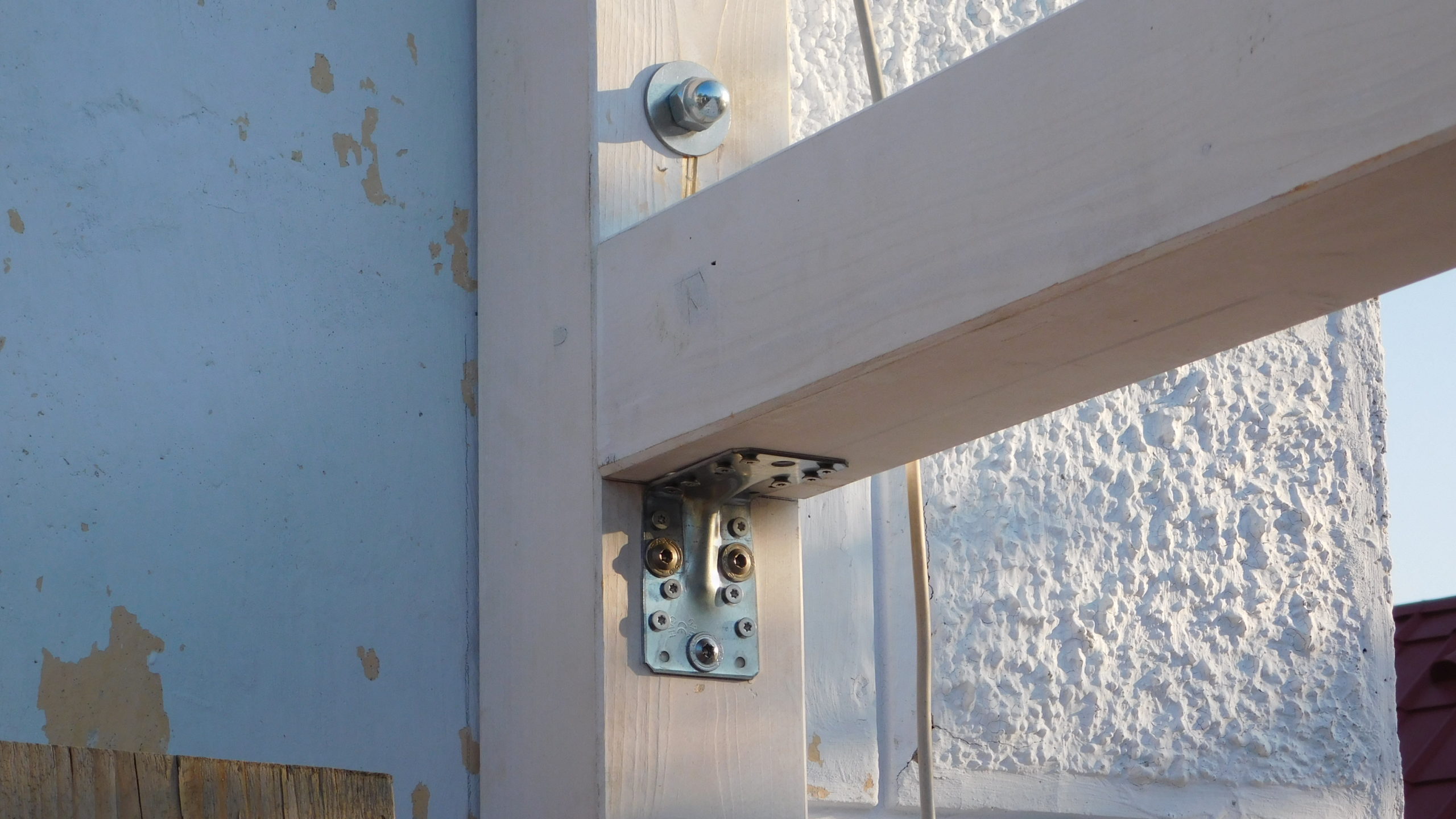 Den nächsten Schritt – die Oberkonstruktion – habe ich sehr sorgfältig geplant. Denn zumindest für den ersten Teil braucht man mehr als zwei Hände, das geht nicht mehr allein. Ich habe sämtliches Holz, das bis zum Schluss verwendet werden sollte, hier bereits vorab gestrichen, weil ich mir das „Über-Kopf-Malen“ gerne ersparen wollte. Bei der Oberkonstruktion gab es gleich mehrere heikle Punkte: Die hinteren senkrechten Pfosten, die mit dem Mauerwerk verbunden werden mussten. Dann den oberen tragenden Querbalken, auch er musste mit dem Mauerwerk verbunden werden. Dann, natürlich die Eckpunkte, die exakt ineinander passen mussten. Und schließlich auch die Schrägen, die ebenfalls exakt liegen mussten.