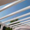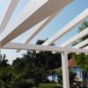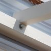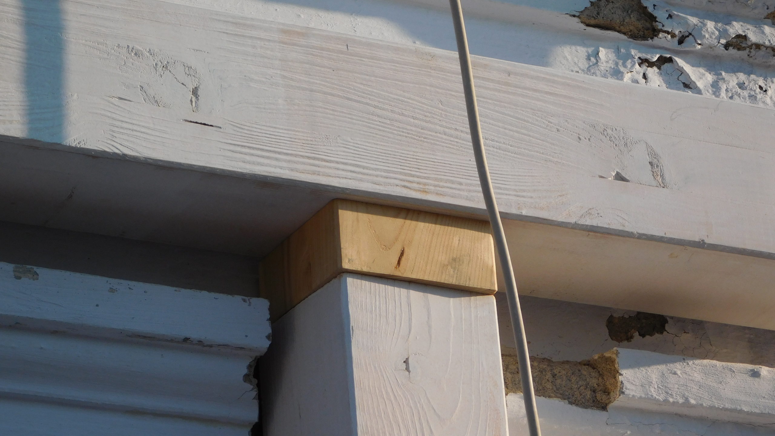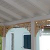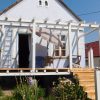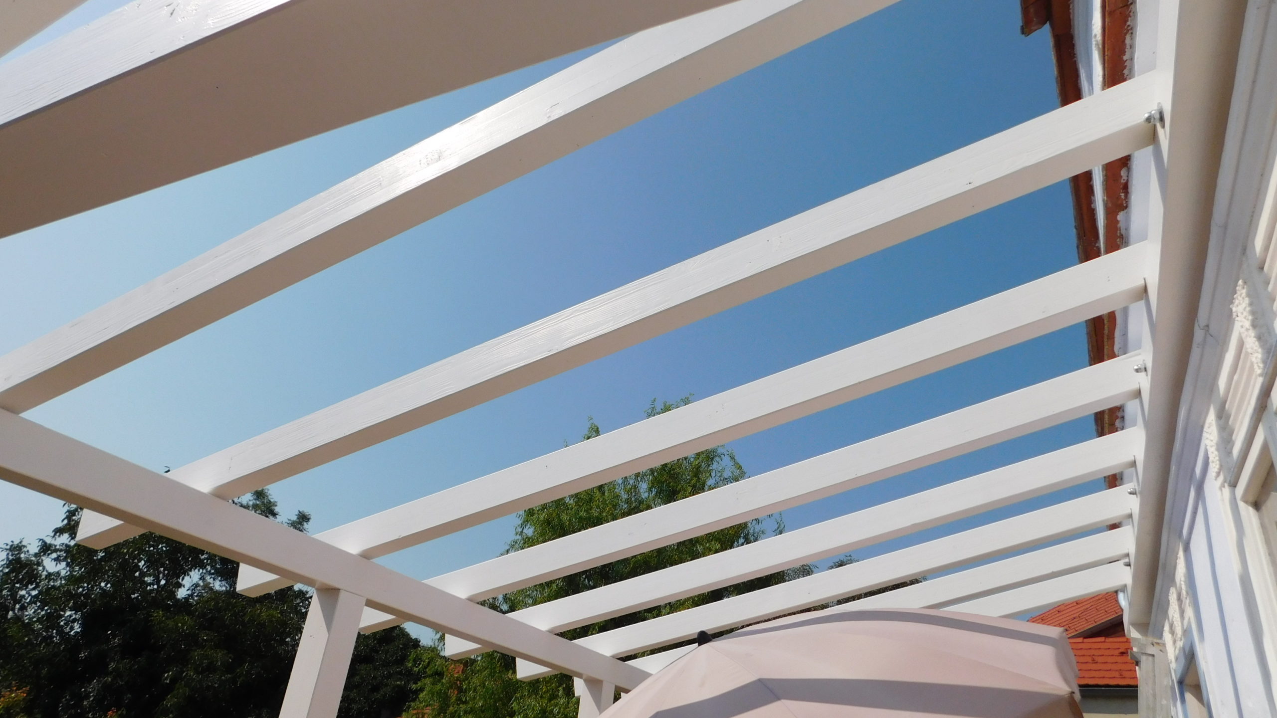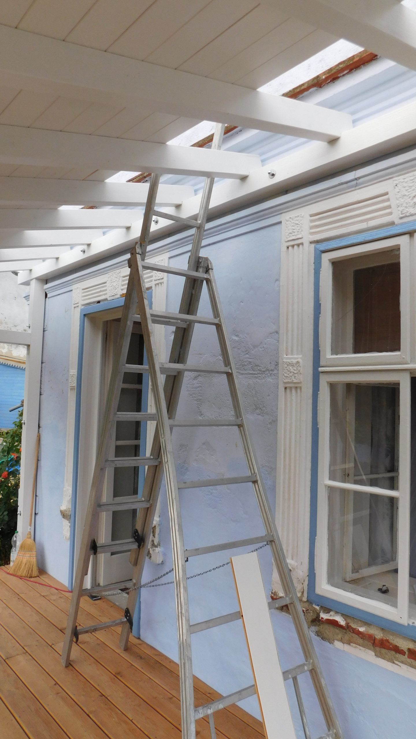 Den nächsten Schritt – die Oberkonstruktion – habe ich sehr sorgfältig geplant. Denn zumindest für den ersten Teil braucht man mehr als zwei Hände, das geht nicht mehr allein. Ich habe sämtliches Holz, das bis zum Schluss verwendet werden sollte, hier bereits vorab gestrichen, weil ich mir das „Über-Kopf-Malen“ gerne ersparen wollte. Bei der Oberkonstruktion gab es gleich mehrere heikle Punkte: Die hinteren senkrechten Pfosten, die mit dem Mauerwerk verbunden werden mussten. Dann den oberen tragenden Querbalken, auch er musste mit dem Mauerwerk verbunden werden. Dann, natürlich die Eckpunkte, die exakt ineinander passen mussten. Und schließlich auch die Schrägen, die ebenfalls exakt liegen mussten.