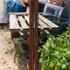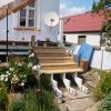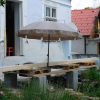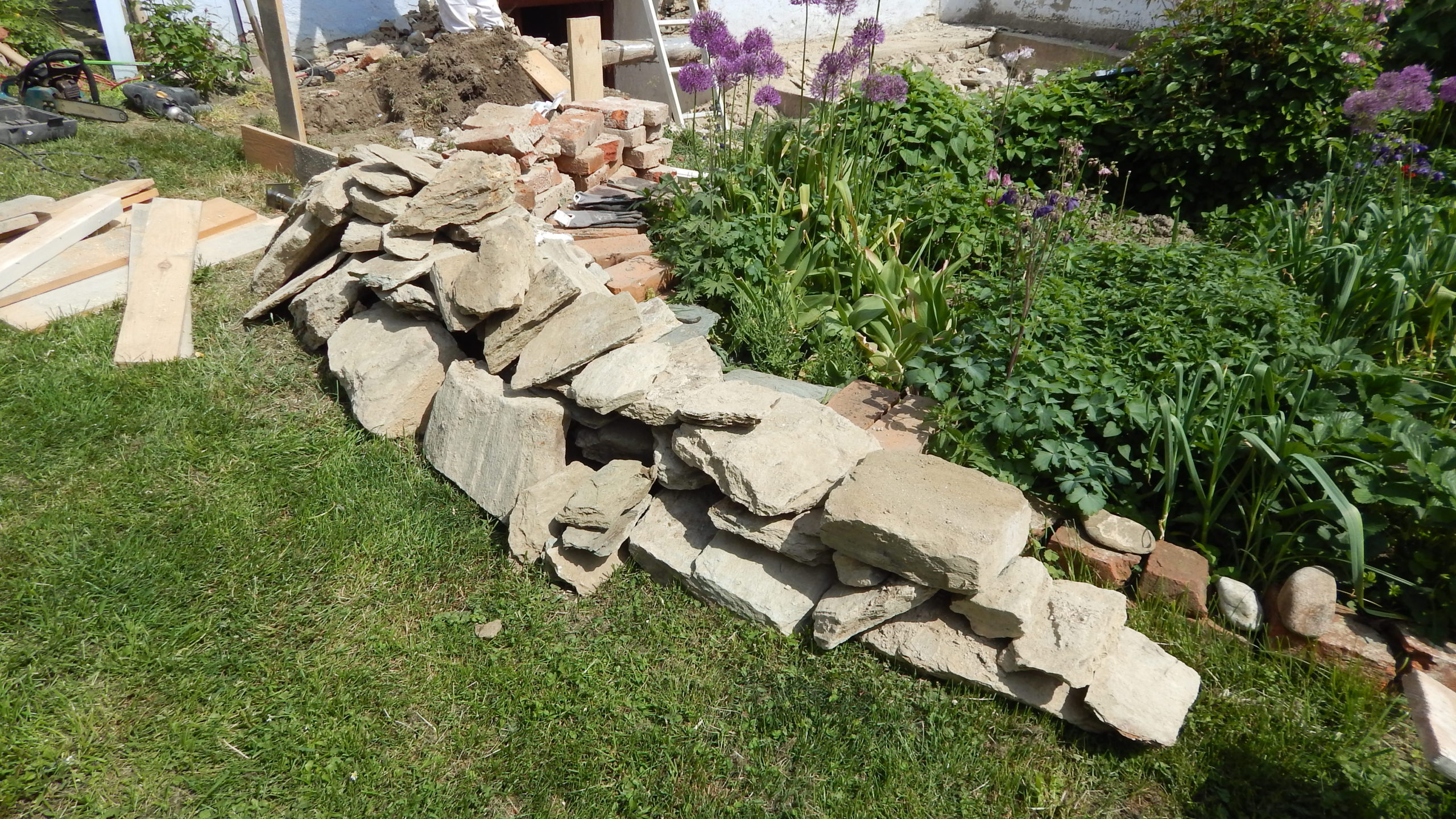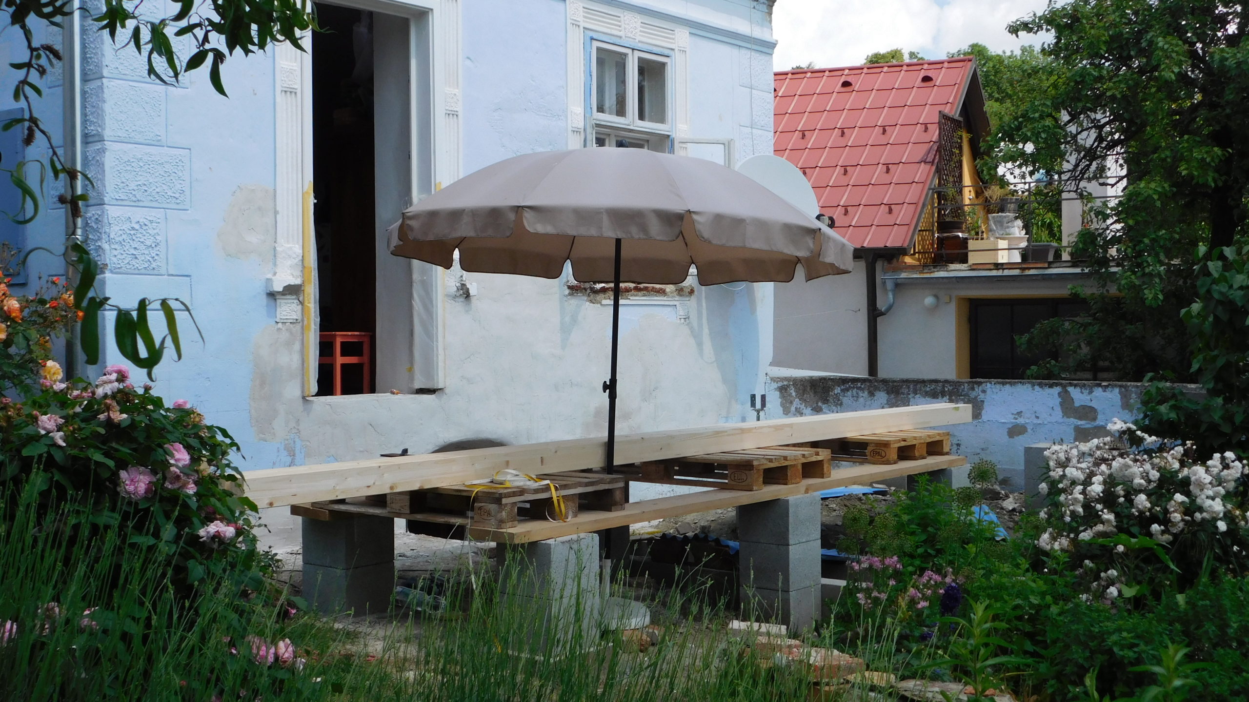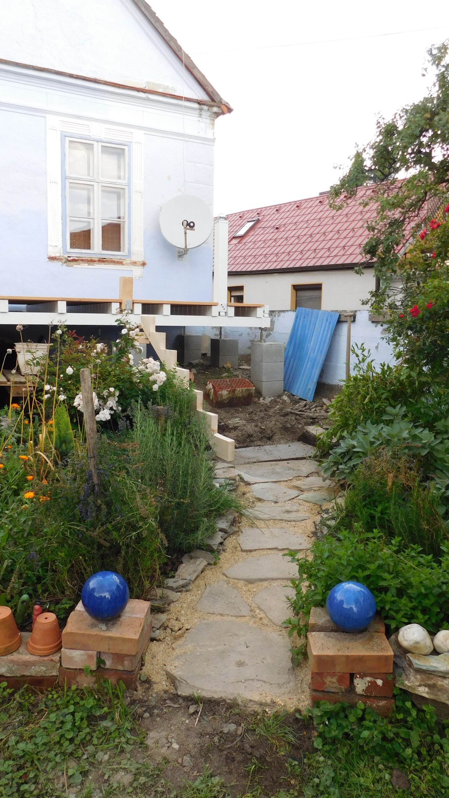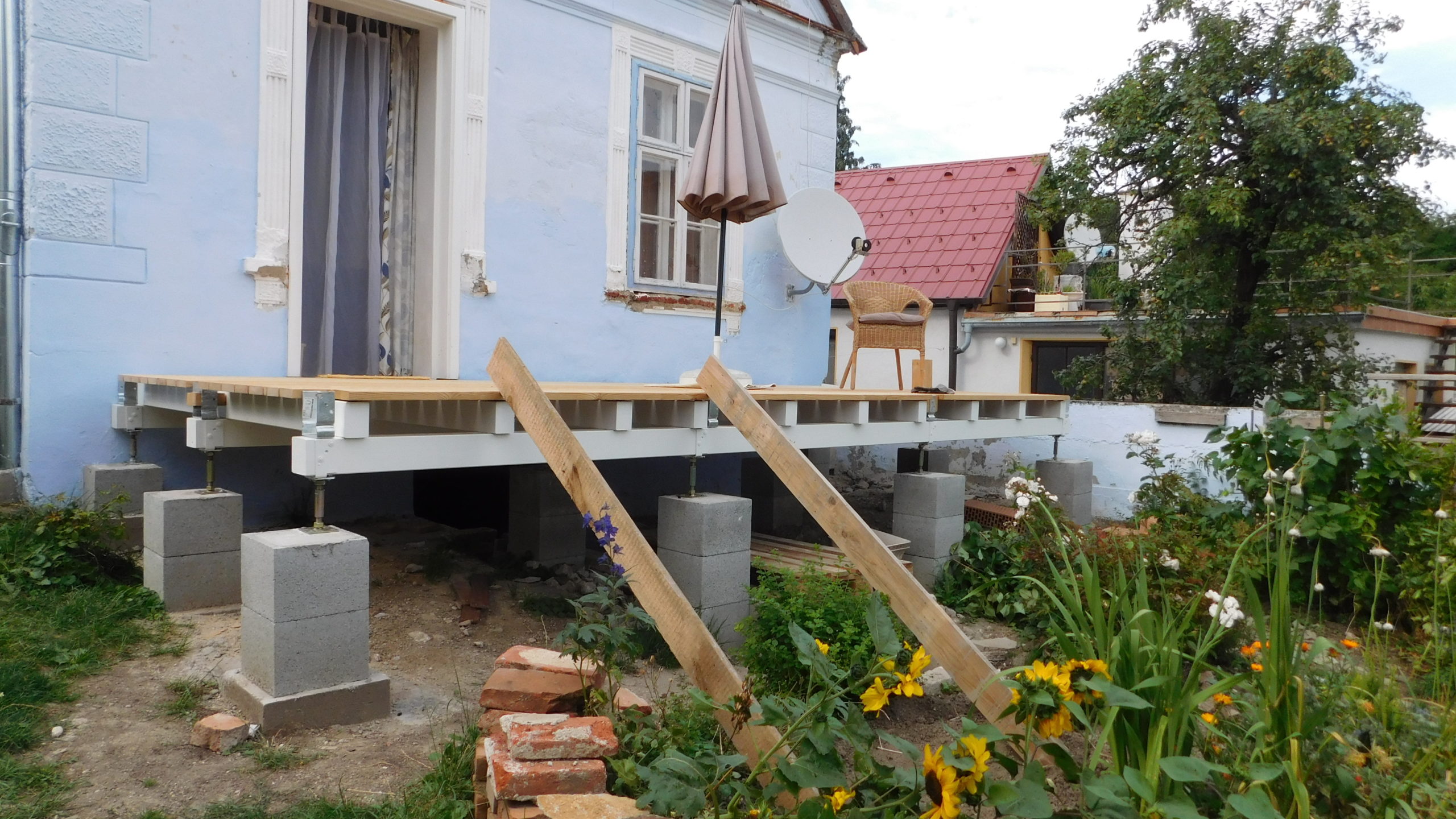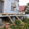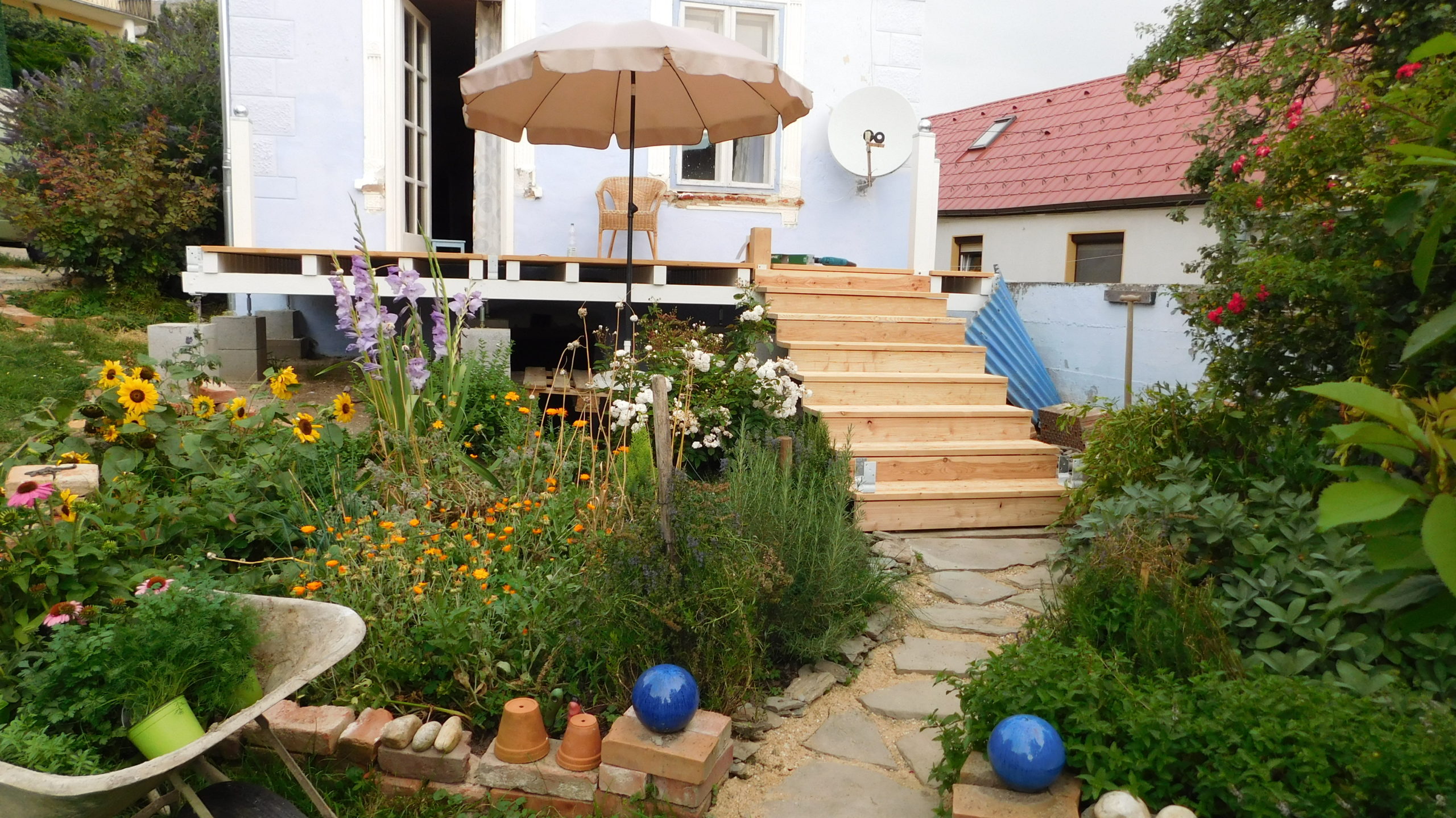 Auch ein Gewächshaus (das ich in einem eigenen Projekt beschrieben habe) war da. Sowohl der Vorbau des Kellereingangs als auch das Gewächshaus mussten weichen. Ein etwas schwieriger Teil war, die Neigung des Daches exakt zu berechnen, aber mit ein, zwei Versuchen war auch das geschafft, auch dazu gibt es eigene Online-Rechner. Zu entscheiden war weiter, auf welcher Seite der Durchbruch aus dem Haus erfolgen sollte und auf welcher Seite sich der Treppenaufgang zur Veranda befinden sollte. Bezüglich des Treppenaufgangs war letztlich entscheidend, dass der Kräutergarten direkt vor dem Haus erhalten bleiben sollte UND ich mir nicht vorstellen konnte, am Rand zu den Nachbarn zu sitzen, auch wenn das auf den ersten Blick die räumlich bessere Lösung gewesen wäre.