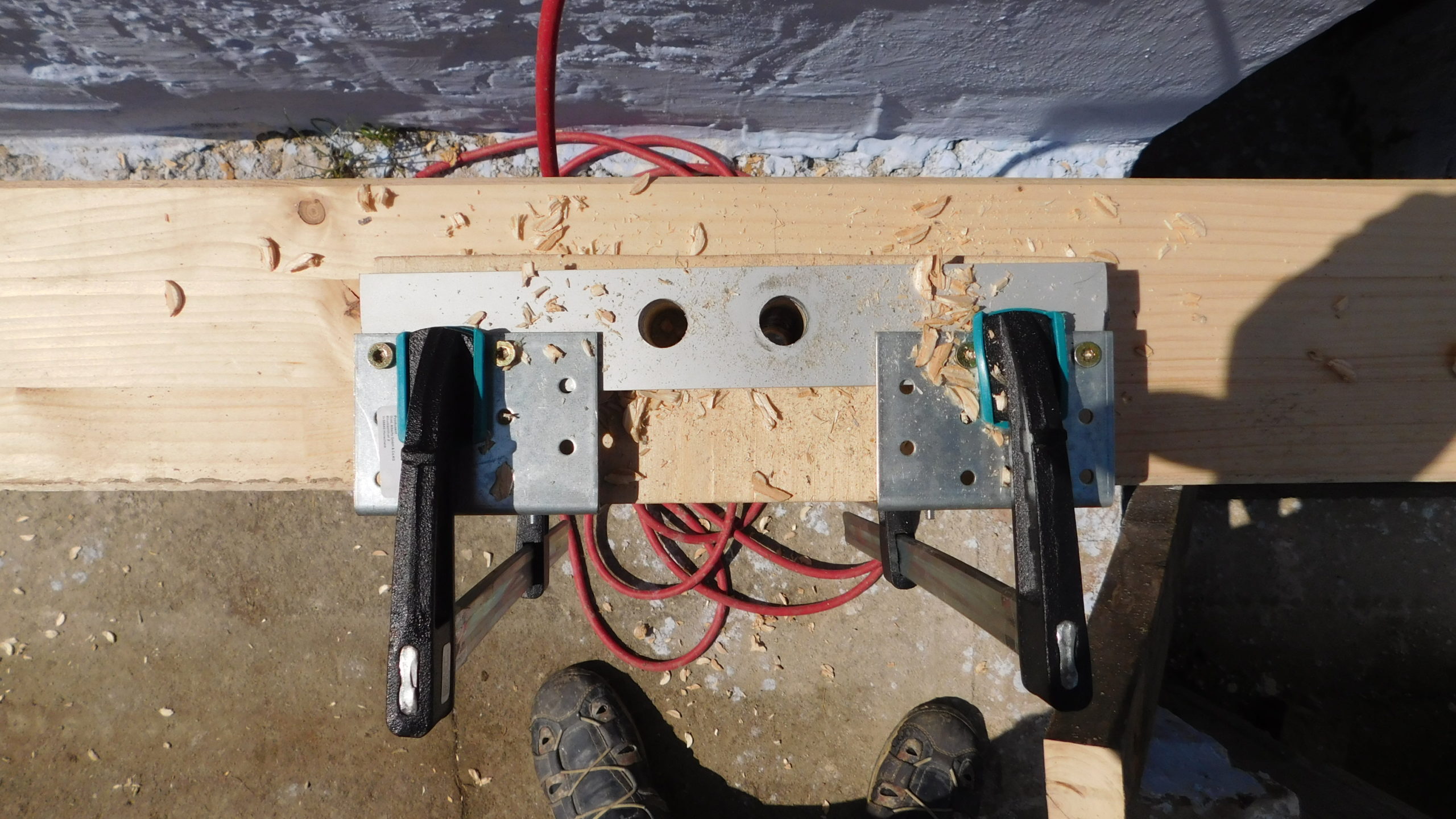 Eine erste echte Herausforderung war die Verbindung des hinteren Quer-Pfostens mit dem Mauerwerk. Hierfür wurden Löcher (Holz-Bohrer-Größe 24) durch den Pfosten gebohrt, danach wurde der Pfosten in die Balkenschuhe gelegt, provisorisch mit Schrauben fixiert und durch die vorhandenen Löcher wurden nun in das Mauerwerk gebohrt, natürlich zunächst mit einem schmäleren Bohrer. Dann wurde der Pfosten entfernt, die Löcher ins Mauerwerk wurden in der richtigen Größe gebohrt, die Bohrlöcher wurden ausgesaugt. Siebhülsen wurden zugeschnitten (ganz einfach mit dem Trennschleifer und Metallscheibe) und in die Löcher gesteckt. Dann wurden die Gewindestangen vorbereitet, natürlich länger als die Enderversion, damit man hier Platz zum Einschlagen hat. Dann wurde Injektionsmörtel in die Siebhülsen gespritzt, Achtung: Hier unbedingt (!) die empfohlene Menge einhalten. Ich habe bei diesem ersten Querpfosten zu viel hineingespritzt (viel ist nicht immer gut) und um ein Haar hätte ich alles wieder herausbohren müssen, weil der Mörtel a) schnell abbindet und b) Platz braucht.