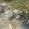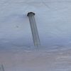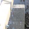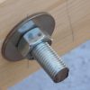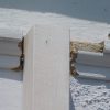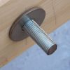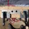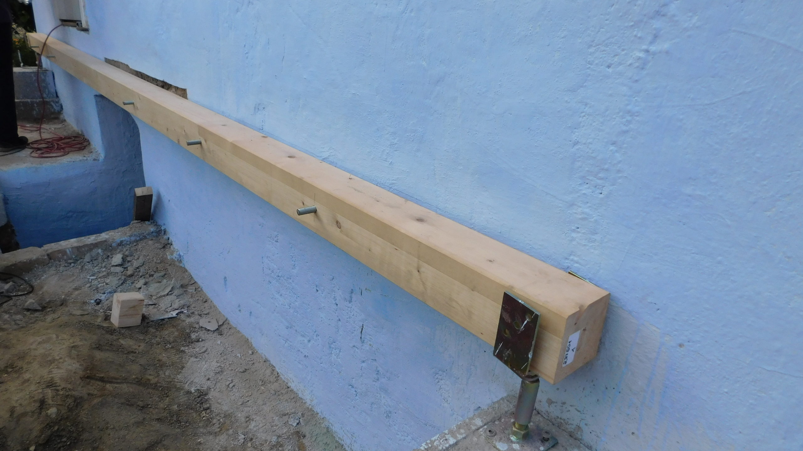 Nachdem der Mörtel eingespritzt war, wurde der Balken wieder eingerichtet und die Gewindestangen wurden durch die Bohrlöcher ins Mauerwerk eingeschlagen, fast wäre das trotz des großen Vorschlaghammers nicht gelungen, weil das Einschlagen aufgrund der zu hohen Füllmenge viel Kraft erfordert hat. Nach einem Tag Trockungszeit wurde auf die Gewindestangen zunächst Beilagscheibe und Mutter aufgeschraubt, die Stange wurde direkt an der Mutter abgesägt. Danach wurde die Mutter durch eine Hutmutter getauscht.