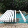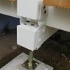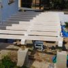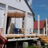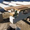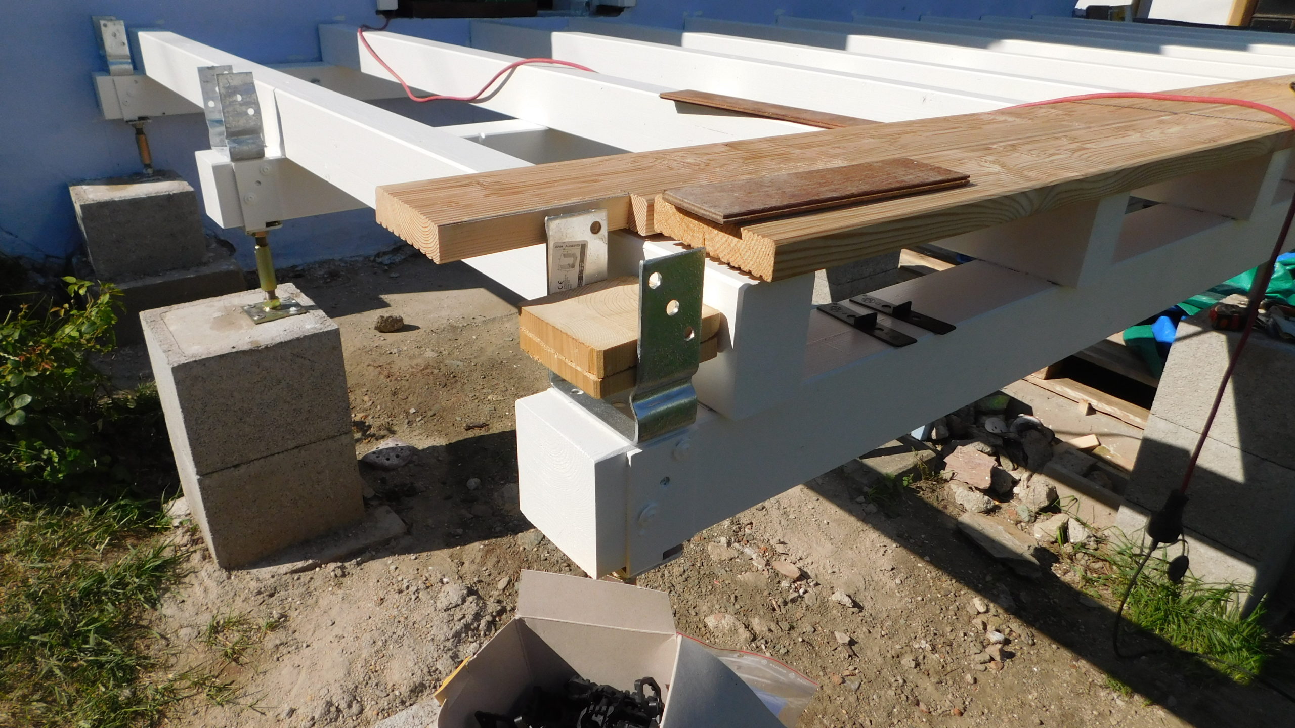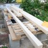 Nach dem Aufschrauben der Balkenschuhe auf alle 12 Sockelfundamente wurden die tragenden Querpfosten in die Schuhe gelegt. Dabei muss man berücksichtigen, dass Holzpfosten von 6 Meter Länge in der Mitte um etwa 1-2 cm durchhängen. Das sieht man zwar nicht mit freiem Auge, aber man weiß es. Also muss man hier sehr exakt mit Wasserwaage arbeiten, damit der Pfosten schlussendlich korrekt liegt. Wichtig war hier nun, die exakte Höhe des künftigen Durchgangs erneut zu messen. Für drinnen habe ich deshalb ein Modell des künftigen Bodens gebaut, für draußen ein Modell des geplanten Verandabodens. Diese beiden Modelle haben dazu gedient, die Balkenschuhe auf die richtige Höhe zu bringen.