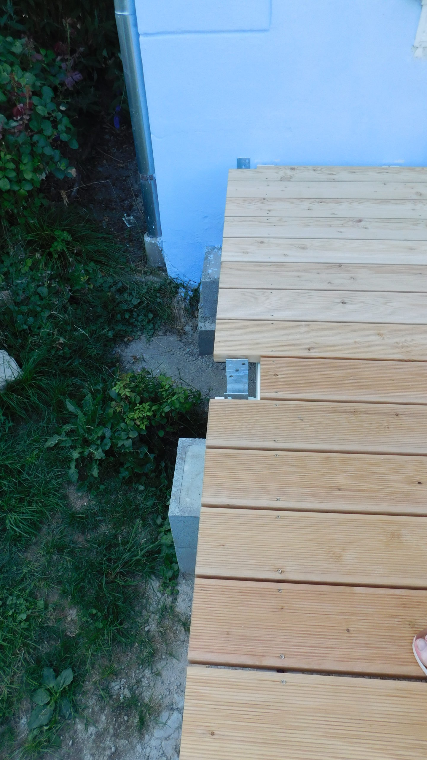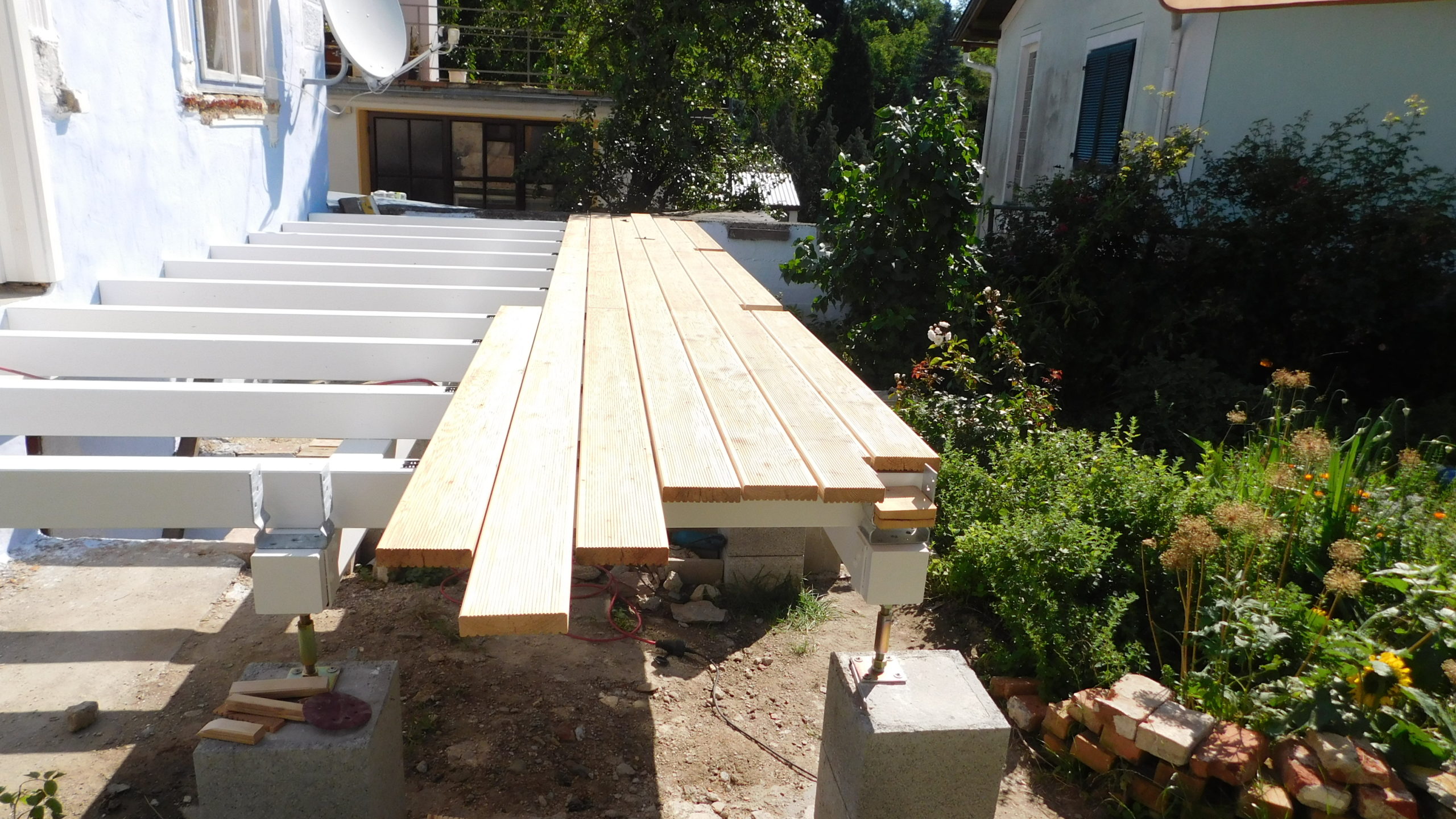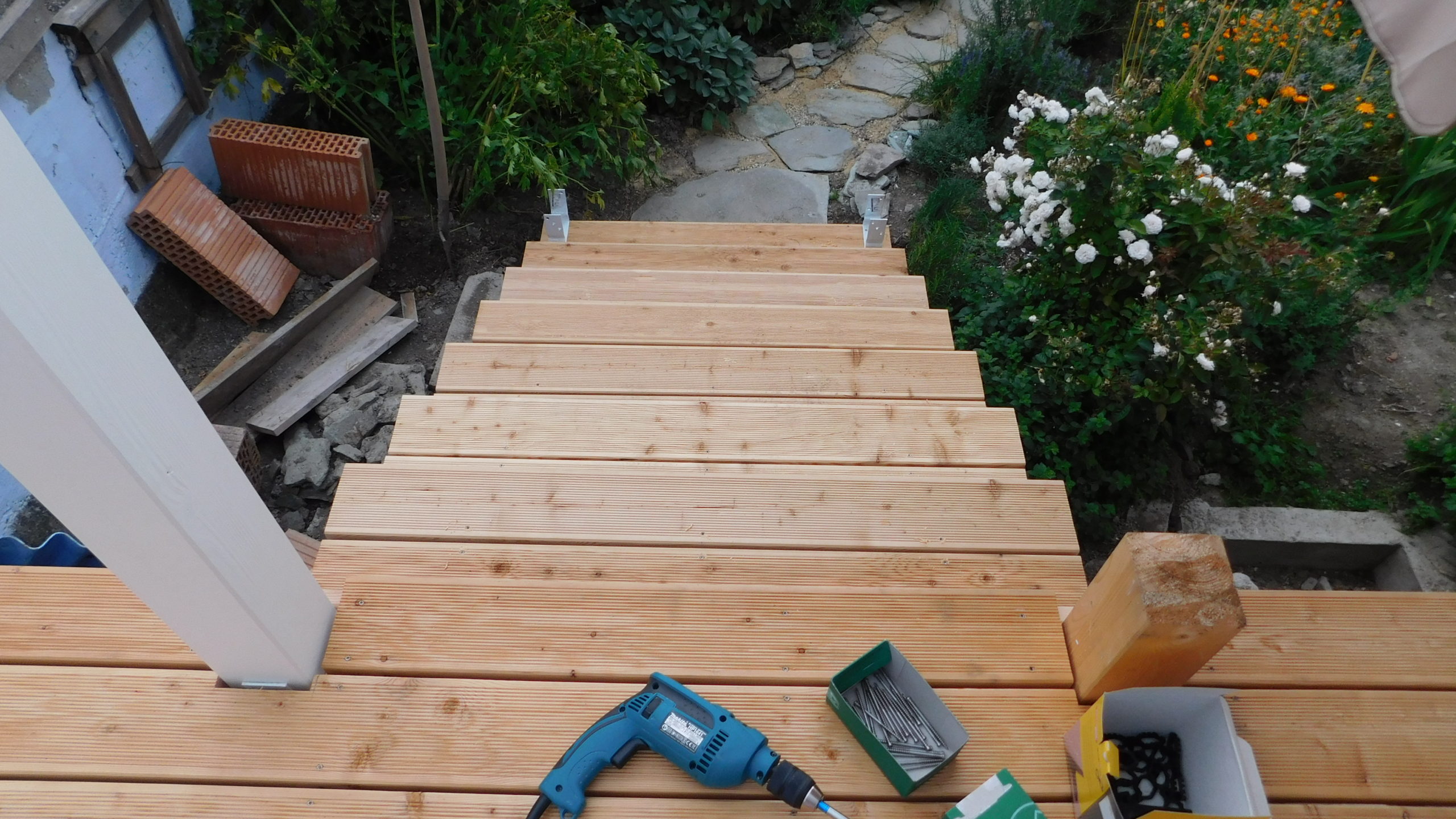 Die Terrassendielen wurde von vorne nach hinten zur Mauer verschraubt, d.h. die erste Diele lag an der Front. Hier wurde mit ganzer Länge der Dielen (4 Meter) gearbeitet und die ganze Länge wurde jeweils in der Richtung geändert: Eine Länge lag die volle Länge links, in der nächsten rechts. Die Dielen wurden Daumen-mal-Pi abgelängt, der exakte Rand-Schnitt ist erst nach vollständiger Verschraubung des Bodens erfolgt. Für die stehenden Pfosten habe ich Reste des Ablängens als Platzhalter genommen.