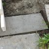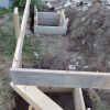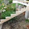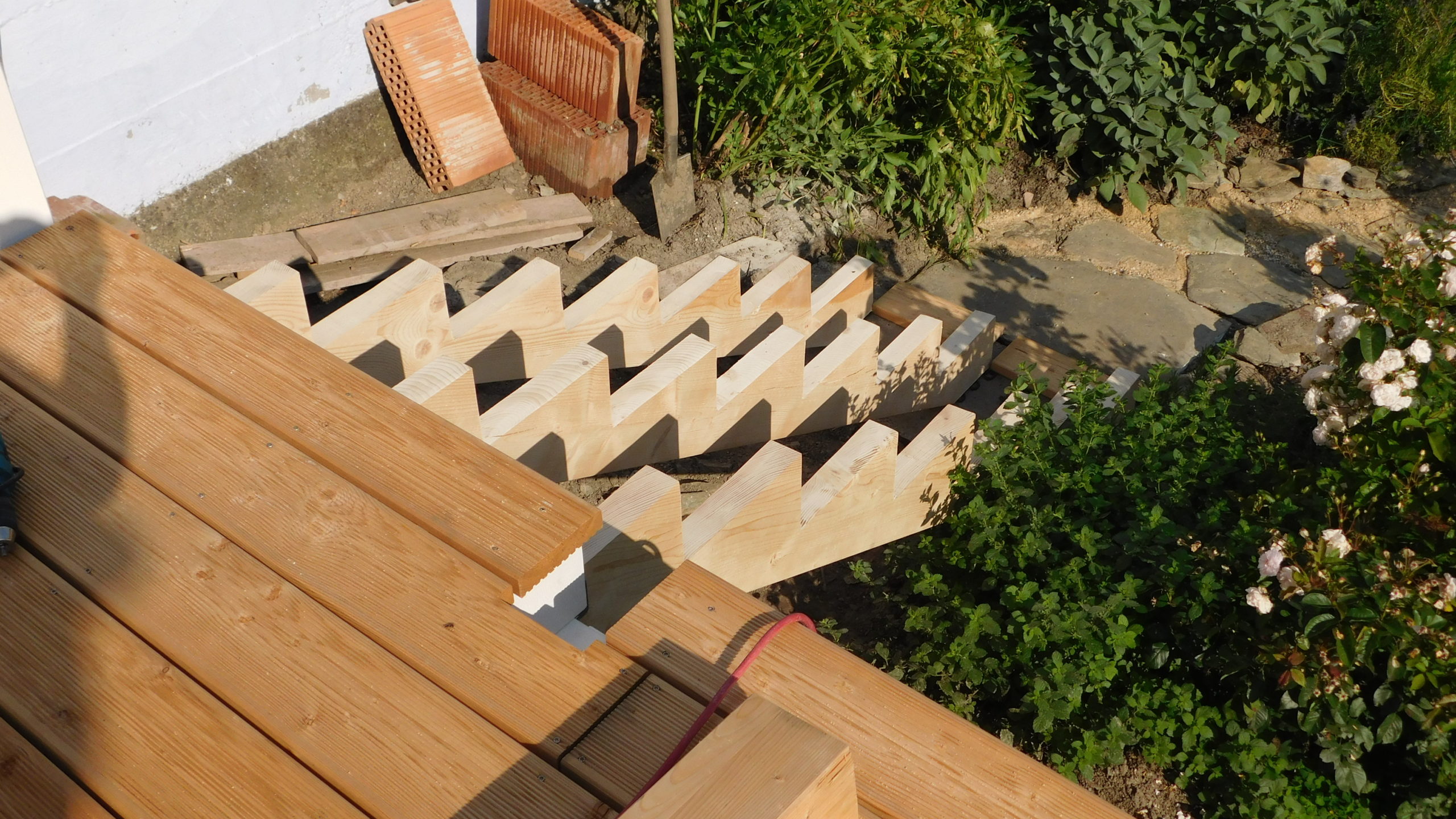 Nachdem die Treppe exakt berechnet war, habe ich das Muster der Steigung der Treppe auf dicke Holzbretter übertragen und dann entsprechend ausgesägt. Damit auch alles wirklich gut hält, habe ich drei der dicken Bretter für die Treppenkonstruktion genommen. Für den Fuß der Treppe habe ich ein kleines Fundament gegossen: Ausgegraben, geschottert, Eisen rein, betoniert, fertig. Auf dieses Dokument habe ich die Holztreppe aufgesetzt, allerdings nicht direkt Holz-auf-Stein sondern natürlich mit Abstandshalter, so dass das Holz nicht durch ständige Nässe am Boden beeinträchtigt wird.
