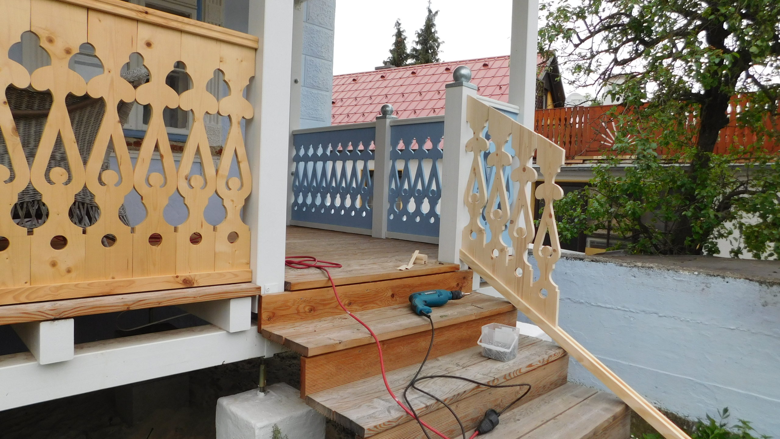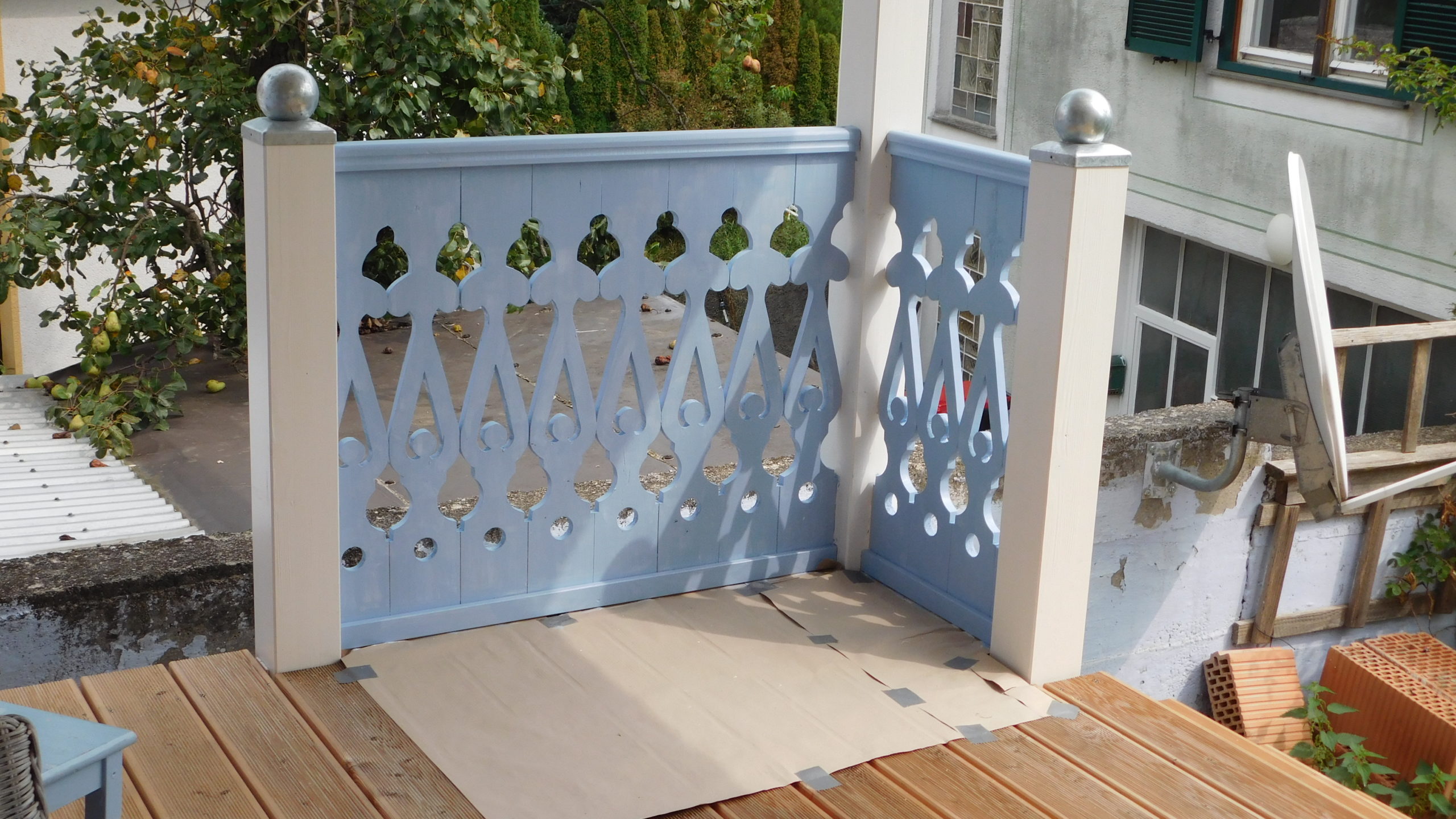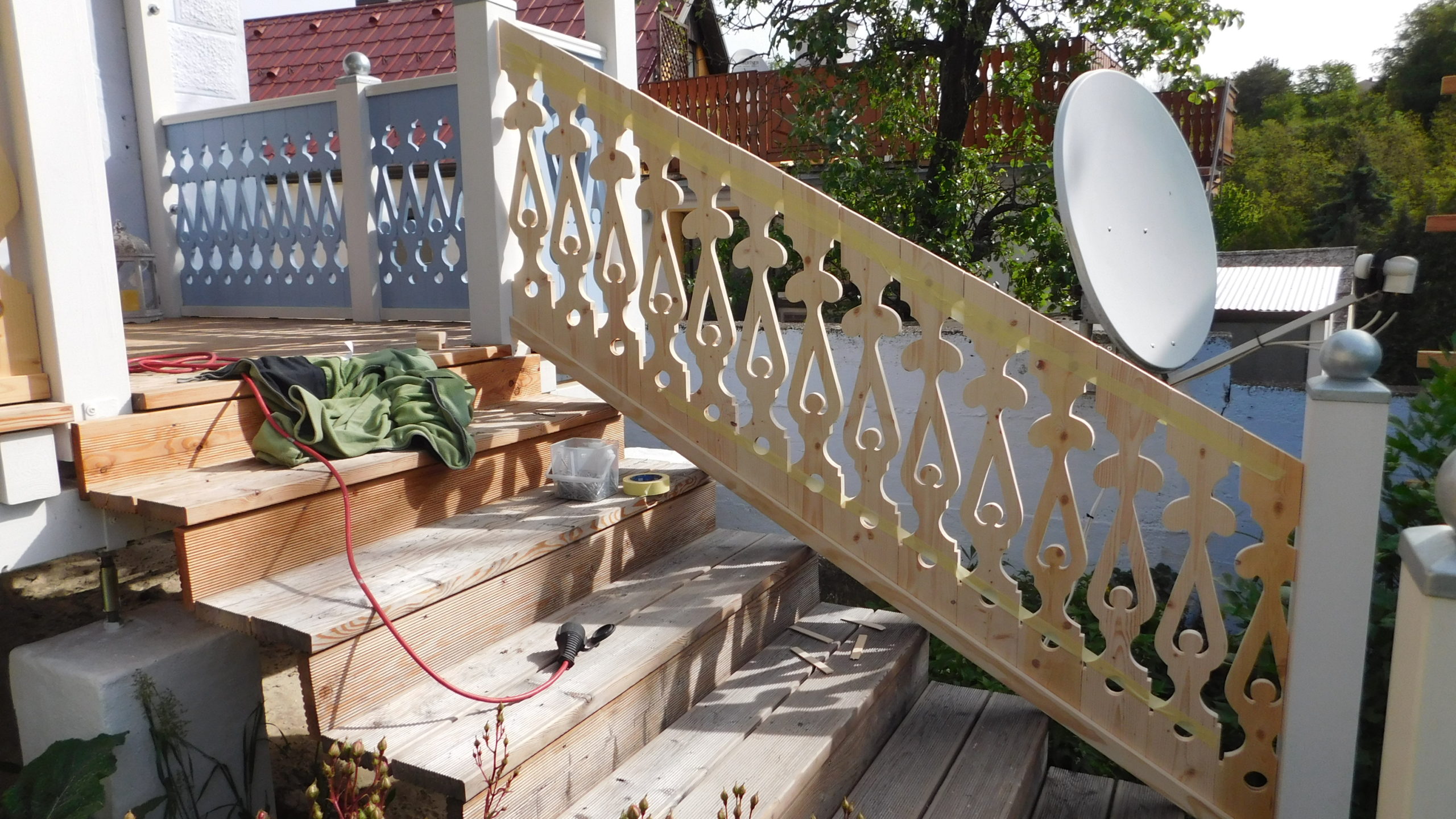Die Fertigung des Geländers habe ich nicht im ersten Jahr geschafft, da lag ein Winter dazwischen. Und ich habe mir mehr als einmal gedacht: Warum hast du das bloß angefangen? Aber ich wollte so ein Geländer haben und das war der einzige Weg es zu bekommen. Das Geländer habe ich vor der Montage nur mit Anti-Schimmel behandelt, erst nachdem es montiert war, habe ich hier Grundierung und Farbe aufgetragen. Ein kleines Hoppala ist mir beim Geländer passiert: Ich habe das Kabel einer Kabeltrommel übersehen und das läuft jetzt vom Wohnzimmer unter dem Geländer durch. Kann nur noch entfernt werden, indem man es durchschneidet.