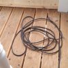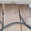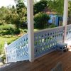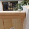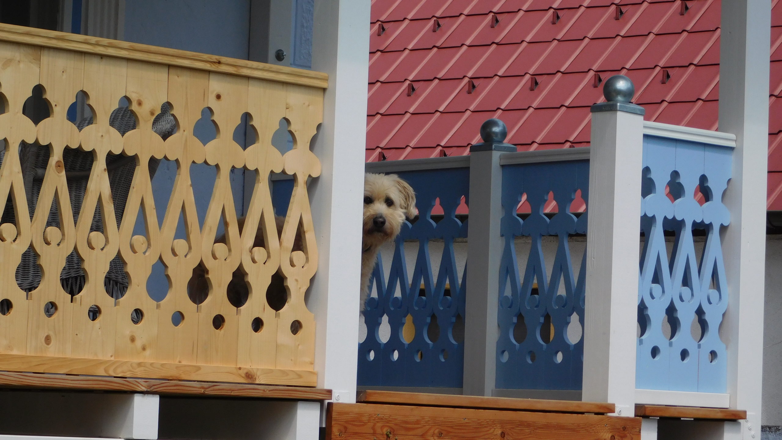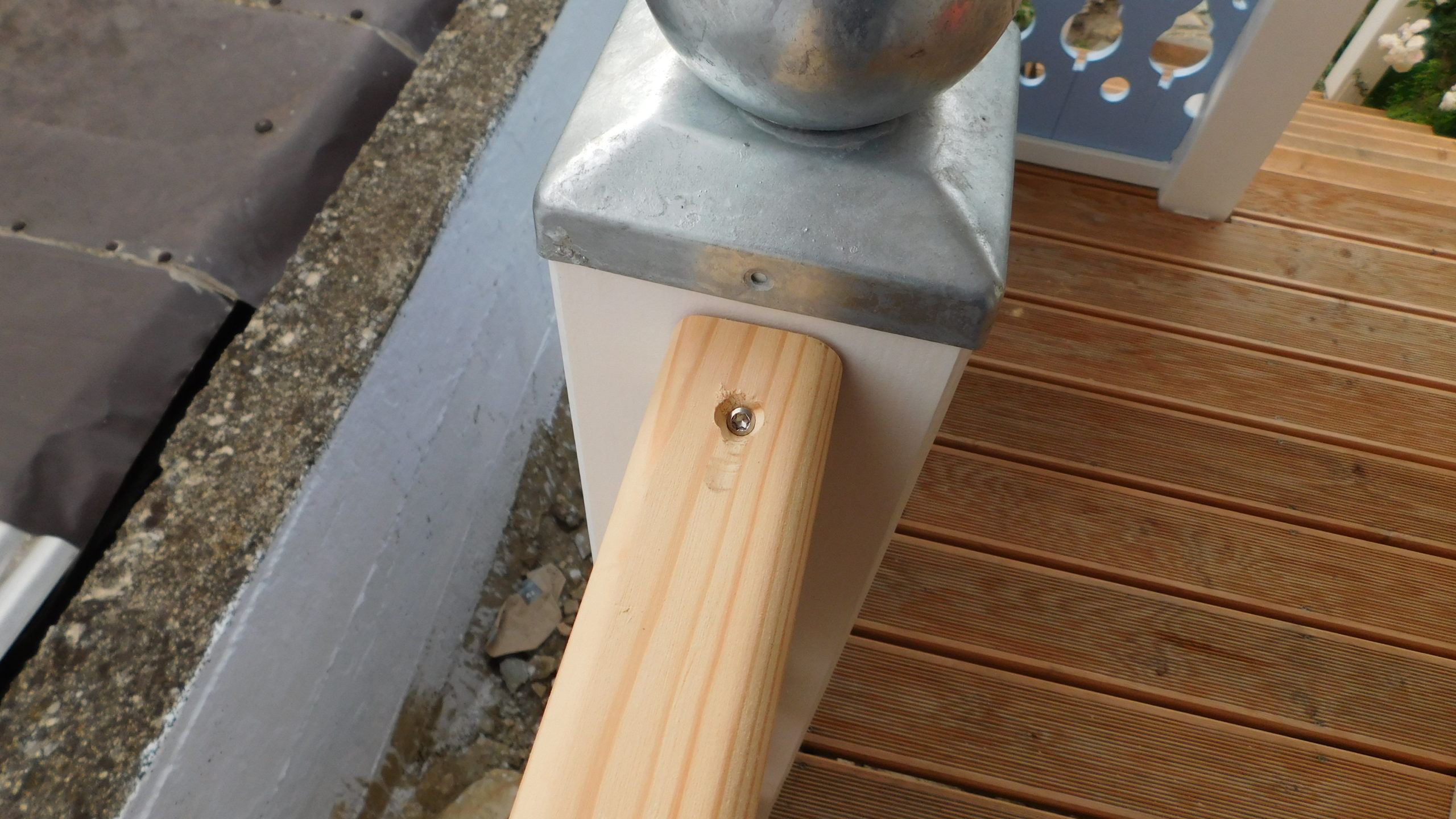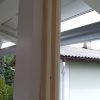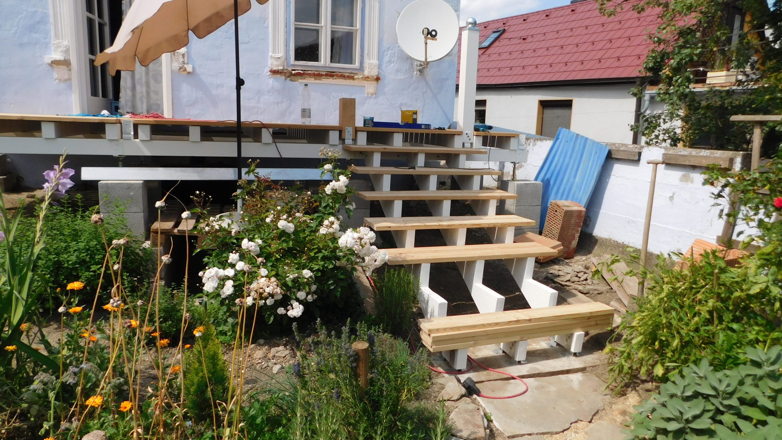 Die Fertigung des Geländers habe ich nicht im ersten Jahr geschafft, da lag ein Winter dazwischen. Und ich habe mir mehr als einmal gedacht: Warum hast du das bloß angefangen? Aber ich wollte so ein Geländer haben und das war der einzige Weg es zu bekommen. Das Geländer habe ich vor der Montage nur mit Anti-Schimmel behandelt, erst nachdem es montiert war, habe ich hier Grundierung und Farbe aufgetragen. Ein kleines Hoppala ist mir beim Geländer passiert: Ich habe das Kabel einer Kabeltrommel übersehen und das läuft jetzt vom Wohnzimmer unter dem Geländer durch. Kann nur noch entfernt werden, indem man es durchschneidet.