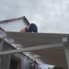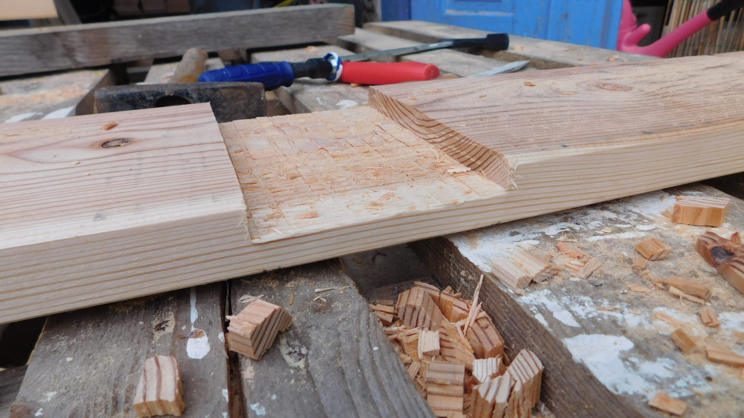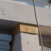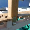 Danach wurden die vier vorderen senkrechten Pfosten verankert, das war nicht so schwer, da es hier noch nicht auf exakte Waage ankommt bzw. wenn die Berechnung richtig war, die Waage sich automatisch ergibt. Ein heikler Punkt war das Setzen der Querträger: Sie wurden einerseits direkt auf den Eckpfosten aufgesetzt, andererseits mussten sie exakt in der Waage zum hinteren Pfosten sein. Sie wurden vorne nur aufgelegt, hinten aber gleich mit starken Eckprofilen verschraubt. Der nächste wichtige Schritt war das Auflegen des oberen vorderen Querpfostens. Auch der wurde an den Enden entsprechend ausgesägt, damit hier die Ecken gut ineinandergreifen (man sieht das auf dem einen Foto recht gut, das die Eckverbindung zeigt). Erst jetzt wurden alle Träger nochmal exakt in der Waage ausgerichtet und der obere Querpfosten wurden von oben verschraubt.