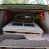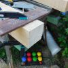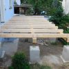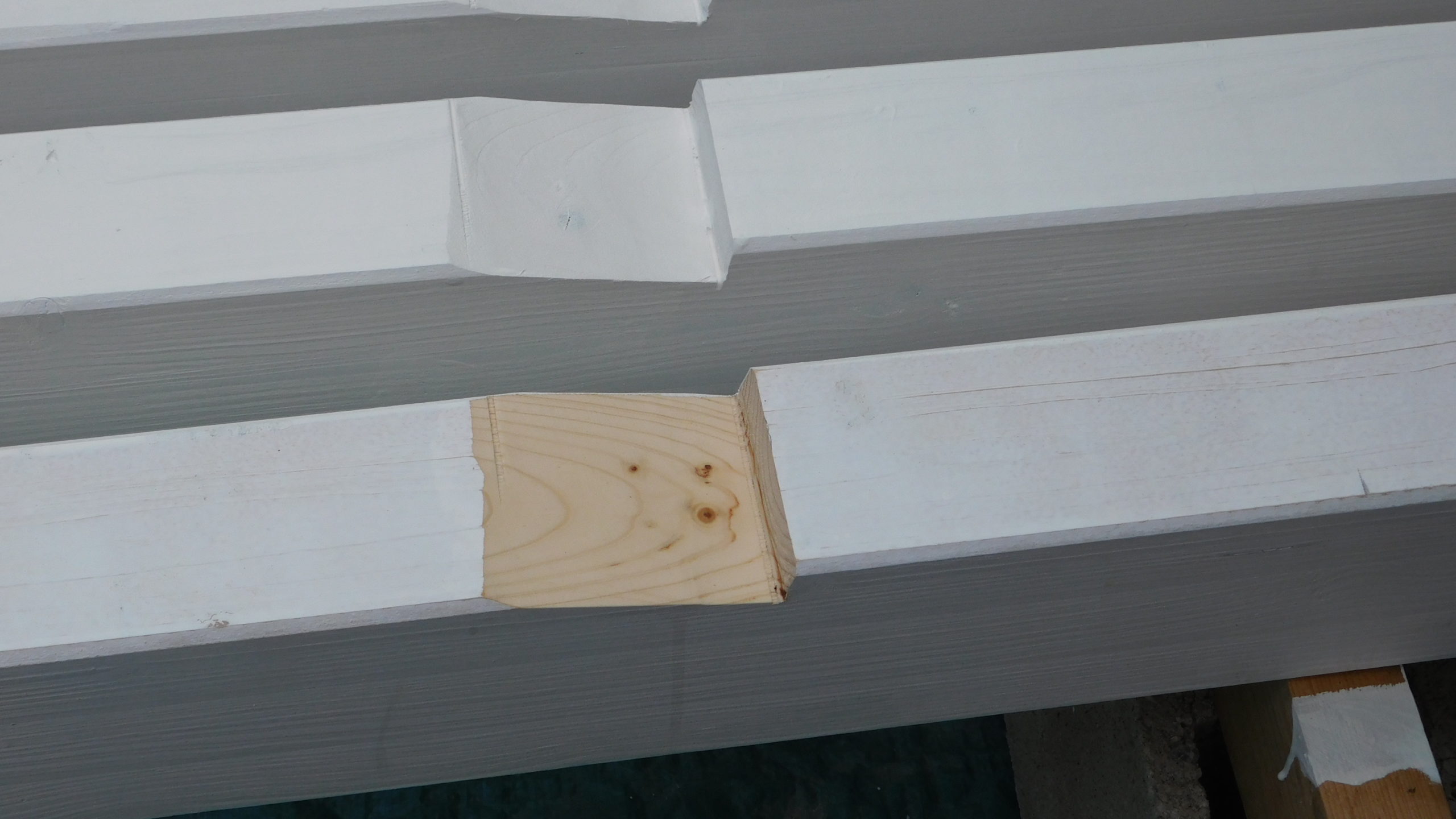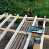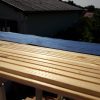 Jetzt wurden alle Querpfosten aufgelegt, mit Kork unterlegt und dann verschraubt, der Abstand wurde mittels Abstandshalter festgelegt. Letzter Schritt bevor der Boden gelegt wurde: Sämtliche Pfosten wurden rundherum mit Anti-Schimmel-Anstrich behandelt, danach mit Grundierung und danach mit zwei Schichten Decklack.