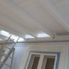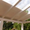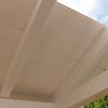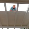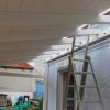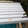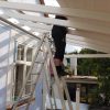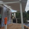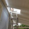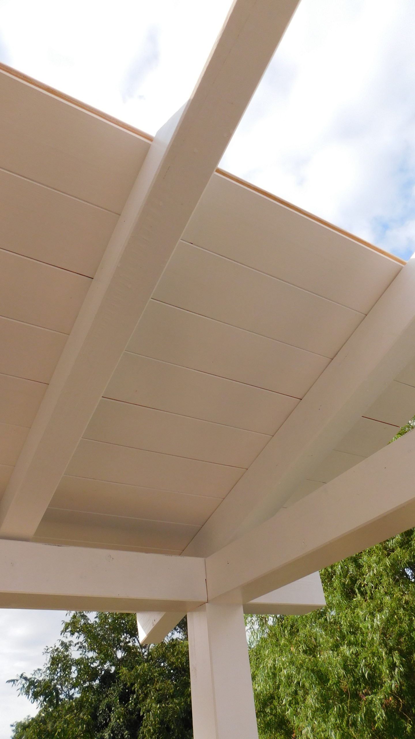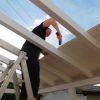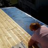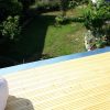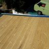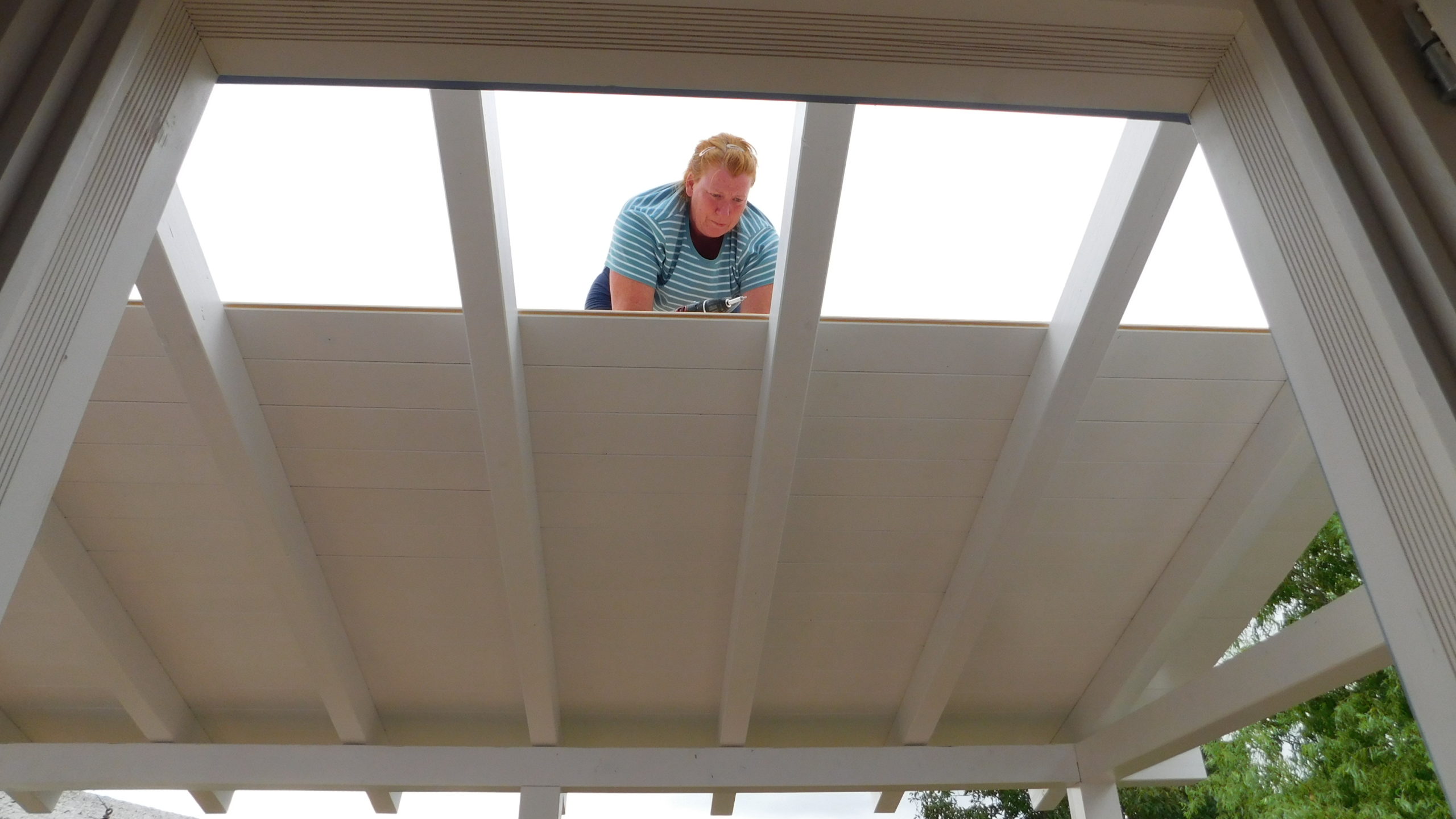 Nun konnte mit dem Decken des Daches begonnen werden. Die Nut- und Federbretter wurden von oben an die Pfosten verschraubt. Verkehrt herum natürlich, die „schöne“ Sichtseite sollte ja innen liegen, wo man sie auch sieht. Begonnen wurde wieder ganz vorne am Dach. Die ersten Bretter waren gar nicht so schwer, man montiert eines nach dem anderen. Die Bretter wurden vorher sorgfältig abgelängt, ich wollte nicht mit einer Säge in so großer Höhe arbeiten müssen, außerdem war hier ein exakter Schnitt nicht so wichtig, weil ohnehin noch die Dachbleche als Abschluss befestigt wurden.