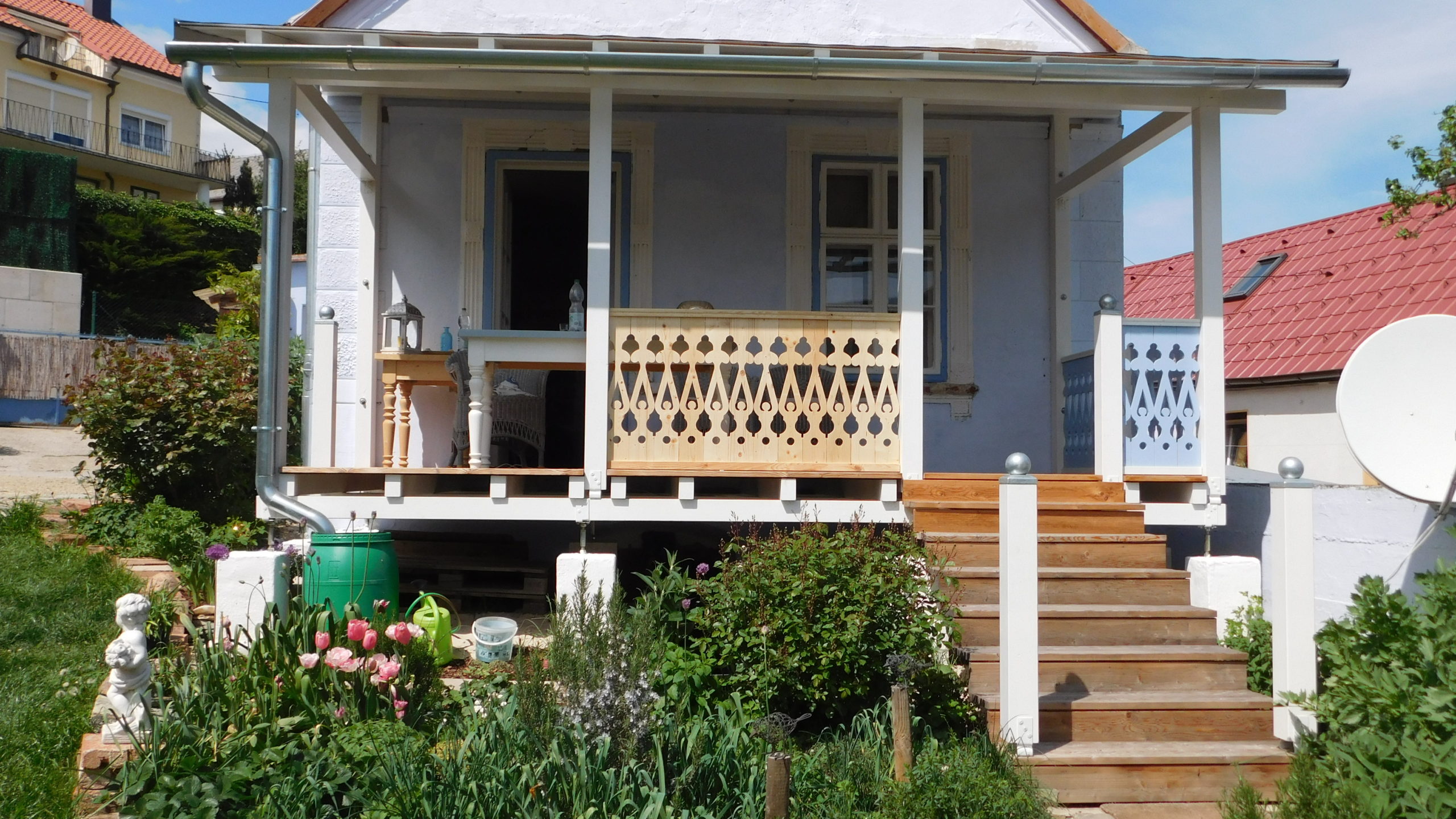 Schon immer haben mir Veranden gefallen: Die offene Bauweise, die Überdachung, ein schönes Geländer. Besonders inspiriert haben mich dabei viktorianische Holzgeländer, für mich die richtige Mischung aus Funktion und Romantik sowie das das Südstaaten-Flair, das eine Holz-Veranda vermittelt. Nach einigen Jahren in meinem Haus habe ich festgestellt, dass in den heißen, trockenen Sommern, in denen es nicht selten über 30 ° C heiß wird, eine Überdachung ein „muss“ ist. Und so habe ich begonnen, mich mit den Möglichkeiten einer Veranda zu beschäftigen.