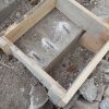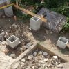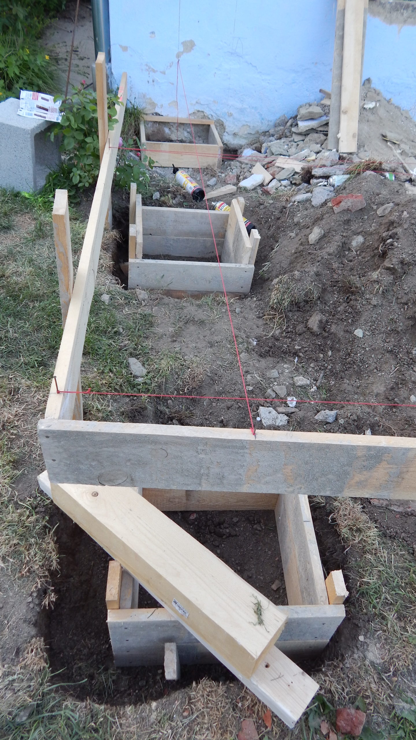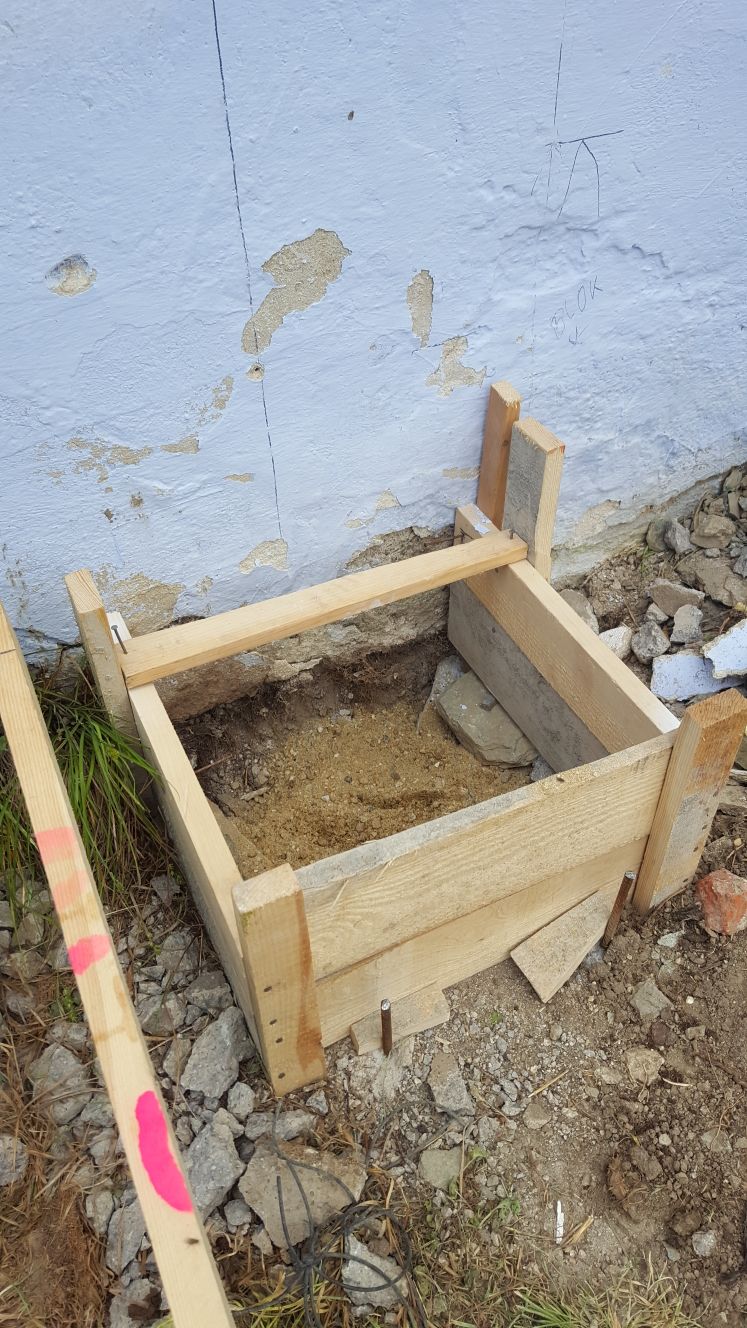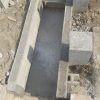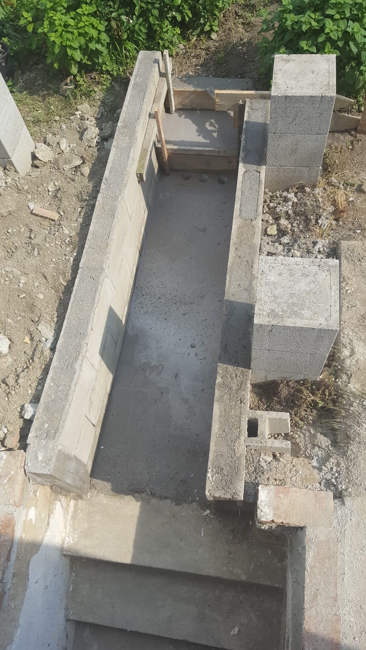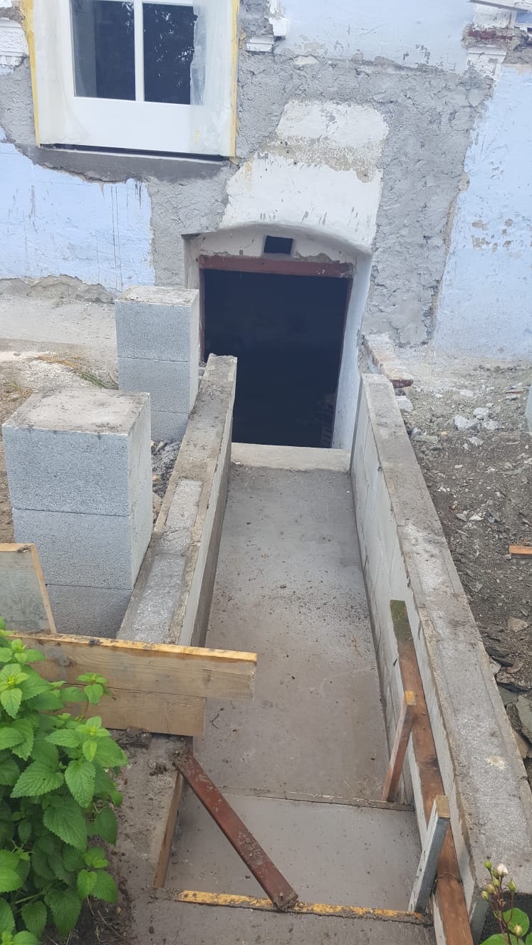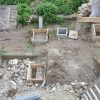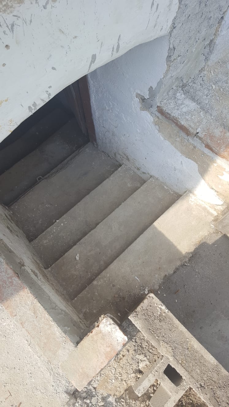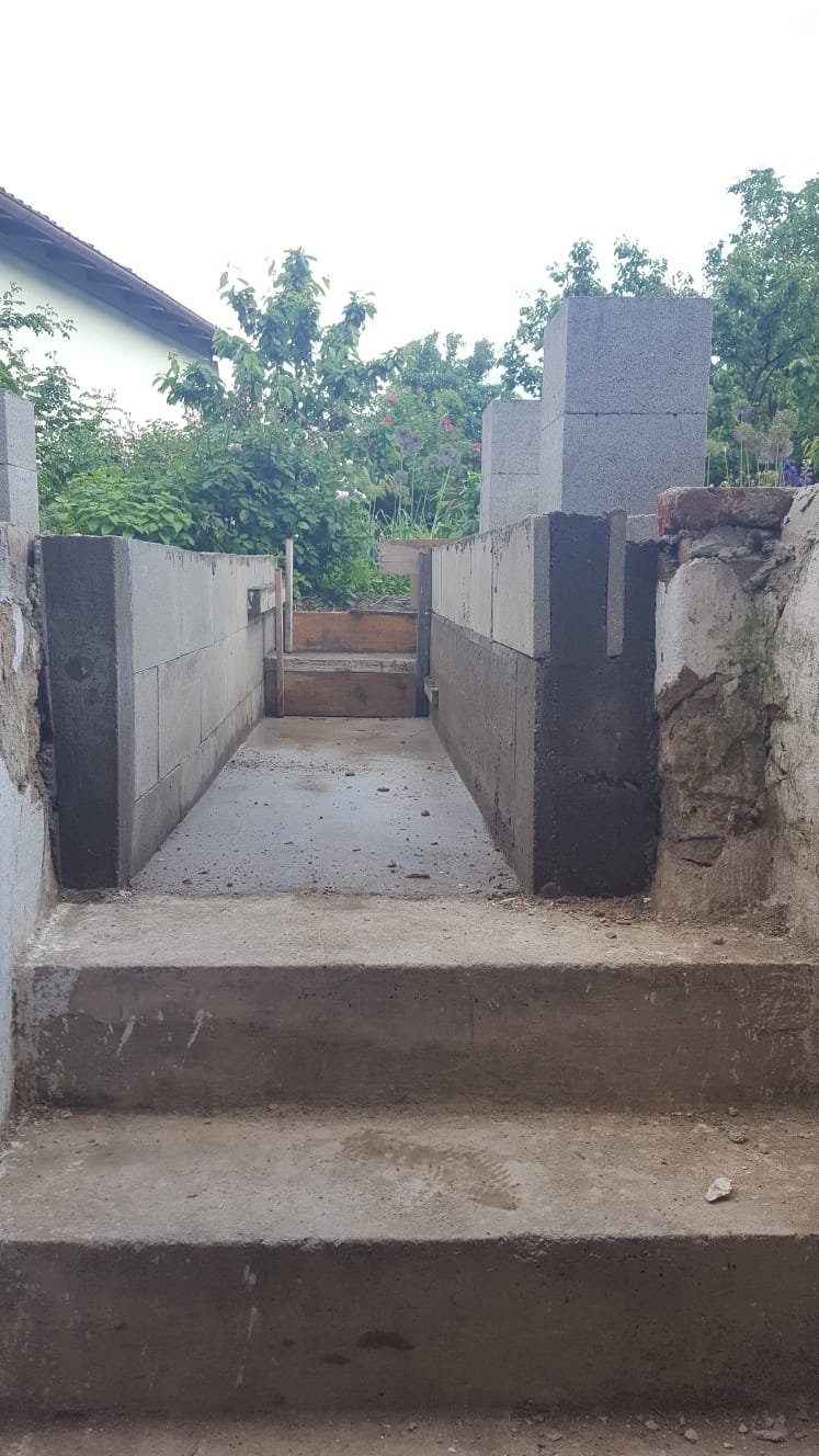 Nachdem die Punktfundamente fertiggestellt waren, wurde auch der Kellerzugang gemacht: Dafür wurde ein ca. 1,30 Meter breiter Gang ausgehoben und Seiten wurden mit Ziegeln und Eisen abgestützt. Der Boden wurde betoniert, ebenso die zwei Stufen zum Kellereingang.