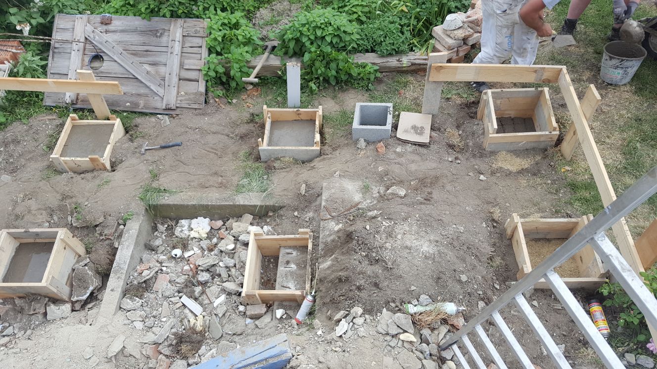 Auch für das Betonieren des Fundamentes habe ich mir Hilfe geholt, weil es mich einfach zu viel Zeit gekostet hätte, insgesamt 12 Punktfundamente auf die gleiche Höhe zu bringen. Also kam Sascha mit Nivelliergerät und hat hier geholfen. Wir haben der Einfachheit halber hier mit Schalsteinen gearbeitet, das Innenleben wurde mit Eisen verstärkt. Zwei Hoppalas sind hier passiert: Die äußeren Fundamente wurden zu weit außen gesetzt, hier habe ich nicht berücksichtigt, dass man zumindest 20-30 cm von der Gesamtlänge der Balken abziehen muss. Deshalb sind die auf die Fundamente aufgeschraubten Balkenschuhe bei den äußeren Fundament-Sockeln nicht mittig. Etwas Ähnliches ist beim Setzen der mittleren Fundamente seitwärts passiert, auch hier wurde zunächst falsch berechnet, so das die Fundamente nicht exakt mittig sind, sondern um 5 cm versetzt. Bei der nächsten Veranda weiß ich das dann 😉 Es hat sich als Top-Entscheidung erwiesen, hier auf höhenverstellbare Balkenschuhe zu setzen, da trotz Nivelliergerät zur exakten Höhe zwei der Fundamente in der Höhe nicht gepasst haben. War aber letztlich kein Problem.