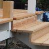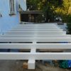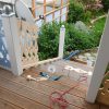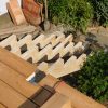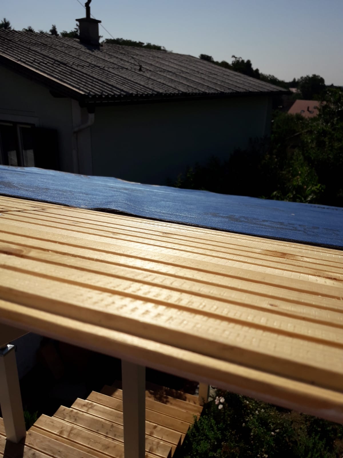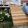 Die Unterkonstruktion der Treppe wurde mit Winkeln direkt an der Veranda befestigt. Natürlich wie immer mit diversen Wasserwaagen gearbeitet, um sicher zu stellen, dass sie Treppe nach allen Richtungen in der Waage war. Danach wurde die Treppe mit Terrassendielen verkleidet, erst die Stufen, danach die Sichtbretter. Die letzte Stufe war ein bisschen heikel, weil dort die Sichtverkleidung direkt auf die Unterkonstruktion der Terrasse traf. Hier habe ich an der Rückseite der Verkleidung jeweils den benötigten Platz ausgefräst. Insgesamt war auch das ein zwar arbeitsintensiver, aber nicht allzu schwerer Arbeitsschritt. Die Treppe wurde während des Bauens wie alles andere mit Anti-Schimmel, Grundierung und zwei Lackschichten bedacht.