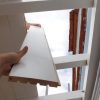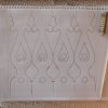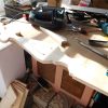Das Muster für das Geländer habe ich selbst entworfen. Ich habe mich dabei von alten Geländern inspirieren lassen. Muster finden sich unter dem Namen „porch baluster“ in Kombination mit „victorian“. Hätte es bei uns hier einen Lieferanten gegegeben, ich hätte das mit Sicherheit machen lassen. So aber gab es vernünftige Lieferanten nur in den USA und da wäre die Verschiffung einfach zu teuer gewesen. Also war selber machen angesagt. Zuerst habe ich nach meinem Entwurf eine Schablone gefertigt aus dickem Karton mit Folie überklebt. Die Schablone sollte ja über 100 Geländerteile überstehen.