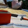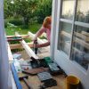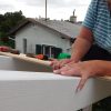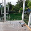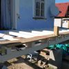 Die Dielen wurden unter Zuhilfenahme einer Schablone vorgebohrt, mit etwas Übung geht das sicher auch „Free-Style“. Die Dielen wurden mit geeigneten Untersetzern aus Kunststoff, die gleichzeitig auch als Abstandshalter dienen, unterlegt. Zuletzt wurde durch Diele und Abstandshalter verschraubt. Die letzte Diele direkt am Haus war ein Stückwerk, weil die Hausmauer nicht gerade war. Die Berechnung für die künftige Höhe des Bodens war perfekt, das hat sich aber erst ein Jahr später bei der Erneuerung des Bodens im Wohnzimmer gezeigt. Jetzt konnte man bereits den ersten Frühstückskaffee auf der Veranda genießen. Insgesamt lässt sich sagen: Das war der einfachste Teil des Verandabaus.