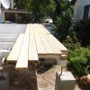 Für die gesamte Konstruktion mussten die Pfosten erst in der korrekten Länge abgelängt werden. Ich habe das Holz (hohe Qualität, günstig) direkt beim Holzwerk geordert und natürlich vereinbart, dass die Pfosten in der richtigen Länge abgelängt werden. Und dann stand da vor meiner Tür dieser riesige LKW mit 12 – 14 Meter langen Pfosten. Ich habe den LKW zurück zum Werk geschickt und gesagt: Bitte ablängen wie besprochen. Der LKW kam wieder und ich habe nach dem Abladen festgestellt, dass nur grob mit der Motorsäge abgelängt worden war, von Präszisisonsschnitten keine Spur. Also mussten erst sämtliche Pfosten korrekt gemessen und abgelängt werden. Wieder einmal hat die Bosch-Pendelhub-Säge hier ganze Arbeit geleistet. Versuche davor mit einer eigens dafür angeschafften Handkreissäge scheiterten, weil man damit nicht die ganze Tiefe der 12 cm durchsägen konnte. Nach einigen Versuchen des Ablängens habe ich dafür eine eigene Liegefläche mit mehreren Paletten gebaut, darauf konnte man gut sägen. Zu zweit war hier doch einiges leichter. Ein Stolperstein war die Frage, wie man jene Leimbinder verarbeitet, die quer liegen: So, dass die Bindungen hochkantig stehen oder so, dass man die Bindungen quer liegen hat? Die Profis vom Holzwerk haben hier empfohlen, die Leimbinder so zu verarbeiten, dass die Bindungen quer zu liegen kommen (man also von der Seite aus die drei Schichten sehen kann).