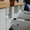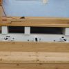 Nun fehlte nur noch der letzten Schritt: Der hintere Querpfosten, der wieder vorgebohrt wurde. Da zu diesem Zeitpunkt die Konstruktion schon steht, muss man den Balken nur einmal hochstemmen und kann ihn dann bereits auf den Querbalken ablegen, während man die Löcher für die Siebhülsen bohrt. Im Gegensatz zum unteren Querbalken, der uns weiße Haare beschwert hat, war der obere Querbalken recht rasch und sauber in der Wand. Ein bissl korrigieren mussten wir, da der vorhandene Stuck nicht gerade war und daher die beiden hinteren Pfosten erhöht werden mussten. Da hier aber das Gewicht von oben wirkt, ist das problemlos möglich.